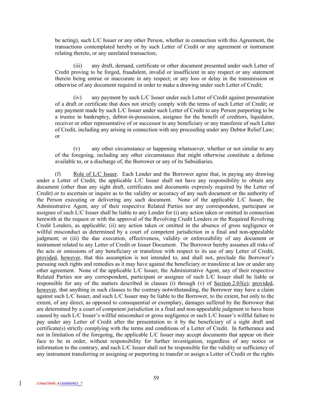 be acting), such L/C Issuer or any other Person, whether in connection with this Agreement, the transactions contemplated hereby or by such Letter of Credit or any agreement or instrument relating thereto, or any unrelated transaction; (iii) any draft, demand, certificate or other document presented under such Letter of Credit proving to be forged, fraudulent, invalid or insufficient in any respect or any statement therein being untrue or inaccurate in any respect; or any loss or delay in the transmission or otherwise of any document required in order to make a drawing under such Letter of Credit; (iv) any payment by such L/C Issuer under such Letter of Credit against presentation of a draft or certificate that does not strictly comply with the terms of such Letter of Credit; or any payment made by such L/C Issuer under such Letter of Credit to any Person purporting to be a trustee in bankruptcy, debtor-in-possession, assignee for the benefit of creditors, liquidator, receiver or other representative of or successor to any beneficiary or any transferee of such Letter of Credit, including any arising in connection with any proceeding under any Debtor Relief Law; or (v) any other circumstance or happening whatsoever, whether or not similar to any of the foregoing, including any other circumstance that might otherwise constitute a defense available to, or a discharge of, the Borrower or any of its Subsidiaries. (f) Role of L/C Issuer. Each Lender and the Borrower agree that, in paying any drawing under a Letter of Credit, the applicable L/C Issuer shall not have any responsibility to obtain any document (other than any sight draft, certificates and documents expressly required by the Letter of Credit) or to ascertain or inquire as to the validity or accuracy of any such document or the authority of the Person executing or delivering any such document. None of the applicable L/C Issuer, the Administrative Agent, any of their respective Related Parties nor any correspondent, participant or assignee of such L/C Issuer shall be liable to any Lender for (i) any action taken or omitted in connection herewith at the request or with the approval of the Revolving Credit Lenders or the Required Revolving Credit Lenders, as applicable; (ii) any action taken or omitted in the absence of gross negligence or willful misconduct as determined by a court of competent jurisdiction in a final and non-appealable judgment; or (iii) the due execution, effectiveness, validity or enforceability of any document or instrument related to any Letter of Credit or Issuer Document. The Borrower hereby assumes all risks of the acts or omissions of any beneficiary or transferee with respect to its use of any Letter of Credit; provided, however, that this assumption is not intended to, and shall not, preclude the Borrower’s pursuing such rights and remedies as it may have against the beneficiary or transferee at law or under any other agreement. None of the applicable L/C Issuer, the Administrative Agent, any of their respective Related Parties nor any correspondent, participant or assignee of such L/C Issuer shall be liable or responsible for any of the matters described in clauses (i) through (v) of Section 2.03(e); provided, however, that anything in such clauses to the contrary notwithstanding, the Borrower may have a claim against such L/C Issuer, and such L/C Issuer may be liable to the Borrower, to the extent, but only to the extent, of any direct, as opposed to consequential or exemplary, damages suffered by the Borrower that are determined by a court of competent jurisdiction in a final and non-appealable judgment to have been caused by such L/C Issuer’s willful misconduct or gross negligence or such L/C Issuer’s willful failure to pay under any Letter of Credit after the presentation to it by the beneficiary of a sight draft and certificate(s) strictly complying with the terms and conditions of a Letter of Credit. In furtherance and not in limitation of the foregoing, the applicable L/C Issuer may accept documents that appear on their face to be in order, without responsibility for further investigation, regardless of any notice or information to the contrary, and such L/C Issuer shall not be responsible for the validity or sufficiency of any instrument transferring or assigning or purporting to transfer or assign a Letter of Credit or the rights 59 176657895_8184986903_7