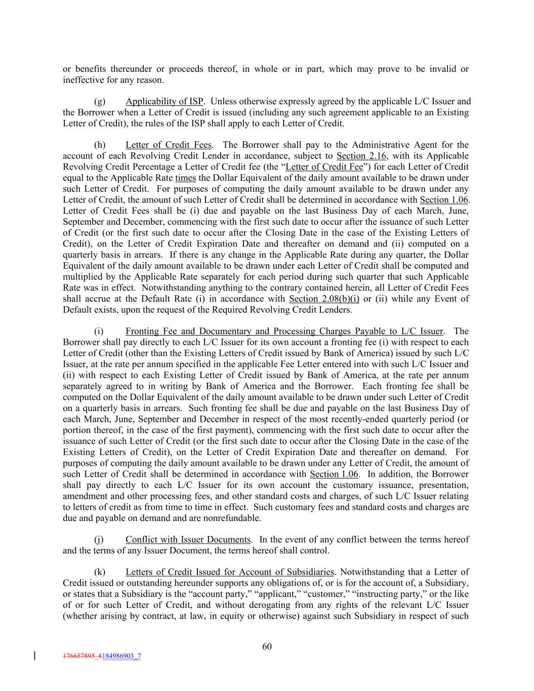 or benefits thereunder or proceeds thereof, in whole or in part, which may prove to be invalid or ineffective for any reason. (g) Applicability of ISP. Unless otherwise expressly agreed by the applicable L/C Issuer and the Borrower when a Letter of Credit is issued (including any such agreement applicable to an Existing Letter of Credit), the rules of the ISP shall apply to each Letter of Credit. (h) Letter of Credit Fees. The Borrower shall pay to the Administrative Agent for the account of each Revolving Credit Lender in accordance, subject to Section 2.16, with its Applicable Revolving Credit Percentage a Letter of Credit fee (the “Letter of Credit Fee”) for each Letter of Credit equal to the Applicable Rate times the Dollar Equivalent of the daily amount available to be drawn under such Letter of Credit. For purposes of computing the daily amount available to be drawn under any Letter of Credit, the amount of such Letter of Credit shall be determined in accordance with Section 1.06. Letter of Credit Fees shall be (i) due and payable on the last Business Day of each March, June, September and December, commencing with the first such date to occur after the issuance of such Letter of Credit (or the first such date to occur after the Closing Date in the case of the Existing Letters of Credit), on the Letter of Credit Expiration Date and thereafter on demand and (ii) computed on a quarterly basis in arrears. If there is any change in the Applicable Rate during any quarter, the Dollar Equivalent of the daily amount available to be drawn under each Letter of Credit shall be computed and multiplied by the Applicable Rate separately for each period during such quarter that such Applicable Rate was in effect. Notwithstanding anything to the contrary contained herein, all Letter of Credit Fees shall accrue at the Default Rate (i) in accordance with Section 2.08(b)(i) or (ii) while any Event of Default exists, upon the request of the Required Revolving Credit Lenders. (i) Fronting Fee and Documentary and Processing Charges Payable to L/C Issuer. The Borrower shall pay directly to each L/C Issuer for its own account a fronting fee (i) with respect to each Letter of Credit (other than the Existing Letters of Credit issued by Bank of America) issued by such L/C Issuer, at the rate per annum specified in the applicable Fee Letter entered into with such L/C Issuer and (ii) with respect to each Existing Letter of Credit issued by Bank of America, at the rate per annum separately agreed to in writing by Bank of America and the Borrower. Each fronting fee shall be computed on the Dollar Equivalent of the daily amount available to be drawn under such Letter of Credit on a quarterly basis in arrears. Such fronting fee shall be due and payable on the last Business Day of each March, June, September and December in respect of the most recently-ended quarterly period (or portion thereof, in the case of the first payment), commencing with the first such date to occur after the issuance of such Letter of Credit (or the first such date to occur after the Closing Date in the case of the Existing Letters of Credit), on the Letter of Credit Expiration Date and thereafter on demand. For purposes of computing the daily amount available to be drawn under any Letter of Credit, the amount of such Letter of Credit shall be determined in accordance with Section 1.06. In addition, the Borrower shall pay directly to each L/C Issuer for its own account the customary issuance, presentation, amendment and other processing fees, and other standard costs and charges, of such L/C Issuer relating to letters of credit as from time to time in effect. Such customary fees and standard costs and charges are due and payable on demand and are nonrefundable. (j) Conflict with Issuer Documents. In the event of any conflict between the terms hereof and the terms of any Issuer Document, the terms hereof shall control. (k) Letters of Credit Issued for Account of Subsidiaries. Notwithstanding that a Letter of Credit issued or outstanding hereunder supports any obligations of, or is for the account of, a Subsidiary, or states that a Subsidiary is the “account party,” “applicant,” “customer,” “instructing party,” or the like of or for such Letter of Credit, and without derogating from any rights of the relevant L/C Issuer (whether arising by contract, at law, in equity or otherwise) against such Subsidiary in respect of such 60 176657895_8184986903_7
