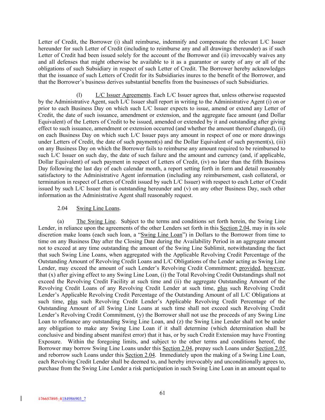 Letter of Credit, the Borrower (i) shall reimburse, indemnify and compensate the relevant L/C Issuer hereunder for such Letter of Credit (including to reimburse any and all drawings thereunder) as if such Letter of Credit had been issued solely for the account of the Borrower and (ii) irrevocably waives any and all defenses that might otherwise be available to it as a guarantor or surety of any or all of the obligations of such Subsidiary in respect of such Letter of Credit. The Borrower hereby acknowledges that the issuance of such Letters of Credit for its Subsidiaries inures to the benefit of the Borrower, and that the Borrower’s business derives substantial benefits from the businesses of such Subsidiaries. (l) L/C Issuer Agreements. Each L/C Issuer agrees that, unless otherwise requested by the Administrative Agent, such L/C Issuer shall report in writing to the Administrative Agent (i) on or prior to each Business Day on which such L/C Issuer expects to issue, amend or extend any Letter of Credit, the date of such issuance, amendment or extension, and the aggregate face amount (and Dollar Equivalent) of the Letters of Credit to be issued, amended or extended by it and outstanding after giving effect to such issuance, amendment or extension occurred (and whether the amount thereof changed), (ii) on each Business Day on which such L/C Issuer pays any amount in respect of one or more drawings under Letters of Credit, the date of such payment(s) and the Dollar Equivalent of such payment(s), (iii) on any Business Day on which the Borrower fails to reimburse any amount required to be reimbursed to such L/C Issuer on such day, the date of such failure and the amount and currency (and, if applicable, Dollar Equivalent) of such payment in respect of Letters of Credit, (iv) no later than the fifth Business Day following the last day of each calendar month, a report setting forth in form and detail reasonably satisfactory to the Administrative Agent information (including any reimbursement, cash collateral, or termination in respect of Letters of Credit issued by such L/C Issuer) with respect to each Letter of Credit issued by such L/C Issuer that is outstanding hereunder and (v) on any other Business Day, such other information as the Administrative Agent shall reasonably request. 2.04 Swing Line Loans. (a) The Swing Line. Subject to the terms and conditions set forth herein, the Swing Line Lender, in reliance upon the agreements of the other Lenders set forth in this Section 2.04, may in its sole discretion make loans (each such loan, a “Swing Line Loan”) in Dollars to the Borrower from time to time on any Business Day after the Closing Date during the Availability Period in an aggregate amount not to exceed at any time outstanding the amount of the Swing Line Sublimit, notwithstanding the fact that such Swing Line Loans, when aggregated with the Applicable Revolving Credit Percentage of the Outstanding Amount of Revolving Credit Loans and L/C Obligations of the Lender acting as Swing Line Lender, may exceed the amount of such Lender’s Revolving Credit Commitment; provided, however, that (x) after giving effect to any Swing Line Loan, (i) the Total Revolving Credit Outstandings shall not exceed the Revolving Credit Facility at such time and (ii) the aggregate Outstanding Amount of the Revolving Credit Loans of any Revolving Credit Lender at such time, plus such Revolving Credit Lender’s Applicable Revolving Credit Percentage of the Outstanding Amount of all L/C Obligations at such time, plus such Revolving Credit Lender’s Applicable Revolving Credit Percentage of the Outstanding Amount of all Swing Line Loans at such time shall not exceed such Revolving Credit Lender’s Revolving Credit Commitment, (y) the Borrower shall not use the proceeds of any Swing Line Loan to refinance any outstanding Swing Line Loan, and (z) the Swing Line Lender shall not be under any obligation to make any Swing Line Loan if it shall determine (which determination shall be conclusive and binding absent manifest error) that it has, or by such Credit Extension may have Fronting Exposure. Within the foregoing limits, and subject to the other terms and conditions hereof, the Borrower may borrow Swing Line Loans under this Section 2.04, prepay such Loans under Section 2.05 and reborrow such Loans under this Section 2.04. Immediately upon the making of a Swing Line Loan, each Revolving Credit Lender shall be deemed to, and hereby irrevocably and unconditionally agrees to, purchase from the Swing Line Lender a risk participation in such Swing Line Loan in an amount equal to 61 176657895_8184986903_7
