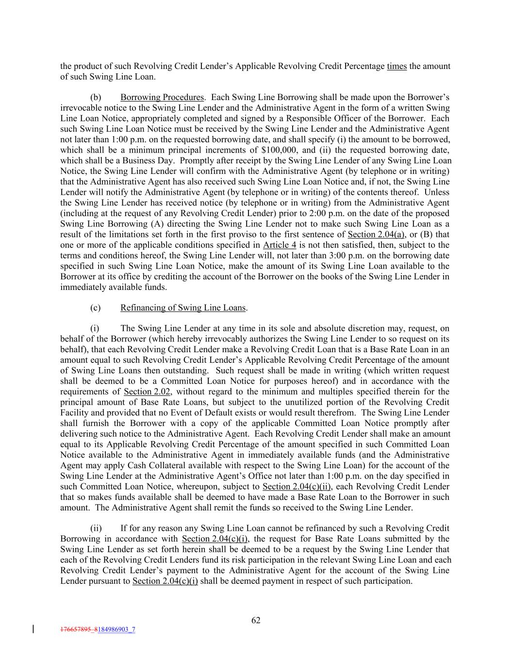 the product of such Revolving Credit Lender’s Applicable Revolving Credit Percentage times the amount of such Swing Line Loan. (b) Borrowing Procedures. Each Swing Line Borrowing shall be made upon the Borrower’s irrevocable notice to the Swing Line Lender and the Administrative Agent in the form of a written Swing Line Loan Notice, appropriately completed and signed by a Responsible Officer of the Borrower. Each such Swing Line Loan Notice must be received by the Swing Line Lender and the Administrative Agent not later than 1:00 p.m. on the requested borrowing date, and shall specify (i) the amount to be borrowed, which shall be a minimum principal increments of $100,000, and (ii) the requested borrowing date, which shall be a Business Day. Promptly after receipt by the Swing Line Lender of any Swing Line Loan Notice, the Swing Line Lender will confirm with the Administrative Agent (by telephone or in writing) that the Administrative Agent has also received such Swing Line Loan Notice and, if not, the Swing Line Lender will notify the Administrative Agent (by telephone or in writing) of the contents thereof. Unless the Swing Line Lender has received notice (by telephone or in writing) from the Administrative Agent (including at the request of any Revolving Credit Lender) prior to 2:00 p.m. on the date of the proposed Swing Line Borrowing (A) directing the Swing Line Lender not to make such Swing Line Loan as a result of the limitations set forth in the first proviso to the first sentence of Section 2.04(a), or (B) that one or more of the applicable conditions specified in Article 4 is not then satisfied, then, subject to the terms and conditions hereof, the Swing Line Lender will, not later than 3:00 p.m. on the borrowing date specified in such Swing Line Loan Notice, make the amount of its Swing Line Loan available to the Borrower at its office by crediting the account of the Borrower on the books of the Swing Line Lender in immediately available funds. (c) Refinancing of Swing Line Loans. (i) The Swing Line Lender at any time in its sole and absolute discretion may, request, on behalf of the Borrower (which hereby irrevocably authorizes the Swing Line Lender to so request on its behalf), that each Revolving Credit Lender make a Revolving Credit Loan that is a Base Rate Loan in an amount equal to such Revolving Credit Lender’s Applicable Revolving Credit Percentage of the amount of Swing Line Loans then outstanding. Such request shall be made in writing (which written request shall be deemed to be a Committed Loan Notice for purposes hereof) and in accordance with the requirements of Section 2.02, without regard to the minimum and multiples specified therein for the principal amount of Base Rate Loans, but subject to the unutilized portion of the Revolving Credit Facility and provided that no Event of Default exists or would result therefrom. The Swing Line Lender shall furnish the Borrower with a copy of the applicable Committed Loan Notice promptly after delivering such notice to the Administrative Agent. Each Revolving Credit Lender shall make an amount equal to its Applicable Revolving Credit Percentage of the amount specified in such Committed Loan Notice available to the Administrative Agent in immediately available funds (and the Administrative Agent may apply Cash Collateral available with respect to the Swing Line Loan) for the account of the Swing Line Lender at the Administrative Agent’s Office not later than 1:00 p.m. on the day specified in such Committed Loan Notice, whereupon, subject to Section 2.04(c)(ii), each Revolving Credit Lender that so makes funds available shall be deemed to have made a Base Rate Loan to the Borrower in such amount. The Administrative Agent shall remit the funds so received to the Swing Line Lender. (ii) If for any reason any Swing Line Loan cannot be refinanced by such a Revolving Credit Borrowing in accordance with Section 2.04(c)(i), the request for Base Rate Loans submitted by the Swing Line Lender as set forth herein shall be deemed to be a request by the Swing Line Lender that each of the Revolving Credit Lenders fund its risk participation in the relevant Swing Line Loan and each Revolving Credit Lender’s payment to the Administrative Agent for the account of the Swing Line Lender pursuant to Section 2.04(c)(i) shall be deemed payment in respect of such participation. 62 176657895_8184986903_7