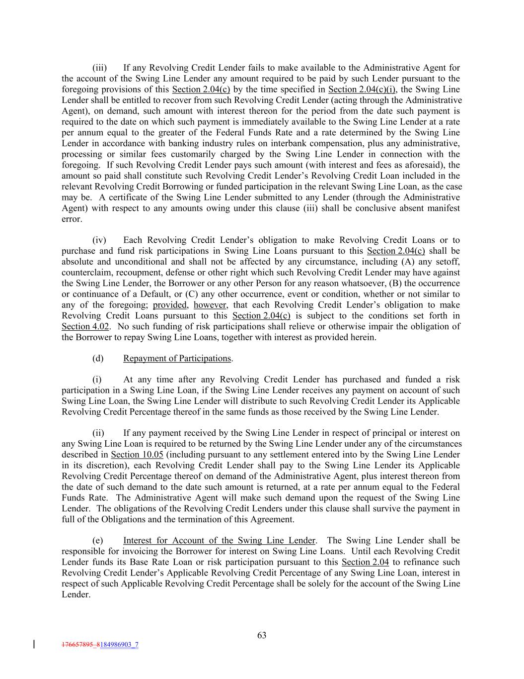 (iii) If any Revolving Credit Lender fails to make available to the Administrative Agent for the account of the Swing Line Lender any amount required to be paid by such Lender pursuant to the foregoing provisions of this Section 2.04(c) by the time specified in Section 2.04(c)(i), the Swing Line Lender shall be entitled to recover from such Revolving Credit Lender (acting through the Administrative Agent), on demand, such amount with interest thereon for the period from the date such payment is required to the date on which such payment is immediately available to the Swing Line Lender at a rate per annum equal to the greater of the Federal Funds Rate and a rate determined by the Swing Line Lender in accordance with banking industry rules on interbank compensation, plus any administrative, processing or similar fees customarily charged by the Swing Line Lender in connection with the foregoing. If such Revolving Credit Lender pays such amount (with interest and fees as aforesaid), the amount so paid shall constitute such Revolving Credit Lender’s Revolving Credit Loan included in the relevant Revolving Credit Borrowing or funded participation in the relevant Swing Line Loan, as the case may be. A certificate of the Swing Line Lender submitted to any Lender (through the Administrative Agent) with respect to any amounts owing under this clause (iii) shall be conclusive absent manifest error. (iv) Each Revolving Credit Lender’s obligation to make Revolving Credit Loans or to purchase and fund risk participations in Swing Line Loans pursuant to this Section 2.04(c) shall be absolute and unconditional and shall not be affected by any circumstance, including (A) any setoff, counterclaim, recoupment, defense or other right which such Revolving Credit Lender may have against the Swing Line Lender, the Borrower or any other Person for any reason whatsoever, (B) the occurrence or continuance of a Default, or (C) any other occurrence, event or condition, whether or not similar to any of the foregoing; provided, however, that each Revolving Credit Lender’s obligation to make Revolving Credit Loans pursuant to this Section 2.04(c) is subject to the conditions set forth in Section 4.02. No such funding of risk participations shall relieve or otherwise impair the obligation of the Borrower to repay Swing Line Loans, together with interest as provided herein. (d) Repayment of Participations. (i) At any time after any Revolving Credit Lender has purchased and funded a risk participation in a Swing Line Loan, if the Swing Line Lender receives any payment on account of such Swing Line Loan, the Swing Line Lender will distribute to such Revolving Credit Lender its Applicable Revolving Credit Percentage thereof in the same funds as those received by the Swing Line Lender. (ii) If any payment received by the Swing Line Lender in respect of principal or interest on any Swing Line Loan is required to be returned by the Swing Line Lender under any of the circumstances described in Section 10.05 (including pursuant to any settlement entered into by the Swing Line Lender in its discretion), each Revolving Credit Lender shall pay to the Swing Line Lender its Applicable Revolving Credit Percentage thereof on demand of the Administrative Agent, plus interest thereon from the date of such demand to the date such amount is returned, at a rate per annum equal to the Federal Funds Rate. The Administrative Agent will make such demand upon the request of the Swing Line Lender. The obligations of the Revolving Credit Lenders under this clause shall survive the payment in full of the Obligations and the termination of this Agreement. (e) Interest for Account of the Swing Line Lender. The Swing Line Lender shall be responsible for invoicing the Borrower for interest on Swing Line Loans. Until each Revolving Credit Lender funds its Base Rate Loan or risk participation pursuant to this Section 2.04 to refinance such Revolving Credit Lender’s Applicable Revolving Credit Percentage of any Swing Line Loan, interest in respect of such Applicable Revolving Credit Percentage shall be solely for the account of the Swing Line Lender. 63 176657895_8184986903_7