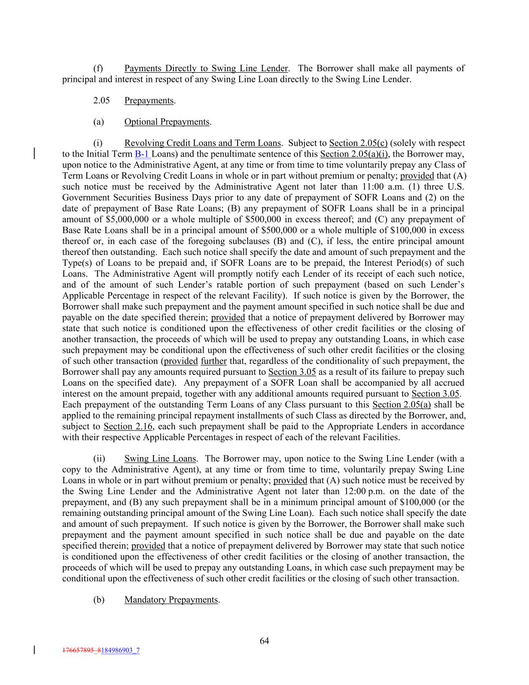 (f) Payments Directly to Swing Line Lender. The Borrower shall make all payments of principal and interest in respect of any Swing Line Loan directly to the Swing Line Lender. 2.05 Prepayments. (a) Optional Prepayments. (i) Revolving Credit Loans and Term Loans. Subject to Section 2.05(c) (solely with respect to the Initial Term B-1 Loans) and the penultimate sentence of this Section 2.05(a)(i), the Borrower may, upon notice to the Administrative Agent, at any time or from time to time voluntarily prepay any Class of Term Loans or Revolving Credit Loans in whole or in part without premium or penalty; provided that (A) such notice must be received by the Administrative Agent not later than 11:00 a.m. (1) three U.S. Government Securities Business Days prior to any date of prepayment of SOFR Loans and (2) on the date of prepayment of Base Rate Loans; (B) any prepayment of SOFR Loans shall be in a principal amount of $5,000,000 or a whole multiple of $500,000 in excess thereof; and (C) any prepayment of Base Rate Loans shall be in a principal amount of $500,000 or a whole multiple of $100,000 in excess thereof or, in each case of the foregoing subclauses (B) and (C), if less, the entire principal amount thereof then outstanding. Each such notice shall specify the date and amount of such prepayment and the Type(s) of Loans to be prepaid and, if SOFR Loans are to be prepaid, the Interest Period(s) of such Loans. The Administrative Agent will promptly notify each Lender of its receipt of each such notice, and of the amount of such Lender’s ratable portion of such prepayment (based on such Lender’s Applicable Percentage in respect of the relevant Facility). If such notice is given by the Borrower, the Borrower shall make such prepayment and the payment amount specified in such notice shall be due and payable on the date specified therein; provided that a notice of prepayment delivered by Borrower may state that such notice is conditioned upon the effectiveness of other credit facilities or the closing of another transaction, the proceeds of which will be used to prepay any outstanding Loans, in which case such prepayment may be conditional upon the effectiveness of such other credit facilities or the closing of such other transaction (provided further that, regardless of the conditionality of such prepayment, the Borrower shall pay any amounts required pursuant to Section 3.05 as a result of its failure to prepay such Loans on the specified date). Any prepayment of a SOFR Loan shall be accompanied by all accrued interest on the amount prepaid, together with any additional amounts required pursuant to Section 3.05. Each prepayment of the outstanding Term Loans of any Class pursuant to this Section 2.05(a) shall be applied to the remaining principal repayment installments of such Class as directed by the Borrower, and, subject to Section 2.16, each such prepayment shall be paid to the Appropriate Lenders in accordance with their respective Applicable Percentages in respect of each of the relevant Facilities. (ii) Swing Line Loans. The Borrower may, upon notice to the Swing Line Lender (with a copy to the Administrative Agent), at any time or from time to time, voluntarily prepay Swing Line Loans in whole or in part without premium or penalty; provided that (A) such notice must be received by the Swing Line Lender and the Administrative Agent not later than 12:00 p.m. on the date of the prepayment, and (B) any such prepayment shall be in a minimum principal amount of $100,000 (or the remaining outstanding principal amount of the Swing Line Loan). Each such notice shall specify the date and amount of such prepayment. If such notice is given by the Borrower, the Borrower shall make such prepayment and the payment amount specified in such notice shall be due and payable on the date specified therein; provided that a notice of prepayment delivered by Borrower may state that such notice is conditioned upon the effectiveness of other credit facilities or the closing of another transaction, the proceeds of which will be used to prepay any outstanding Loans, in which case such prepayment may be conditional upon the effectiveness of such other credit facilities or the closing of such other transaction. (b) Mandatory Prepayments. 64 176657895_8184986903_7