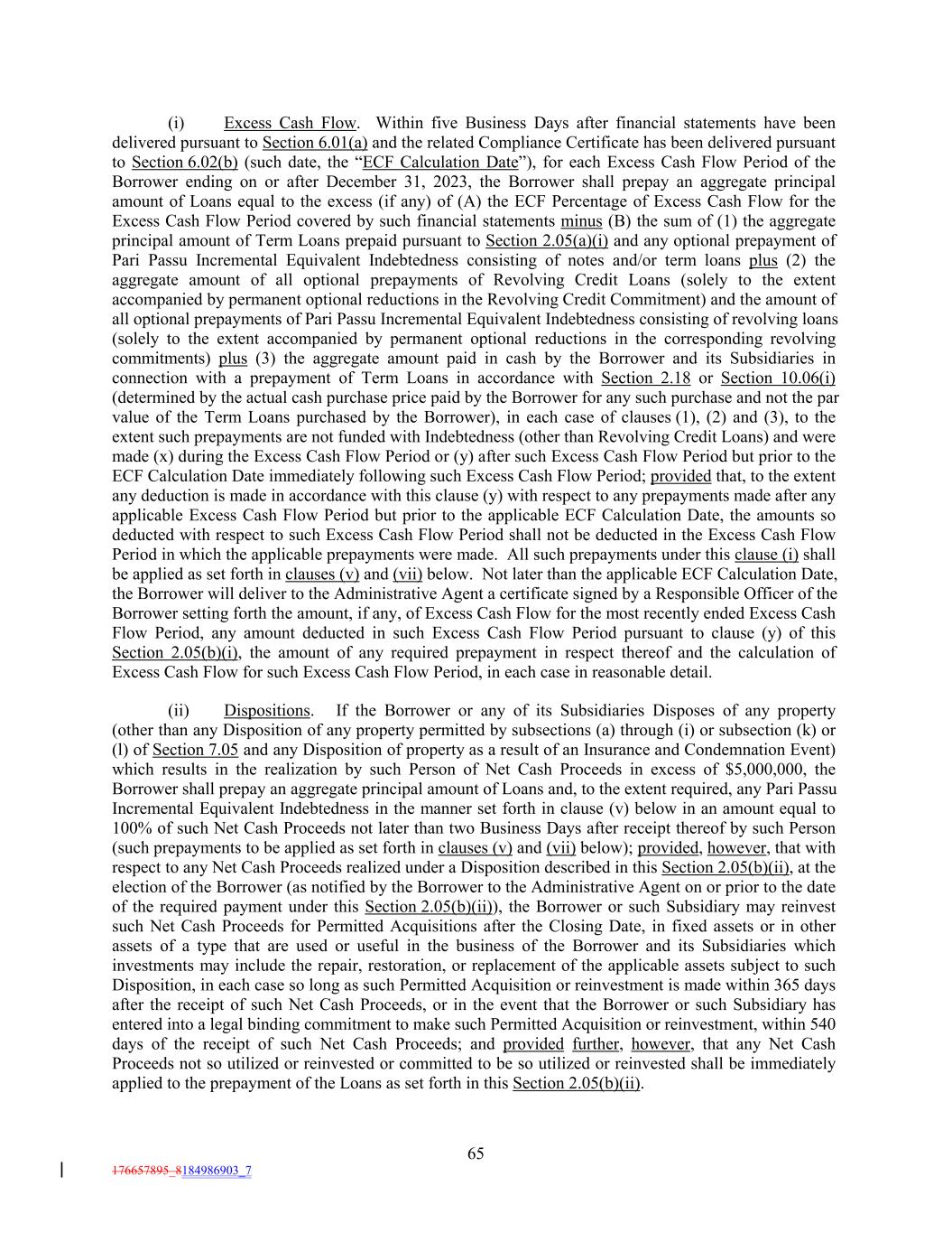(i) Excess Cash Flow. Within five Business Days after financial statements have been delivered pursuant to Section 6.01(a) and the related Compliance Certificate has been delivered pursuant to Section 6.02(b) (such date, the “ECF Calculation Date”), for each Excess Cash Flow Period of the Borrower ending on or after December 31, 2023, the Borrower shall prepay an aggregate principal amount of Loans equal to the excess (if any) of (A) the ECF Percentage of Excess Cash Flow for the Excess Cash Flow Period covered by such financial statements minus (B) the sum of (1) the aggregate principal amount of Term Loans prepaid pursuant to Section 2.05(a)(i) and any optional prepayment of Pari Passu Incremental Equivalent Indebtedness consisting of notes and/or term loans plus (2) the aggregate amount of all optional prepayments of Revolving Credit Loans (solely to the extent accompanied by permanent optional reductions in the Revolving Credit Commitment) and the amount of all optional prepayments of Pari Passu Incremental Equivalent Indebtedness consisting of revolving loans (solely to the extent accompanied by permanent optional reductions in the corresponding revolving commitments) plus (3) the aggregate amount paid in cash by the Borrower and its Subsidiaries in connection with a prepayment of Term Loans in accordance with Section 2.18 or Section 10.06(i) (determined by the actual cash purchase price paid by the Borrower for any such purchase and not the par value of the Term Loans purchased by the Borrower), in each case of clauses (1), (2) and (3), to the extent such prepayments are not funded with Indebtedness (other than Revolving Credit Loans) and were made (x) during the Excess Cash Flow Period or (y) after such Excess Cash Flow Period but prior to the ECF Calculation Date immediately following such Excess Cash Flow Period; provided that, to the extent any deduction is made in accordance with this clause (y) with respect to any prepayments made after any applicable Excess Cash Flow Period but prior to the applicable ECF Calculation Date, the amounts so deducted with respect to such Excess Cash Flow Period shall not be deducted in the Excess Cash Flow Period in which the applicable prepayments were made. All such prepayments under this clause (i) shall be applied as set forth in clauses (v) and (vii) below. Not later than the applicable ECF Calculation Date, the Borrower will deliver to the Administrative Agent a certificate signed by a Responsible Officer of the Borrower setting forth the amount, if any, of Excess Cash Flow for the most recently ended Excess Cash Flow Period, any amount deducted in such Excess Cash Flow Period pursuant to clause (y) of this Section 2.05(b)(i), the amount of any required prepayment in respect thereof and the calculation of Excess Cash Flow for such Excess Cash Flow Period, in each case in reasonable detail. (ii) Dispositions. If the Borrower or any of its Subsidiaries Disposes of any property (other than any Disposition of any property permitted by subsections (a) through (i) or subsection (k) or (l) of Section 7.05 and any Disposition of property as a result of an Insurance and Condemnation Event) which results in the realization by such Person of Net Cash Proceeds in excess of $5,000,000, the Borrower shall prepay an aggregate principal amount of Loans and, to the extent required, any Pari Passu Incremental Equivalent Indebtedness in the manner set forth in clause (v) below in an amount equal to 100% of such Net Cash Proceeds not later than two Business Days after receipt thereof by such Person (such prepayments to be applied as set forth in clauses (v) and (vii) below); provided, however, that with respect to any Net Cash Proceeds realized under a Disposition described in this Section 2.05(b)(ii), at the election of the Borrower (as notified by the Borrower to the Administrative Agent on or prior to the date of the required payment under this Section 2.05(b)(ii)), the Borrower or such Subsidiary may reinvest such Net Cash Proceeds for Permitted Acquisitions after the Closing Date, in fixed assets or in other assets of a type that are used or useful in the business of the Borrower and its Subsidiaries which investments may include the repair, restoration, or replacement of the applicable assets subject to such Disposition, in each case so long as such Permitted Acquisition or reinvestment is made within 365 days after the receipt of such Net Cash Proceeds, or in the event that the Borrower or such Subsidiary has entered into a legal binding commitment to make such Permitted Acquisition or reinvestment, within 540 days of the receipt of such Net Cash Proceeds; and provided further, however, that any Net Cash Proceeds not so utilized or reinvested or committed to be so utilized or reinvested shall be immediately applied to the prepayment of the Loans as set forth in this Section 2.05(b)(ii). 65 176657895_8184986903_7