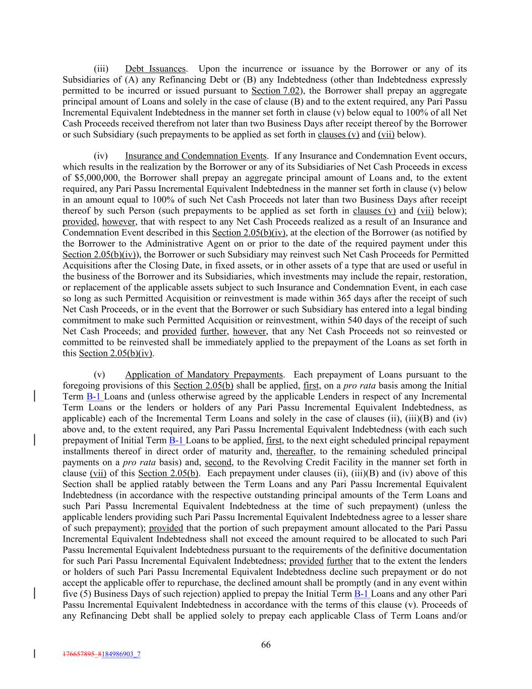 (iii) Debt Issuances. Upon the incurrence or issuance by the Borrower or any of its Subsidiaries of (A) any Refinancing Debt or (B) any Indebtedness (other than Indebtedness expressly permitted to be incurred or issued pursuant to Section 7.02), the Borrower shall prepay an aggregate principal amount of Loans and solely in the case of clause (B) and to the extent required, any Pari Passu Incremental Equivalent Indebtedness in the manner set forth in clause (v) below equal to 100% of all Net Cash Proceeds received therefrom not later than two Business Days after receipt thereof by the Borrower or such Subsidiary (such prepayments to be applied as set forth in clauses (v) and (vii) below). (iv) Insurance and Condemnation Events. If any Insurance and Condemnation Event occurs, which results in the realization by the Borrower or any of its Subsidiaries of Net Cash Proceeds in excess of $5,000,000, the Borrower shall prepay an aggregate principal amount of Loans and, to the extent required, any Pari Passu Incremental Equivalent Indebtedness in the manner set forth in clause (v) below in an amount equal to 100% of such Net Cash Proceeds not later than two Business Days after receipt thereof by such Person (such prepayments to be applied as set forth in clauses (v) and (vii) below); provided, however, that with respect to any Net Cash Proceeds realized as a result of an Insurance and Condemnation Event described in this Section 2.05(b)(iv), at the election of the Borrower (as notified by the Borrower to the Administrative Agent on or prior to the date of the required payment under this Section 2.05(b)(iv)), the Borrower or such Subsidiary may reinvest such Net Cash Proceeds for Permitted Acquisitions after the Closing Date, in fixed assets, or in other assets of a type that are used or useful in the business of the Borrower and its Subsidiaries, which investments may include the repair, restoration, or replacement of the applicable assets subject to such Insurance and Condemnation Event, in each case so long as such Permitted Acquisition or reinvestment is made within 365 days after the receipt of such Net Cash Proceeds, or in the event that the Borrower or such Subsidiary has entered into a legal binding commitment to make such Permitted Acquisition or reinvestment, within 540 days of the receipt of such Net Cash Proceeds; and provided further, however, that any Net Cash Proceeds not so reinvested or committed to be reinvested shall be immediately applied to the prepayment of the Loans as set forth in this Section 2.05(b)(iv). (v) Application of Mandatory Prepayments. Each prepayment of Loans pursuant to the foregoing provisions of this Section 2.05(b) shall be applied, first, on a pro rata basis among the Initial Term B-1 Loans and (unless otherwise agreed by the applicable Lenders in respect of any Incremental Term Loans or the lenders or holders of any Pari Passu Incremental Equivalent Indebtedness, as applicable) each of the Incremental Term Loans and solely in the case of clauses (ii), (iii)(B) and (iv) above and, to the extent required, any Pari Passu Incremental Equivalent Indebtedness (with each such prepayment of Initial Term B-1 Loans to be applied, first, to the next eight scheduled principal repayment installments thereof in direct order of maturity and, thereafter, to the remaining scheduled principal payments on a pro rata basis) and, second, to the Revolving Credit Facility in the manner set forth in clause (vii) of this Section 2.05(b). Each prepayment under clauses (ii), (iii)(B) and (iv) above of this Section shall be applied ratably between the Term Loans and any Pari Passu Incremental Equivalent Indebtedness (in accordance with the respective outstanding principal amounts of the Term Loans and such Pari Passu Incremental Equivalent Indebtedness at the time of such prepayment) (unless the applicable lenders providing such Pari Passu Incremental Equivalent Indebtedness agree to a lesser share of such prepayment); provided that the portion of such prepayment amount allocated to the Pari Passu Incremental Equivalent Indebtedness shall not exceed the amount required to be allocated to such Pari Passu Incremental Equivalent Indebtedness pursuant to the requirements of the definitive documentation for such Pari Passu Incremental Equivalent Indebtedness; provided further that to the extent the lenders or holders of such Pari Passu Incremental Equivalent Indebtedness decline such prepayment or do not accept the applicable offer to repurchase, the declined amount shall be promptly (and in any event within five (5) Business Days of such rejection) applied to prepay the Initial Term B-1 Loans and any other Pari Passu Incremental Equivalent Indebtedness in accordance with the terms of this clause (v). Proceeds of any Refinancing Debt shall be applied solely to prepay each applicable Class of Term Loans and/or 66 176657895_8184986903_7