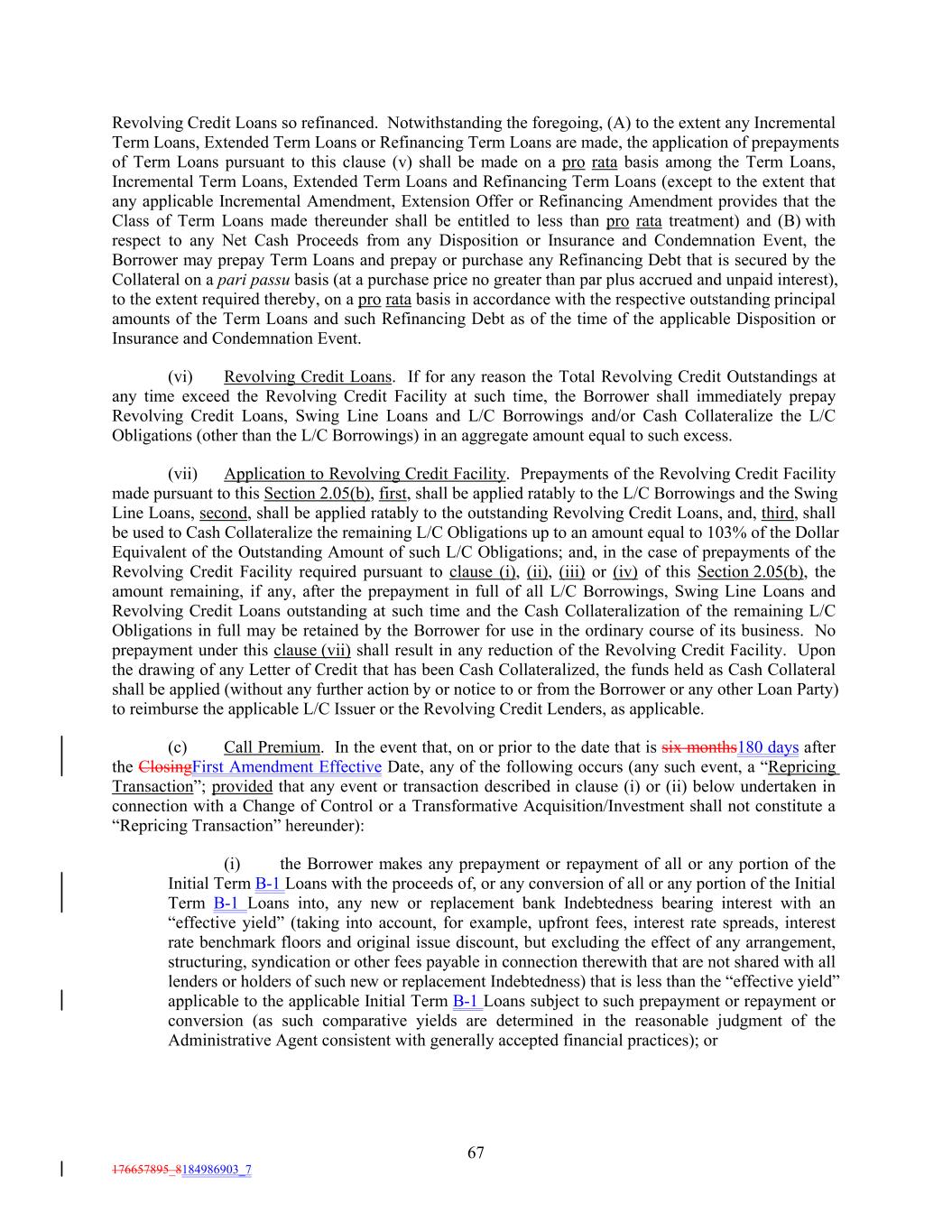 Revolving Credit Loans so refinanced. Notwithstanding the foregoing, (A) to the extent any Incremental Term Loans, Extended Term Loans or Refinancing Term Loans are made, the application of prepayments of Term Loans pursuant to this clause (v) shall be made on a pro rata basis among the Term Loans, Incremental Term Loans, Extended Term Loans and Refinancing Term Loans (except to the extent that any applicable Incremental Amendment, Extension Offer or Refinancing Amendment provides that the Class of Term Loans made thereunder shall be entitled to less than pro rata treatment) and (B) with respect to any Net Cash Proceeds from any Disposition or Insurance and Condemnation Event, the Borrower may prepay Term Loans and prepay or purchase any Refinancing Debt that is secured by the Collateral on a pari passu basis (at a purchase price no greater than par plus accrued and unpaid interest), to the extent required thereby, on a pro rata basis in accordance with the respective outstanding principal amounts of the Term Loans and such Refinancing Debt as of the time of the applicable Disposition or Insurance and Condemnation Event. (vi) Revolving Credit Loans. If for any reason the Total Revolving Credit Outstandings at any time exceed the Revolving Credit Facility at such time, the Borrower shall immediately prepay Revolving Credit Loans, Swing Line Loans and L/C Borrowings and/or Cash Collateralize the L/C Obligations (other than the L/C Borrowings) in an aggregate amount equal to such excess. (vii) Application to Revolving Credit Facility. Prepayments of the Revolving Credit Facility made pursuant to this Section 2.05(b), first, shall be applied ratably to the L/C Borrowings and the Swing Line Loans, second, shall be applied ratably to the outstanding Revolving Credit Loans, and, third, shall be used to Cash Collateralize the remaining L/C Obligations up to an amount equal to 103% of the Dollar Equivalent of the Outstanding Amount of such L/C Obligations; and, in the case of prepayments of the Revolving Credit Facility required pursuant to clause (i), (ii), (iii) or (iv) of this Section 2.05(b), the amount remaining, if any, after the prepayment in full of all L/C Borrowings, Swing Line Loans and Revolving Credit Loans outstanding at such time and the Cash Collateralization of the remaining L/C Obligations in full may be retained by the Borrower for use in the ordinary course of its business. No prepayment under this clause (vii) shall result in any reduction of the Revolving Credit Facility. Upon the drawing of any Letter of Credit that has been Cash Collateralized, the funds held as Cash Collateral shall be applied (without any further action by or notice to or from the Borrower or any other Loan Party) to reimburse the applicable L/C Issuer or the Revolving Credit Lenders, as applicable. (c) Call Premium. In the event that, on or prior to the date that is six months180 days after the ClosingFirst Amendment Effective Date, any of the following occurs (any such event, a “Repricing Transaction”; provided that any event or transaction described in clause (i) or (ii) below undertaken in connection with a Change of Control or a Transformative Acquisition/Investment shall not constitute a “Repricing Transaction” hereunder): (i) the Borrower makes any prepayment or repayment of all or any portion of the Initial Term B-1 Loans with the proceeds of, or any conversion of all or any portion of the Initial Term B-1 Loans into, any new or replacement bank Indebtedness bearing interest with an “effective yield” (taking into account, for example, upfront fees, interest rate spreads, interest rate benchmark floors and original issue discount, but excluding the effect of any arrangement, structuring, syndication or other fees payable in connection therewith that are not shared with all lenders or holders of such new or replacement Indebtedness) that is less than the “effective yield” applicable to the applicable Initial Term B-1 Loans subject to such prepayment or repayment or conversion (as such comparative yields are determined in the reasonable judgment of the Administrative Agent consistent with generally accepted financial practices); or 67 176657895_8184986903_7