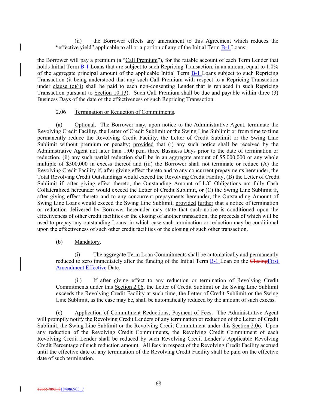 (ii) the Borrower effects any amendment to this Agreement which reduces the “effective yield” applicable to all or a portion of any of the Initial Term B-1 Loans; the Borrower will pay a premium (a “Call Premium”), for the ratable account of each Term Lender that holds Initial Term B-1 Loans that are subject to such Repricing Transaction, in an amount equal to 1.0% of the aggregate principal amount of the applicable Initial Term B-1 Loans subject to such Repricing Transaction (it being understood that any such Call Premium with respect to a Repricing Transaction under clause (c)(ii) shall be paid to each non-consenting Lender that is replaced in such Repricing Transaction pursuant to Section 10.13). Such Call Premium shall be due and payable within three (3) Business Days of the date of the effectiveness of such Repricing Transaction. 2.06 Termination or Reduction of Commitments. (a) Optional. The Borrower may, upon notice to the Administrative Agent, terminate the Revolving Credit Facility, the Letter of Credit Sublimit or the Swing Line Sublimit or from time to time permanently reduce the Revolving Credit Facility, the Letter of Credit Sublimit or the Swing Line Sublimit without premium or penalty; provided that (i) any such notice shall be received by the Administrative Agent not later than 1:00 p.m. three Business Days prior to the date of termination or reduction, (ii) any such partial reduction shall be in an aggregate amount of $5,000,000 or any whole multiple of $500,000 in excess thereof and (iii) the Borrower shall not terminate or reduce (A) the Revolving Credit Facility if, after giving effect thereto and to any concurrent prepayments hereunder, the Total Revolving Credit Outstandings would exceed the Revolving Credit Facility, (B) the Letter of Credit Sublimit if, after giving effect thereto, the Outstanding Amount of L/C Obligations not fully Cash Collateralized hereunder would exceed the Letter of Credit Sublimit, or (C) the Swing Line Sublimit if, after giving effect thereto and to any concurrent prepayments hereunder, the Outstanding Amount of Swing Line Loans would exceed the Swing Line Sublimit; provided further that a notice of termination or reduction delivered by Borrower hereunder may state that such notice is conditioned upon the effectiveness of other credit facilities or the closing of another transaction, the proceeds of which will be used to prepay any outstanding Loans, in which case such termination or reduction may be conditional upon the effectiveness of such other credit facilities or the closing of such other transaction. (b) Mandatory. (i) The aggregate Term Loan Commitments shall be automatically and permanently reduced to zero immediately after the funding of the Initial Term B-1 Loan on the ClosingFirst Amendment Effective Date. (ii) If after giving effect to any reduction or termination of Revolving Credit Commitments under this Section 2.06, the Letter of Credit Sublimit or the Swing Line Sublimit exceeds the Revolving Credit Facility at such time, the Letter of Credit Sublimit or the Swing Line Sublimit, as the case may be, shall be automatically reduced by the amount of such excess. (c) Application of Commitment Reductions; Payment of Fees. The Administrative Agent will promptly notify the Revolving Credit Lenders of any termination or reduction of the Letter of Credit Sublimit, the Swing Line Sublimit or the Revolving Credit Commitment under this Section 2.06. Upon any reduction of the Revolving Credit Commitments, the Revolving Credit Commitment of each Revolving Credit Lender shall be reduced by such Revolving Credit Lender’s Applicable Revolving Credit Percentage of such reduction amount. All fees in respect of the Revolving Credit Facility accrued until the effective date of any termination of the Revolving Credit Facility shall be paid on the effective date of such termination. 68 176657895_8184986903_7