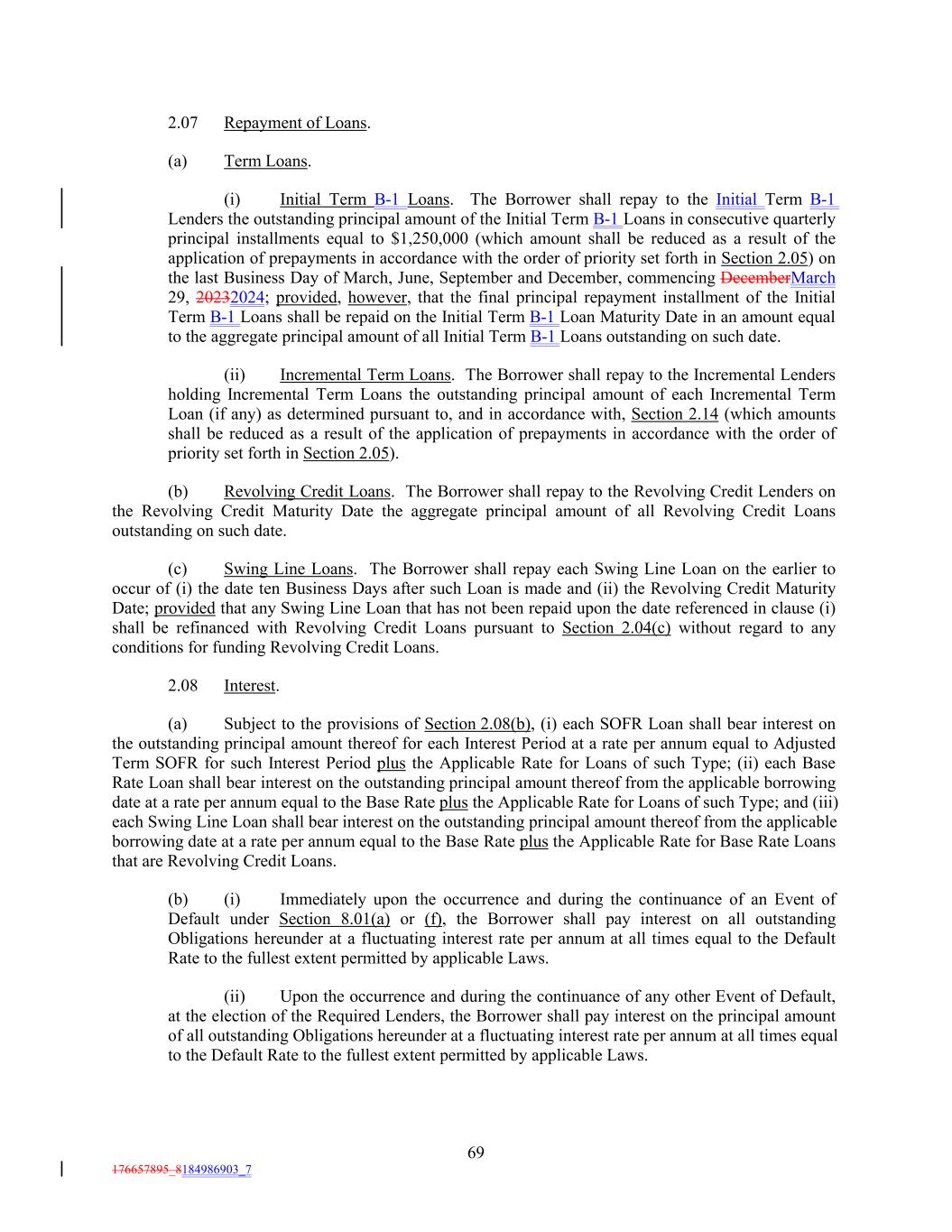2.07 Repayment of Loans. (a) Term Loans. (i) Initial Term B-1 Loans. The Borrower shall repay to the Initial Term B-1 Lenders the outstanding principal amount of the Initial Term B-1 Loans in consecutive quarterly principal installments equal to $1,250,000 (which amount shall be reduced as a result of the application of prepayments in accordance with the order of priority set forth in Section 2.05) on the last Business Day of March, June, September and December, commencing DecemberMarch 29, 20232024; provided, however, that the final principal repayment installment of the Initial Term B-1 Loans shall be repaid on the Initial Term B-1 Loan Maturity Date in an amount equal to the aggregate principal amount of all Initial Term B-1 Loans outstanding on such date. (ii) Incremental Term Loans. The Borrower shall repay to the Incremental Lenders holding Incremental Term Loans the outstanding principal amount of each Incremental Term Loan (if any) as determined pursuant to, and in accordance with, Section 2.14 (which amounts shall be reduced as a result of the application of prepayments in accordance with the order of priority set forth in Section 2.05). (b) Revolving Credit Loans. The Borrower shall repay to the Revolving Credit Lenders on the Revolving Credit Maturity Date the aggregate principal amount of all Revolving Credit Loans outstanding on such date. (c) Swing Line Loans. The Borrower shall repay each Swing Line Loan on the earlier to occur of (i) the date ten Business Days after such Loan is made and (ii) the Revolving Credit Maturity Date; provided that any Swing Line Loan that has not been repaid upon the date referenced in clause (i) shall be refinanced with Revolving Credit Loans pursuant to Section 2.04(c) without regard to any conditions for funding Revolving Credit Loans. 2.08 Interest. (a) Subject to the provisions of Section 2.08(b), (i) each SOFR Loan shall bear interest on the outstanding principal amount thereof for each Interest Period at a rate per annum equal to Adjusted Term SOFR for such Interest Period plus the Applicable Rate for Loans of such Type; (ii) each Base Rate Loan shall bear interest on the outstanding principal amount thereof from the applicable borrowing date at a rate per annum equal to the Base Rate plus the Applicable Rate for Loans of such Type; and (iii) each Swing Line Loan shall bear interest on the outstanding principal amount thereof from the applicable borrowing date at a rate per annum equal to the Base Rate plus the Applicable Rate for Base Rate Loans that are Revolving Credit Loans. (b) (i) Immediately upon the occurrence and during the continuance of an Event of Default under Section 8.01(a) or (f), the Borrower shall pay interest on all outstanding Obligations hereunder at a fluctuating interest rate per annum at all times equal to the Default Rate to the fullest extent permitted by applicable Laws. (ii) Upon the occurrence and during the continuance of any other Event of Default, at the election of the Required Lenders, the Borrower shall pay interest on the principal amount of all outstanding Obligations hereunder at a fluctuating interest rate per annum at all times equal to the Default Rate to the fullest extent permitted by applicable Laws. 69 176657895_8184986903_7