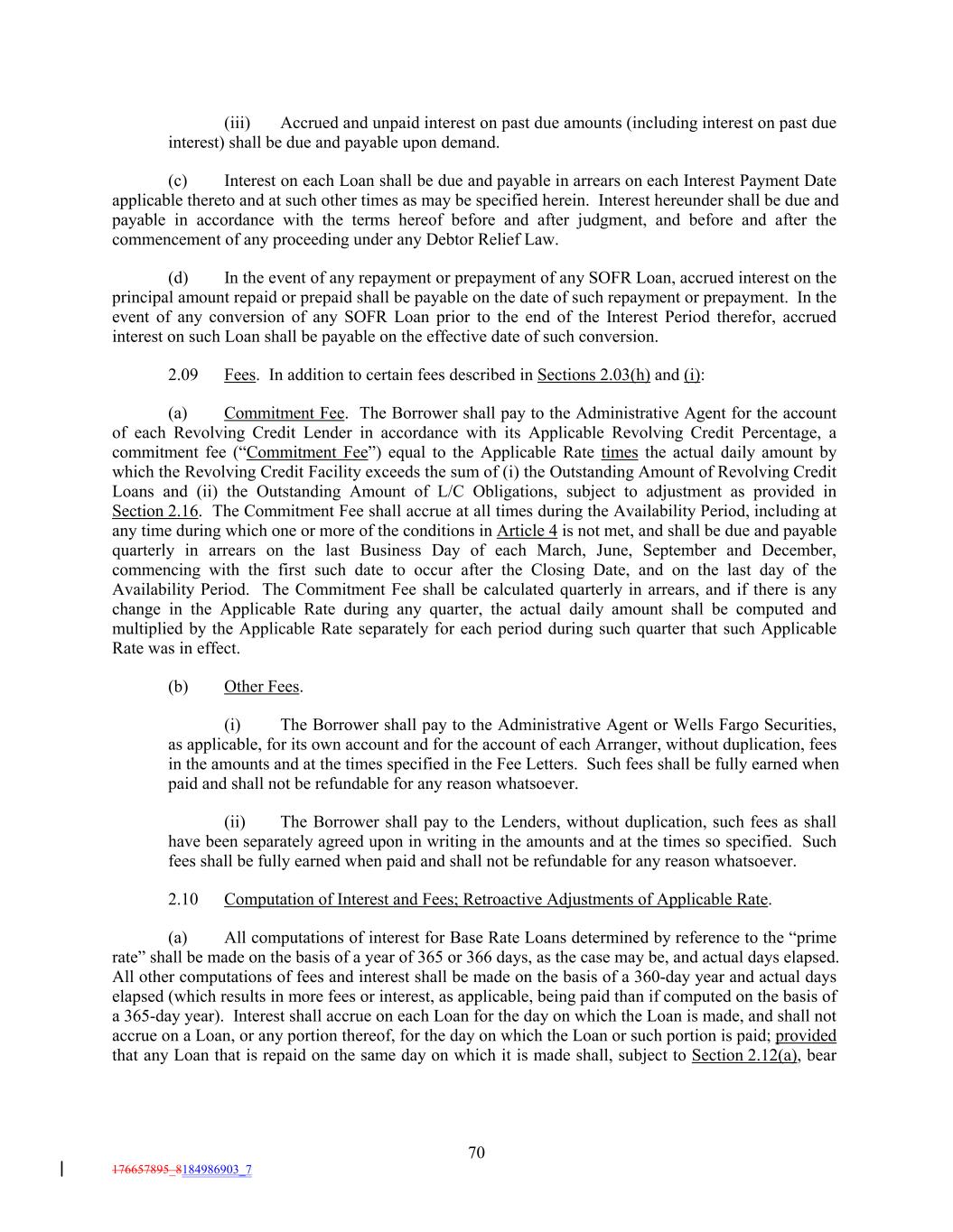 (iii) Accrued and unpaid interest on past due amounts (including interest on past due interest) shall be due and payable upon demand. (c) Interest on each Loan shall be due and payable in arrears on each Interest Payment Date applicable thereto and at such other times as may be specified herein. Interest hereunder shall be due and payable in accordance with the terms hereof before and after judgment, and before and after the commencement of any proceeding under any Debtor Relief Law. (d) In the event of any repayment or prepayment of any SOFR Loan, accrued interest on the principal amount repaid or prepaid shall be payable on the date of such repayment or prepayment. In the event of any conversion of any SOFR Loan prior to the end of the Interest Period therefor, accrued interest on such Loan shall be payable on the effective date of such conversion. 2.09 Fees. In addition to certain fees described in Sections 2.03(h) and (i): (a) Commitment Fee. The Borrower shall pay to the Administrative Agent for the account of each Revolving Credit Lender in accordance with its Applicable Revolving Credit Percentage, a commitment fee (“Commitment Fee”) equal to the Applicable Rate times the actual daily amount by which the Revolving Credit Facility exceeds the sum of (i) the Outstanding Amount of Revolving Credit Loans and (ii) the Outstanding Amount of L/C Obligations, subject to adjustment as provided in Section 2.16. The Commitment Fee shall accrue at all times during the Availability Period, including at any time during which one or more of the conditions in Article 4 is not met, and shall be due and payable quarterly in arrears on the last Business Day of each March, June, September and December, commencing with the first such date to occur after the Closing Date, and on the last day of the Availability Period. The Commitment Fee shall be calculated quarterly in arrears, and if there is any change in the Applicable Rate during any quarter, the actual daily amount shall be computed and multiplied by the Applicable Rate separately for each period during such quarter that such Applicable Rate was in effect. (b) Other Fees. (i) The Borrower shall pay to the Administrative Agent or Wells Fargo Securities, as applicable, for its own account and for the account of each Arranger, without duplication, fees in the amounts and at the times specified in the Fee Letters. Such fees shall be fully earned when paid and shall not be refundable for any reason whatsoever. (ii) The Borrower shall pay to the Lenders, without duplication, such fees as shall have been separately agreed upon in writing in the amounts and at the times so specified. Such fees shall be fully earned when paid and shall not be refundable for any reason whatsoever. 2.10 Computation of Interest and Fees; Retroactive Adjustments of Applicable Rate. (a) All computations of interest for Base Rate Loans determined by reference to the “prime rate” shall be made on the basis of a year of 365 or 366 days, as the case may be, and actual days elapsed. All other computations of fees and interest shall be made on the basis of a 360-day year and actual days elapsed (which results in more fees or interest, as applicable, being paid than if computed on the basis of a 365-day year). Interest shall accrue on each Loan for the day on which the Loan is made, and shall not accrue on a Loan, or any portion thereof, for the day on which the Loan or such portion is paid; provided that any Loan that is repaid on the same day on which it is made shall, subject to Section 2.12(a), bear 70 176657895_8184986903_7