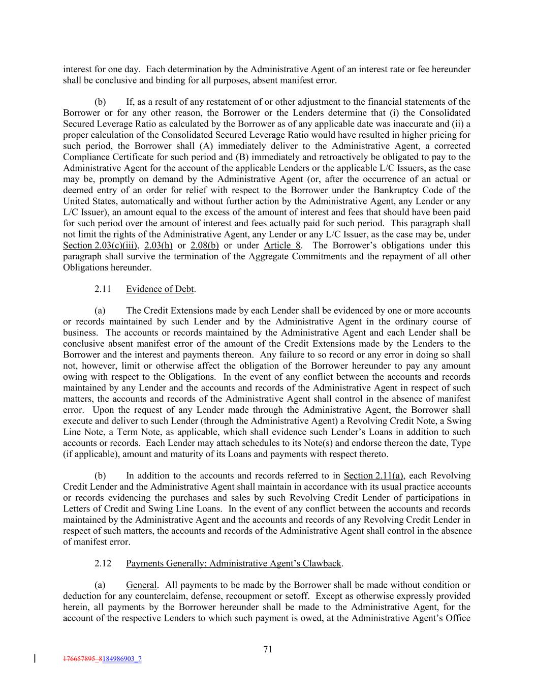 interest for one day. Each determination by the Administrative Agent of an interest rate or fee hereunder shall be conclusive and binding for all purposes, absent manifest error. (b) If, as a result of any restatement of or other adjustment to the financial statements of the Borrower or for any other reason, the Borrower or the Lenders determine that (i) the Consolidated Secured Leverage Ratio as calculated by the Borrower as of any applicable date was inaccurate and (ii) a proper calculation of the Consolidated Secured Leverage Ratio would have resulted in higher pricing for such period, the Borrower shall (A) immediately deliver to the Administrative Agent, a corrected Compliance Certificate for such period and (B) immediately and retroactively be obligated to pay to the Administrative Agent for the account of the applicable Lenders or the applicable L/C Issuers, as the case may be, promptly on demand by the Administrative Agent (or, after the occurrence of an actual or deemed entry of an order for relief with respect to the Borrower under the Bankruptcy Code of the United States, automatically and without further action by the Administrative Agent, any Lender or any L/C Issuer), an amount equal to the excess of the amount of interest and fees that should have been paid for such period over the amount of interest and fees actually paid for such period. This paragraph shall not limit the rights of the Administrative Agent, any Lender or any L/C Issuer, as the case may be, under Section 2.03(c)(iii), 2.03(h) or 2.08(b) or under Article 8. The Borrower’s obligations under this paragraph shall survive the termination of the Aggregate Commitments and the repayment of all other Obligations hereunder. 2.11 Evidence of Debt. (a) The Credit Extensions made by each Lender shall be evidenced by one or more accounts or records maintained by such Lender and by the Administrative Agent in the ordinary course of business. The accounts or records maintained by the Administrative Agent and each Lender shall be conclusive absent manifest error of the amount of the Credit Extensions made by the Lenders to the Borrower and the interest and payments thereon. Any failure to so record or any error in doing so shall not, however, limit or otherwise affect the obligation of the Borrower hereunder to pay any amount owing with respect to the Obligations. In the event of any conflict between the accounts and records maintained by any Lender and the accounts and records of the Administrative Agent in respect of such matters, the accounts and records of the Administrative Agent shall control in the absence of manifest error. Upon the request of any Lender made through the Administrative Agent, the Borrower shall execute and deliver to such Lender (through the Administrative Agent) a Revolving Credit Note, a Swing Line Note, a Term Note, as applicable, which shall evidence such Lender’s Loans in addition to such accounts or records. Each Lender may attach schedules to its Note(s) and endorse thereon the date, Type (if applicable), amount and maturity of its Loans and payments with respect thereto. (b) In addition to the accounts and records referred to in Section 2.11(a), each Revolving Credit Lender and the Administrative Agent shall maintain in accordance with its usual practice accounts or records evidencing the purchases and sales by such Revolving Credit Lender of participations in Letters of Credit and Swing Line Loans. In the event of any conflict between the accounts and records maintained by the Administrative Agent and the accounts and records of any Revolving Credit Lender in respect of such matters, the accounts and records of the Administrative Agent shall control in the absence of manifest error. 2.12 Payments Generally; Administrative Agent’s Clawback. (a) General. All payments to be made by the Borrower shall be made without condition or deduction for any counterclaim, defense, recoupment or setoff. Except as otherwise expressly provided herein, all payments by the Borrower hereunder shall be made to the Administrative Agent, for the account of the respective Lenders to which such payment is owed, at the Administrative Agent’s Office 71 176657895_8184986903_7