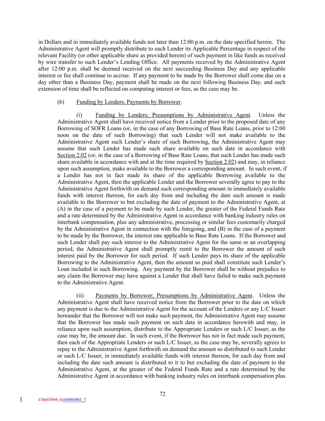 in Dollars and in immediately available funds not later than 12:00 p.m. on the date specified herein. The Administrative Agent will promptly distribute to each Lender its Applicable Percentage in respect of the relevant Facility (or other applicable share as provided herein) of such payment in like funds as received by wire transfer to such Lender’s Lending Office. All payments received by the Administrative Agent after 12:00 p.m. shall be deemed received on the next succeeding Business Day and any applicable interest or fee shall continue to accrue. If any payment to be made by the Borrower shall come due on a day other than a Business Day, payment shall be made on the next following Business Day, and such extension of time shall be reflected on computing interest or fees, as the case may be. (b) Funding by Lenders; Payments by Borrower. (i) Funding by Lenders; Presumptions by Administrative Agent. Unless the Administrative Agent shall have received notice from a Lender prior to the proposed date of any Borrowing of SOFR Loans (or, in the case of any Borrowing of Base Rate Loans, prior to 12:00 noon on the date of such Borrowing) that such Lender will not make available to the Administrative Agent such Lender’s share of such Borrowing, the Administrative Agent may assume that such Lender has made such share available on such date in accordance with Section 2.02 (or, in the case of a Borrowing of Base Rate Loans, that such Lender has made such share available in accordance with and at the time required by Section 2.02) and may, in reliance upon such assumption, make available to the Borrower a corresponding amount. In such event, if a Lender has not in fact made its share of the applicable Borrowing available to the Administrative Agent, then the applicable Lender and the Borrower severally agree to pay to the Administrative Agent forthwith on demand such corresponding amount in immediately available funds with interest thereon, for each day from and including the date such amount is made available to the Borrower to but excluding the date of payment to the Administrative Agent, at (A) in the case of a payment to be made by such Lender, the greater of the Federal Funds Rate and a rate determined by the Administrative Agent in accordance with banking industry rules on interbank compensation, plus any administrative, processing or similar fees customarily charged by the Administrative Agent in connection with the foregoing, and (B) in the case of a payment to be made by the Borrower, the interest rate applicable to Base Rate Loans. If the Borrower and such Lender shall pay such interest to the Administrative Agent for the same or an overlapping period, the Administrative Agent shall promptly remit to the Borrower the amount of such interest paid by the Borrower for such period. If such Lender pays its share of the applicable Borrowing to the Administrative Agent, then the amount so paid shall constitute such Lender’s Loan included in such Borrowing. Any payment by the Borrower shall be without prejudice to any claim the Borrower may have against a Lender that shall have failed to make such payment to the Administrative Agent. (ii) Payments by Borrower; Presumptions by Administrative Agent. Unless the Administrative Agent shall have received notice from the Borrower prior to the date on which any payment is due to the Administrative Agent for the account of the Lenders or any L/C Issuer hereunder that the Borrower will not make such payment, the Administrative Agent may assume that the Borrower has made such payment on such date in accordance herewith and may, in reliance upon such assumption, distribute to the Appropriate Lenders or such L/C Issuer, as the case may be, the amount due. In such event, if the Borrower has not in fact made such payment, then each of the Appropriate Lenders or such L/C Issuer, as the case may be, severally agrees to repay to the Administrative Agent forthwith on demand the amount so distributed to such Lender or such L/C Issuer, in immediately available funds with interest thereon, for each day from and including the date such amount is distributed to it to but excluding the date of payment to the Administrative Agent, at the greater of the Federal Funds Rate and a rate determined by the Administrative Agent in accordance with banking industry rules on interbank compensation plus 72 176657895_8184986903_7