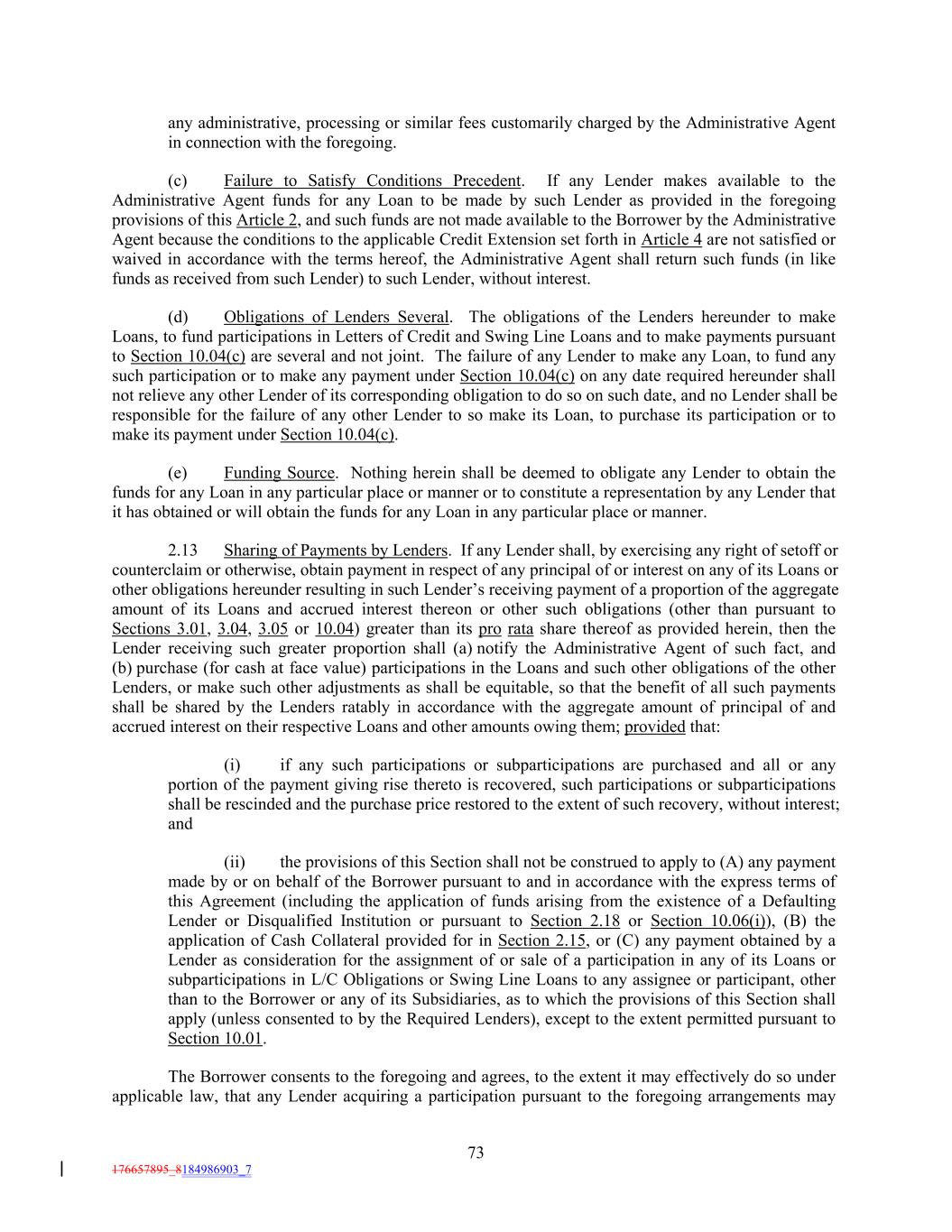 any administrative, processing or similar fees customarily charged by the Administrative Agent in connection with the foregoing. (c) Failure to Satisfy Conditions Precedent. If any Lender makes available to the Administrative Agent funds for any Loan to be made by such Lender as provided in the foregoing provisions of this Article 2, and such funds are not made available to the Borrower by the Administrative Agent because the conditions to the applicable Credit Extension set forth in Article 4 are not satisfied or waived in accordance with the terms hereof, the Administrative Agent shall return such funds (in like funds as received from such Lender) to such Lender, without interest. (d) Obligations of Lenders Several. The obligations of the Lenders hereunder to make Loans, to fund participations in Letters of Credit and Swing Line Loans and to make payments pursuant to Section 10.04(c) are several and not joint. The failure of any Lender to make any Loan, to fund any such participation or to make any payment under Section 10.04(c) on any date required hereunder shall not relieve any other Lender of its corresponding obligation to do so on such date, and no Lender shall be responsible for the failure of any other Lender to so make its Loan, to purchase its participation or to make its payment under Section 10.04(c). (e) Funding Source. Nothing herein shall be deemed to obligate any Lender to obtain the funds for any Loan in any particular place or manner or to constitute a representation by any Lender that it has obtained or will obtain the funds for any Loan in any particular place or manner. 2.13 Sharing of Payments by Lenders. If any Lender shall, by exercising any right of setoff or counterclaim or otherwise, obtain payment in respect of any principal of or interest on any of its Loans or other obligations hereunder resulting in such Lender’s receiving payment of a proportion of the aggregate amount of its Loans and accrued interest thereon or other such obligations (other than pursuant to Sections 3.01, 3.04, 3.05 or 10.04) greater than its pro rata share thereof as provided herein, then the Lender receiving such greater proportion shall (a) notify the Administrative Agent of such fact, and (b) purchase (for cash at face value) participations in the Loans and such other obligations of the other Lenders, or make such other adjustments as shall be equitable, so that the benefit of all such payments shall be shared by the Lenders ratably in accordance with the aggregate amount of principal of and accrued interest on their respective Loans and other amounts owing them; provided that: (i) if any such participations or subparticipations are purchased and all or any portion of the payment giving rise thereto is recovered, such participations or subparticipations shall be rescinded and the purchase price restored to the extent of such recovery, without interest; and (ii) the provisions of this Section shall not be construed to apply to (A) any payment made by or on behalf of the Borrower pursuant to and in accordance with the express terms of this Agreement (including the application of funds arising from the existence of a Defaulting Lender or Disqualified Institution or pursuant to Section 2.18 or Section 10.06(i)), (B) the application of Cash Collateral provided for in Section 2.15, or (C) any payment obtained by a Lender as consideration for the assignment of or sale of a participation in any of its Loans or subparticipations in L/C Obligations or Swing Line Loans to any assignee or participant, other than to the Borrower or any of its Subsidiaries, as to which the provisions of this Section shall apply (unless consented to by the Required Lenders), except to the extent permitted pursuant to Section 10.01. The Borrower consents to the foregoing and agrees, to the extent it may effectively do so under applicable law, that any Lender acquiring a participation pursuant to the foregoing arrangements may 73 176657895_8184986903_7