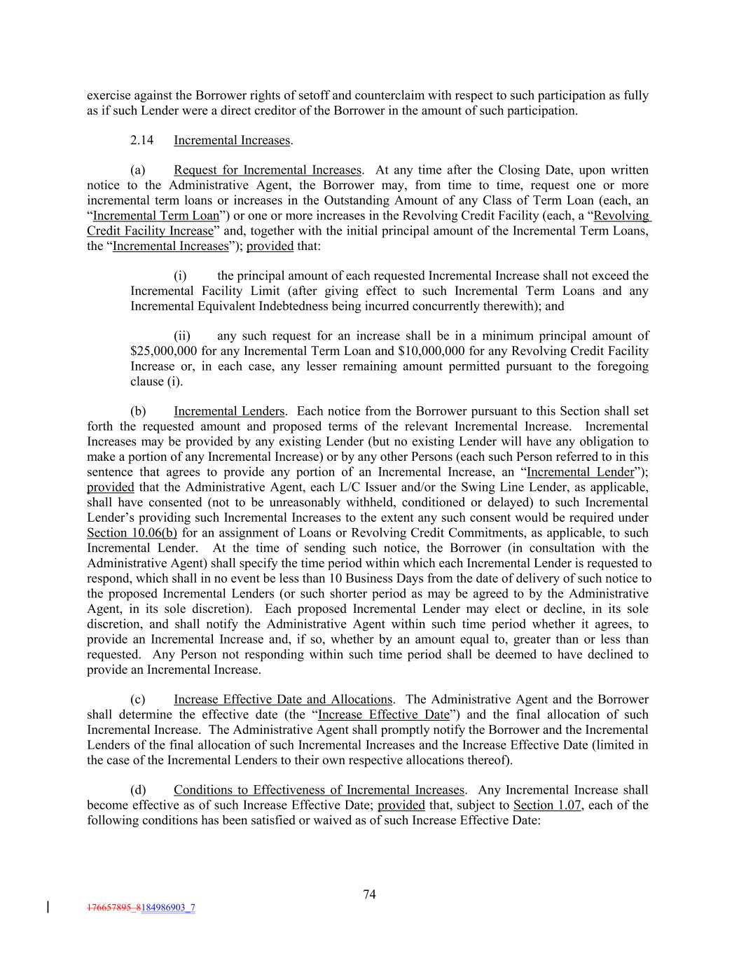 exercise against the Borrower rights of setoff and counterclaim with respect to such participation as fully as if such Lender were a direct creditor of the Borrower in the amount of such participation. 2.14 Incremental Increases. (a) Request for Incremental Increases. At any time after the Closing Date, upon written notice to the Administrative Agent, the Borrower may, from time to time, request one or more incremental term loans or increases in the Outstanding Amount of any Class of Term Loan (each, an “Incremental Term Loan”) or one or more increases in the Revolving Credit Facility (each, a “Revolving Credit Facility Increase” and, together with the initial principal amount of the Incremental Term Loans, the “Incremental Increases”); provided that: (i) the principal amount of each requested Incremental Increase shall not exceed the Incremental Facility Limit (after giving effect to such Incremental Term Loans and any Incremental Equivalent Indebtedness being incurred concurrently therewith); and (ii) any such request for an increase shall be in a minimum principal amount of $25,000,000 for any Incremental Term Loan and $10,000,000 for any Revolving Credit Facility Increase or, in each case, any lesser remaining amount permitted pursuant to the foregoing clause (i). (b) Incremental Lenders. Each notice from the Borrower pursuant to this Section shall set forth the requested amount and proposed terms of the relevant Incremental Increase. Incremental Increases may be provided by any existing Lender (but no existing Lender will have any obligation to make a portion of any Incremental Increase) or by any other Persons (each such Person referred to in this sentence that agrees to provide any portion of an Incremental Increase, an “Incremental Lender”); provided that the Administrative Agent, each L/C Issuer and/or the Swing Line Lender, as applicable, shall have consented (not to be unreasonably withheld, conditioned or delayed) to such Incremental Lender’s providing such Incremental Increases to the extent any such consent would be required under Section 10.06(b) for an assignment of Loans or Revolving Credit Commitments, as applicable, to such Incremental Lender. At the time of sending such notice, the Borrower (in consultation with the Administrative Agent) shall specify the time period within which each Incremental Lender is requested to respond, which shall in no event be less than 10 Business Days from the date of delivery of such notice to the proposed Incremental Lenders (or such shorter period as may be agreed to by the Administrative Agent, in its sole discretion). Each proposed Incremental Lender may elect or decline, in its sole discretion, and shall notify the Administrative Agent within such time period whether it agrees, to provide an Incremental Increase and, if so, whether by an amount equal to, greater than or less than requested. Any Person not responding within such time period shall be deemed to have declined to provide an Incremental Increase. (c) Increase Effective Date and Allocations. The Administrative Agent and the Borrower shall determine the effective date (the “Increase Effective Date”) and the final allocation of such Incremental Increase. The Administrative Agent shall promptly notify the Borrower and the Incremental Lenders of the final allocation of such Incremental Increases and the Increase Effective Date (limited in the case of the Incremental Lenders to their own respective allocations thereof). (d) Conditions to Effectiveness of Incremental Increases. Any Incremental Increase shall become effective as of such Increase Effective Date; provided that, subject to Section 1.07, each of the following conditions has been satisfied or waived as of such Increase Effective Date: 74 176657895_8184986903_7
