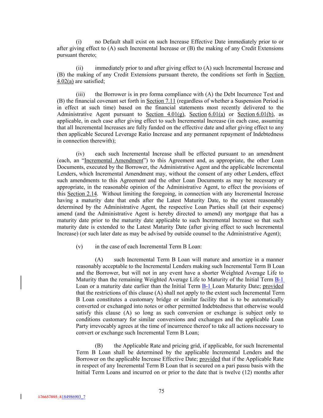 (i) no Default shall exist on such Increase Effective Date immediately prior to or after giving effect to (A) such Incremental Increase or (B) the making of any Credit Extensions pursuant thereto; (ii) immediately prior to and after giving effect to (A) such Incremental Increase and (B) the making of any Credit Extensions pursuant thereto, the conditions set forth in Section 4.02(a) are satisfied; (iii) the Borrower is in pro forma compliance with (A) the Debt Incurrence Test and (B) the financial covenant set forth in Section 7.11 (regardless of whether a Suspension Period is in effect at such time) based on the financial statements most recently delivered to the Administrative Agent pursuant to Section 4.01(g), Section 6.01(a) or Section 6.01(b), as applicable, in each case after giving effect to such Incremental Increase (in each case, assuming that all Incremental Increases are fully funded on the effective date and after giving effect to any then applicable Secured Leverage Ratio Increase and any permanent repayment of Indebtedness in connection therewith); (iv) each such Incremental Increase shall be effected pursuant to an amendment (each, an “Incremental Amendment”) to this Agreement and, as appropriate, the other Loan Documents, executed by the Borrower, the Administrative Agent and the applicable Incremental Lenders, which Incremental Amendment may, without the consent of any other Lenders, effect such amendments to this Agreement and the other Loan Documents as may be necessary or appropriate, in the reasonable opinion of the Administrative Agent, to effect the provisions of this Section 2.14. Without limiting the foregoing, in connection with any Incremental Increase having a maturity date that ends after the Latest Maturity Date, to the extent reasonably determined by the Administrative Agent, the respective Loan Parties shall (at their expense) amend (and the Administrative Agent is hereby directed to amend) any mortgage that has a maturity date prior to the maturity date applicable to such Incremental Increase so that such maturity date is extended to the Latest Maturity Date (after giving effect to such Incremental Increase) (or such later date as may be advised by outside counsel to the Administrative Agent); (v) in the case of each Incremental Term B Loan: (A) such Incremental Term B Loan will mature and amortize in a manner reasonably acceptable to the Incremental Lenders making such Incremental Term B Loan and the Borrower, but will not in any event have a shorter Weighted Average Life to Maturity than the remaining Weighted Average Life to Maturity of the Initial Term B-1 Loan or a maturity date earlier than the Initial Term B-1 Loan Maturity Date; provided that the restrictions of this clause (A) shall not apply to the extent such Incremental Term B Loan constitutes a customary bridge or similar facility that is to be automatically converted or exchanged into notes or other permitted Indebtedness that otherwise would satisfy this clause (A) so long as such conversion or exchange is subject only to conditions customary for similar conversions and exchanges and the applicable Loan Party irrevocably agrees at the time of incurrence thereof to take all actions necessary to convert or exchange such Incremental Term B Loan; (B) the Applicable Rate and pricing grid, if applicable, for such Incremental Term B Loan shall be determined by the applicable Incremental Lenders and the Borrower on the applicable Increase Effective Date; provided that if the Applicable Rate in respect of any Incremental Term B Loan that is secured on a pari passu basis with the Initial Term Loans and incurred on or prior to the date that is twelve (12) months after 75 176657895_8184986903_7