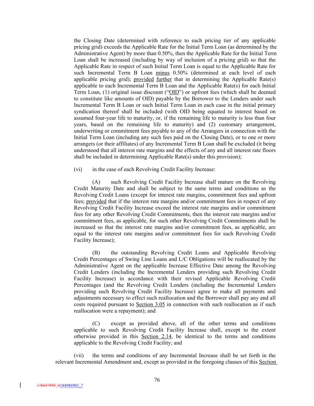 the Closing Date (determined with reference to each pricing tier of any applicable pricing grid) exceeds the Applicable Rate for the Initial Term Loan (as determined by the Administrative Agent) by more than 0.50%, then the Applicable Rate for the Initial Term Loan shall be increased (including by way of inclusion of a pricing grid) so that the Applicable Rate in respect of such Initial Term Loan is equal to the Applicable Rate for such Incremental Term B Loan minus 0.50% (determined at each level of each applicable pricing grid); provided further that in determining the Applicable Rate(s) applicable to each Incremental Term B Loan and the Applicable Rate(s) for each Initial Term Loan, (1) original issue discount (“OID”) or upfront fees (which shall be deemed to constitute like amounts of OID) payable by the Borrower to the Lenders under such Incremental Term B Loan or such Initial Term Loan in each case in the initial primary syndication thereof shall be included (with OID being equated to interest based on assumed four-year life to maturity, or, if the remaining life to maturity is less than four years, based on the remaining life to maturity) and (2) customary arrangement, underwriting or commitment fees payable to any of the Arrangers in connection with the Initial Term Loan (including any such fees paid on the Closing Date), or to one or more arrangers (or their affiliates) of any Incremental Term B Loan shall be excluded (it being understood that all interest rate margins and the effects of any and all interest rate floors shall be included in determining Applicable Rate(s) under this provision); (vi) in the case of each Revolving Credit Facility Increase: (A) such Revolving Credit Facility Increase shall mature on the Revolving Credit Maturity Date and shall be subject to the same terms and conditions as the Revolving Credit Loans (except for interest rate margins, commitment fees and upfront fees; provided that if the interest rate margins and/or commitment fees in respect of any Revolving Credit Facility Increase exceed the interest rate margins and/or commitment fees for any other Revolving Credit Commitments, then the interest rate margins and/or commitment fees, as applicable, for such other Revolving Credit Commitments shall be increased so that the interest rate margins and/or commitment fees, as applicable, are equal to the interest rate margins and/or commitment fees for such Revolving Credit Facility Increase); (B) the outstanding Revolving Credit Loans and Applicable Revolving Credit Percentages of Swing Line Loans and L/C Obligations will be reallocated by the Administrative Agent on the applicable Increase Effective Date among the Revolving Credit Lenders (including the Incremental Lenders providing such Revolving Credit Facility Increase) in accordance with their revised Applicable Revolving Credit Percentages (and the Revolving Credit Lenders (including the Incremental Lenders providing such Revolving Credit Facility Increase) agree to make all payments and adjustments necessary to effect such reallocation and the Borrower shall pay any and all costs required pursuant to Section 3.05 in connection with such reallocation as if such reallocation were a repayment); and (C) except as provided above, all of the other terms and conditions applicable to such Revolving Credit Facility Increase shall, except to the extent otherwise provided in this Section 2.14, be identical to the terms and conditions applicable to the Revolving Credit Facility; and (vii) the terms and conditions of any Incremental Increase shall be set forth in the relevant Incremental Amendment and, except as provided in the foregoing clauses of this Section 76 176657895_8184986903_7