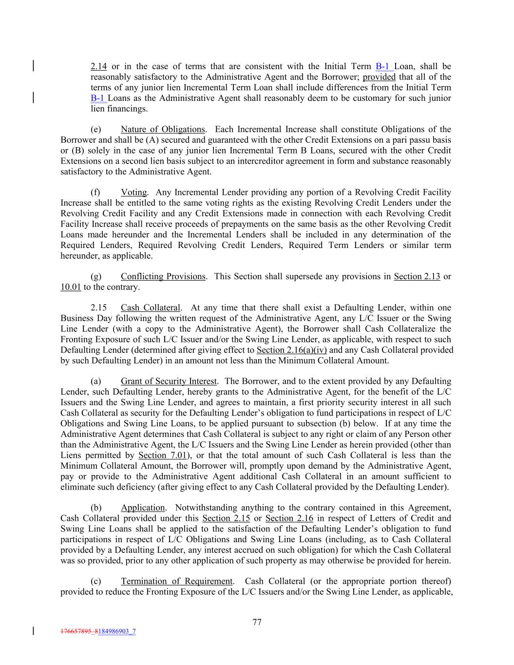 2.14 or in the case of terms that are consistent with the Initial Term B-1 Loan, shall be reasonably satisfactory to the Administrative Agent and the Borrower; provided that all of the terms of any junior lien Incremental Term Loan shall include differences from the Initial Term B-1 Loans as the Administrative Agent shall reasonably deem to be customary for such junior lien financings. (e) Nature of Obligations. Each Incremental Increase shall constitute Obligations of the Borrower and shall be (A) secured and guaranteed with the other Credit Extensions on a pari passu basis or (B) solely in the case of any junior lien Incremental Term B Loans, secured with the other Credit Extensions on a second lien basis subject to an intercreditor agreement in form and substance reasonably satisfactory to the Administrative Agent. (f) Voting. Any Incremental Lender providing any portion of a Revolving Credit Facility Increase shall be entitled to the same voting rights as the existing Revolving Credit Lenders under the Revolving Credit Facility and any Credit Extensions made in connection with each Revolving Credit Facility Increase shall receive proceeds of prepayments on the same basis as the other Revolving Credit Loans made hereunder and the Incremental Lenders shall be included in any determination of the Required Lenders, Required Revolving Credit Lenders, Required Term Lenders or similar term hereunder, as applicable. (g) Conflicting Provisions. This Section shall supersede any provisions in Section 2.13 or 10.01 to the contrary. 2.15 Cash Collateral. At any time that there shall exist a Defaulting Lender, within one Business Day following the written request of the Administrative Agent, any L/C Issuer or the Swing Line Lender (with a copy to the Administrative Agent), the Borrower shall Cash Collateralize the Fronting Exposure of such L/C Issuer and/or the Swing Line Lender, as applicable, with respect to such Defaulting Lender (determined after giving effect to Section 2.16(a)(iv) and any Cash Collateral provided by such Defaulting Lender) in an amount not less than the Minimum Collateral Amount. (a) Grant of Security Interest. The Borrower, and to the extent provided by any Defaulting Lender, such Defaulting Lender, hereby grants to the Administrative Agent, for the benefit of the L/C Issuers and the Swing Line Lender, and agrees to maintain, a first priority security interest in all such Cash Collateral as security for the Defaulting Lender’s obligation to fund participations in respect of L/C Obligations and Swing Line Loans, to be applied pursuant to subsection (b) below. If at any time the Administrative Agent determines that Cash Collateral is subject to any right or claim of any Person other than the Administrative Agent, the L/C Issuers and the Swing Line Lender as herein provided (other than Liens permitted by Section 7.01), or that the total amount of such Cash Collateral is less than the Minimum Collateral Amount, the Borrower will, promptly upon demand by the Administrative Agent, pay or provide to the Administrative Agent additional Cash Collateral in an amount sufficient to eliminate such deficiency (after giving effect to any Cash Collateral provided by the Defaulting Lender). (b) Application. Notwithstanding anything to the contrary contained in this Agreement, Cash Collateral provided under this Section 2.15 or Section 2.16 in respect of Letters of Credit and Swing Line Loans shall be applied to the satisfaction of the Defaulting Lender’s obligation to fund participations in respect of L/C Obligations and Swing Line Loans (including, as to Cash Collateral provided by a Defaulting Lender, any interest accrued on such obligation) for which the Cash Collateral was so provided, prior to any other application of such property as may otherwise be provided for herein. (c) Termination of Requirement. Cash Collateral (or the appropriate portion thereof) provided to reduce the Fronting Exposure of the L/C Issuers and/or the Swing Line Lender, as applicable, 77 176657895_8184986903_7