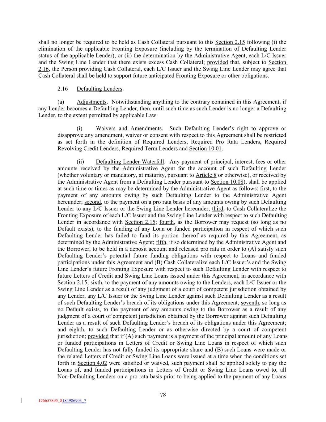 shall no longer be required to be held as Cash Collateral pursuant to this Section 2.15 following (i) the elimination of the applicable Fronting Exposure (including by the termination of Defaulting Lender status of the applicable Lender), or (ii) the determination by the Administrative Agent, each L/C Issuer and the Swing Line Lender that there exists excess Cash Collateral; provided that, subject to Section 2.16, the Person providing Cash Collateral, each L/C Issuer and the Swing Line Lender may agree that Cash Collateral shall be held to support future anticipated Fronting Exposure or other obligations. 2.16 Defaulting Lenders. (a) Adjustments. Notwithstanding anything to the contrary contained in this Agreement, if any Lender becomes a Defaulting Lender, then, until such time as such Lender is no longer a Defaulting Lender, to the extent permitted by applicable Law: (i) Waivers and Amendments. Such Defaulting Lender’s right to approve or disapprove any amendment, waiver or consent with respect to this Agreement shall be restricted as set forth in the definition of Required Lenders, Required Pro Rata Lenders, Required Revolving Credit Lenders, Required Term Lenders and Section 10.01. (ii) Defaulting Lender Waterfall. Any payment of principal, interest, fees or other amounts received by the Administrative Agent for the account of such Defaulting Lender (whether voluntary or mandatory, at maturity, pursuant to Article 8 or otherwise), or received by the Administrative Agent from a Defaulting Lender pursuant to Section 10.08), shall be applied at such time or times as may be determined by the Administrative Agent as follows: first, to the payment of any amounts owing by such Defaulting Lender to the Administrative Agent hereunder; second, to the payment on a pro rata basis of any amounts owing by such Defaulting Lender to any L/C Issuer or the Swing Line Lender hereunder; third, to Cash Collateralize the Fronting Exposure of each L/C Issuer and the Swing Line Lender with respect to such Defaulting Lender in accordance with Section 2.15; fourth, as the Borrower may request (so long as no Default exists), to the funding of any Loan or funded participation in respect of which such Defaulting Lender has failed to fund its portion thereof as required by this Agreement, as determined by the Administrative Agent; fifth, if so determined by the Administrative Agent and the Borrower, to be held in a deposit account and released pro rata in order to (A) satisfy such Defaulting Lender’s potential future funding obligations with respect to Loans and funded participations under this Agreement and (B) Cash Collateralize each L/C Issuer’s and the Swing Line Lender’s future Fronting Exposure with respect to such Defaulting Lender with respect to future Letters of Credit and Swing Line Loans issued under this Agreement, in accordance with Section 2.15; sixth, to the payment of any amounts owing to the Lenders, each L/C Issuer or the Swing Line Lender as a result of any judgment of a court of competent jurisdiction obtained by any Lender, any L/C Issuer or the Swing Line Lender against such Defaulting Lender as a result of such Defaulting Lender’s breach of its obligations under this Agreement; seventh, so long as no Default exists, to the payment of any amounts owing to the Borrower as a result of any judgment of a court of competent jurisdiction obtained by the Borrower against such Defaulting Lender as a result of such Defaulting Lender’s breach of its obligations under this Agreement; and eighth, to such Defaulting Lender or as otherwise directed by a court of competent jurisdiction; provided that if (A) such payment is a payment of the principal amount of any Loans or funded participations in Letters of Credit or Swing Line Loans in respect of which such Defaulting Lender has not fully funded its appropriate share and (B) such Loans were made or the related Letters of Credit or Swing Line Loans were issued at a time when the conditions set forth in Section 4.02 were satisfied or waived, such payment shall be applied solely to pay the Loans of, and funded participations in Letters of Credit or Swing Line Loans owed to, all Non-Defaulting Lenders on a pro rata basis prior to being applied to the payment of any Loans 78 176657895_8184986903_7