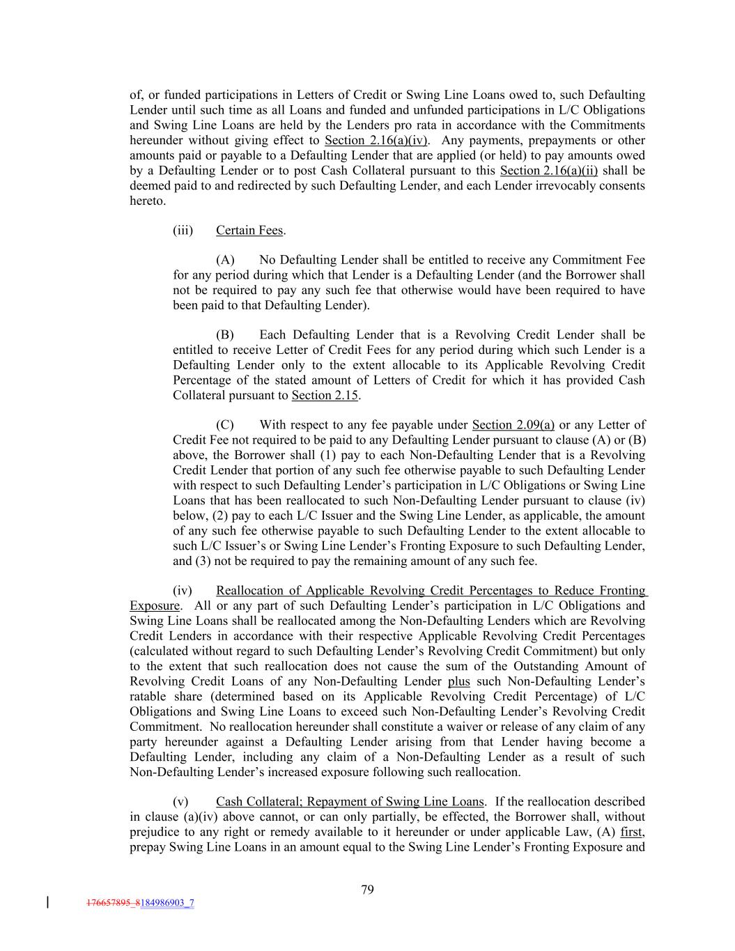 of, or funded participations in Letters of Credit or Swing Line Loans owed to, such Defaulting Lender until such time as all Loans and funded and unfunded participations in L/C Obligations and Swing Line Loans are held by the Lenders pro rata in accordance with the Commitments hereunder without giving effect to Section 2.16(a)(iv). Any payments, prepayments or other amounts paid or payable to a Defaulting Lender that are applied (or held) to pay amounts owed by a Defaulting Lender or to post Cash Collateral pursuant to this Section 2.16(a)(ii) shall be deemed paid to and redirected by such Defaulting Lender, and each Lender irrevocably consents hereto. (iii) Certain Fees. (A) No Defaulting Lender shall be entitled to receive any Commitment Fee for any period during which that Lender is a Defaulting Lender (and the Borrower shall not be required to pay any such fee that otherwise would have been required to have been paid to that Defaulting Lender). (B) Each Defaulting Lender that is a Revolving Credit Lender shall be entitled to receive Letter of Credit Fees for any period during which such Lender is a Defaulting Lender only to the extent allocable to its Applicable Revolving Credit Percentage of the stated amount of Letters of Credit for which it has provided Cash Collateral pursuant to Section 2.15. (C) With respect to any fee payable under Section 2.09(a) or any Letter of Credit Fee not required to be paid to any Defaulting Lender pursuant to clause (A) or (B) above, the Borrower shall (1) pay to each Non-Defaulting Lender that is a Revolving Credit Lender that portion of any such fee otherwise payable to such Defaulting Lender with respect to such Defaulting Lender’s participation in L/C Obligations or Swing Line Loans that has been reallocated to such Non-Defaulting Lender pursuant to clause (iv) below, (2) pay to each L/C Issuer and the Swing Line Lender, as applicable, the amount of any such fee otherwise payable to such Defaulting Lender to the extent allocable to such L/C Issuer’s or Swing Line Lender’s Fronting Exposure to such Defaulting Lender, and (3) not be required to pay the remaining amount of any such fee. (iv) Reallocation of Applicable Revolving Credit Percentages to Reduce Fronting Exposure. All or any part of such Defaulting Lender’s participation in L/C Obligations and Swing Line Loans shall be reallocated among the Non-Defaulting Lenders which are Revolving Credit Lenders in accordance with their respective Applicable Revolving Credit Percentages (calculated without regard to such Defaulting Lender’s Revolving Credit Commitment) but only to the extent that such reallocation does not cause the sum of the Outstanding Amount of Revolving Credit Loans of any Non-Defaulting Lender plus such Non-Defaulting Lender’s ratable share (determined based on its Applicable Revolving Credit Percentage) of L/C Obligations and Swing Line Loans to exceed such Non-Defaulting Lender’s Revolving Credit Commitment. No reallocation hereunder shall constitute a waiver or release of any claim of any party hereunder against a Defaulting Lender arising from that Lender having become a Defaulting Lender, including any claim of a Non-Defaulting Lender as a result of such Non-Defaulting Lender’s increased exposure following such reallocation. (v) Cash Collateral; Repayment of Swing Line Loans. If the reallocation described in clause (a)(iv) above cannot, or can only partially, be effected, the Borrower shall, without prejudice to any right or remedy available to it hereunder or under applicable Law, (A) first, prepay Swing Line Loans in an amount equal to the Swing Line Lender’s Fronting Exposure and 79 176657895_8184986903_7
