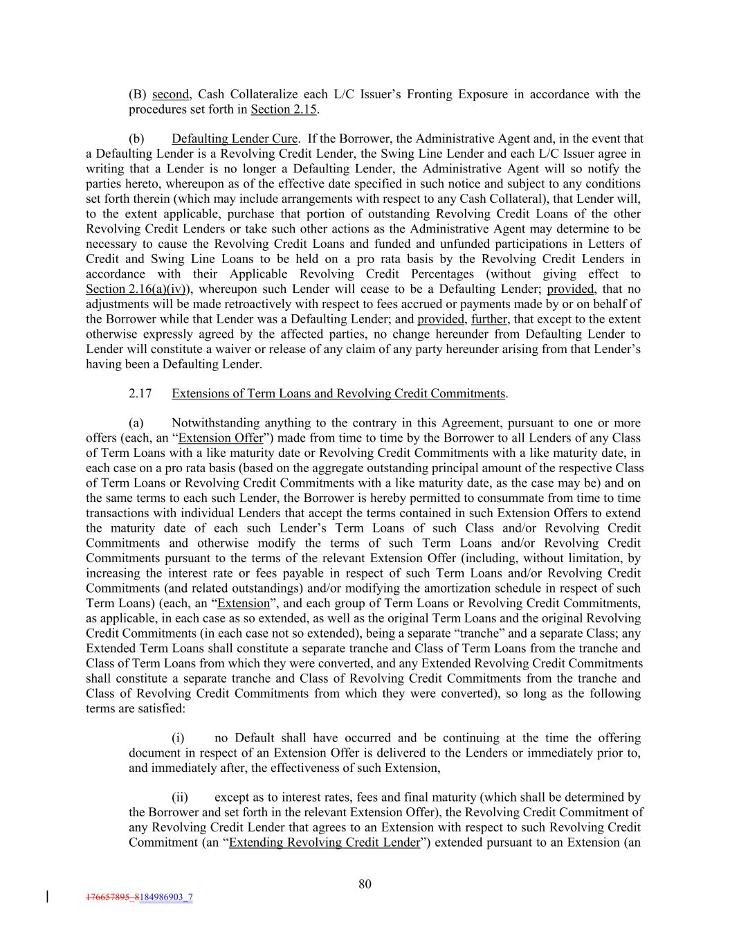 (B) second, Cash Collateralize each L/C Issuer’s Fronting Exposure in accordance with the procedures set forth in Section 2.15. (b) Defaulting Lender Cure. If the Borrower, the Administrative Agent and, in the event that a Defaulting Lender is a Revolving Credit Lender, the Swing Line Lender and each L/C Issuer agree in writing that a Lender is no longer a Defaulting Lender, the Administrative Agent will so notify the parties hereto, whereupon as of the effective date specified in such notice and subject to any conditions set forth therein (which may include arrangements with respect to any Cash Collateral), that Lender will, to the extent applicable, purchase that portion of outstanding Revolving Credit Loans of the other Revolving Credit Lenders or take such other actions as the Administrative Agent may determine to be necessary to cause the Revolving Credit Loans and funded and unfunded participations in Letters of Credit and Swing Line Loans to be held on a pro rata basis by the Revolving Credit Lenders in accordance with their Applicable Revolving Credit Percentages (without giving effect to Section 2.16(a)(iv)), whereupon such Lender will cease to be a Defaulting Lender; provided, that no adjustments will be made retroactively with respect to fees accrued or payments made by or on behalf of the Borrower while that Lender was a Defaulting Lender; and provided, further, that except to the extent otherwise expressly agreed by the affected parties, no change hereunder from Defaulting Lender to Lender will constitute a waiver or release of any claim of any party hereunder arising from that Lender’s having been a Defaulting Lender. 2.17 Extensions of Term Loans and Revolving Credit Commitments. (a) Notwithstanding anything to the contrary in this Agreement, pursuant to one or more offers (each, an “Extension Offer”) made from time to time by the Borrower to all Lenders of any Class of Term Loans with a like maturity date or Revolving Credit Commitments with a like maturity date, in each case on a pro rata basis (based on the aggregate outstanding principal amount of the respective Class of Term Loans or Revolving Credit Commitments with a like maturity date, as the case may be) and on the same terms to each such Lender, the Borrower is hereby permitted to consummate from time to time transactions with individual Lenders that accept the terms contained in such Extension Offers to extend the maturity date of each such Lender’s Term Loans of such Class and/or Revolving Credit Commitments and otherwise modify the terms of such Term Loans and/or Revolving Credit Commitments pursuant to the terms of the relevant Extension Offer (including, without limitation, by increasing the interest rate or fees payable in respect of such Term Loans and/or Revolving Credit Commitments (and related outstandings) and/or modifying the amortization schedule in respect of such Term Loans) (each, an “Extension”, and each group of Term Loans or Revolving Credit Commitments, as applicable, in each case as so extended, as well as the original Term Loans and the original Revolving Credit Commitments (in each case not so extended), being a separate “tranche” and a separate Class; any Extended Term Loans shall constitute a separate tranche and Class of Term Loans from the tranche and Class of Term Loans from which they were converted, and any Extended Revolving Credit Commitments shall constitute a separate tranche and Class of Revolving Credit Commitments from the tranche and Class of Revolving Credit Commitments from which they were converted), so long as the following terms are satisfied: (i) no Default shall have occurred and be continuing at the time the offering document in respect of an Extension Offer is delivered to the Lenders or immediately prior to, and immediately after, the effectiveness of such Extension, (ii) except as to interest rates, fees and final maturity (which shall be determined by the Borrower and set forth in the relevant Extension Offer), the Revolving Credit Commitment of any Revolving Credit Lender that agrees to an Extension with respect to such Revolving Credit Commitment (an “Extending Revolving Credit Lender”) extended pursuant to an Extension (an 80 176657895_8184986903_7
