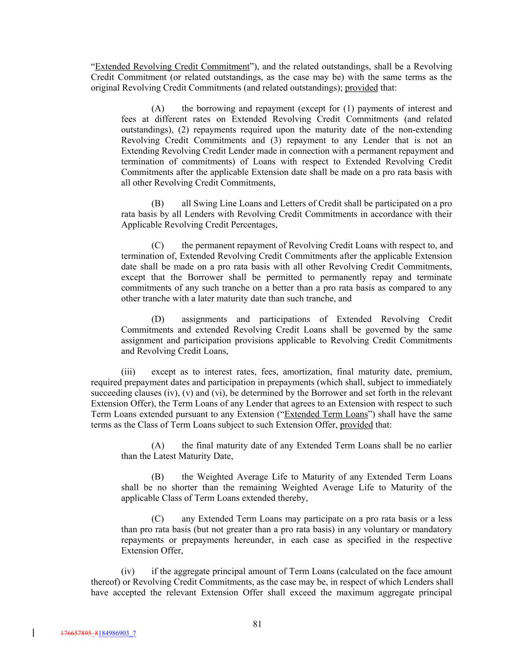 “Extended Revolving Credit Commitment”), and the related outstandings, shall be a Revolving Credit Commitment (or related outstandings, as the case may be) with the same terms as the original Revolving Credit Commitments (and related outstandings); provided that: (A) the borrowing and repayment (except for (1) payments of interest and fees at different rates on Extended Revolving Credit Commitments (and related outstandings), (2) repayments required upon the maturity date of the non-extending Revolving Credit Commitments and (3) repayment to any Lender that is not an Extending Revolving Credit Lender made in connection with a permanent repayment and termination of commitments) of Loans with respect to Extended Revolving Credit Commitments after the applicable Extension date shall be made on a pro rata basis with all other Revolving Credit Commitments, (B) all Swing Line Loans and Letters of Credit shall be participated on a pro rata basis by all Lenders with Revolving Credit Commitments in accordance with their Applicable Revolving Credit Percentages, (C) the permanent repayment of Revolving Credit Loans with respect to, and termination of, Extended Revolving Credit Commitments after the applicable Extension date shall be made on a pro rata basis with all other Revolving Credit Commitments, except that the Borrower shall be permitted to permanently repay and terminate commitments of any such tranche on a better than a pro rata basis as compared to any other tranche with a later maturity date than such tranche, and (D) assignments and participations of Extended Revolving Credit Commitments and extended Revolving Credit Loans shall be governed by the same assignment and participation provisions applicable to Revolving Credit Commitments and Revolving Credit Loans, (iii) except as to interest rates, fees, amortization, final maturity date, premium, required prepayment dates and participation in prepayments (which shall, subject to immediately succeeding clauses (iv), (v) and (vi), be determined by the Borrower and set forth in the relevant Extension Offer), the Term Loans of any Lender that agrees to an Extension with respect to such Term Loans extended pursuant to any Extension (“Extended Term Loans”) shall have the same terms as the Class of Term Loans subject to such Extension Offer, provided that: (A) the final maturity date of any Extended Term Loans shall be no earlier than the Latest Maturity Date, (B) the Weighted Average Life to Maturity of any Extended Term Loans shall be no shorter than the remaining Weighted Average Life to Maturity of the applicable Class of Term Loans extended thereby, (C) any Extended Term Loans may participate on a pro rata basis or a less than pro rata basis (but not greater than a pro rata basis) in any voluntary or mandatory repayments or prepayments hereunder, in each case as specified in the respective Extension Offer, (iv) if the aggregate principal amount of Term Loans (calculated on the face amount thereof) or Revolving Credit Commitments, as the case may be, in respect of which Lenders shall have accepted the relevant Extension Offer shall exceed the maximum aggregate principal 81 176657895_8184986903_7