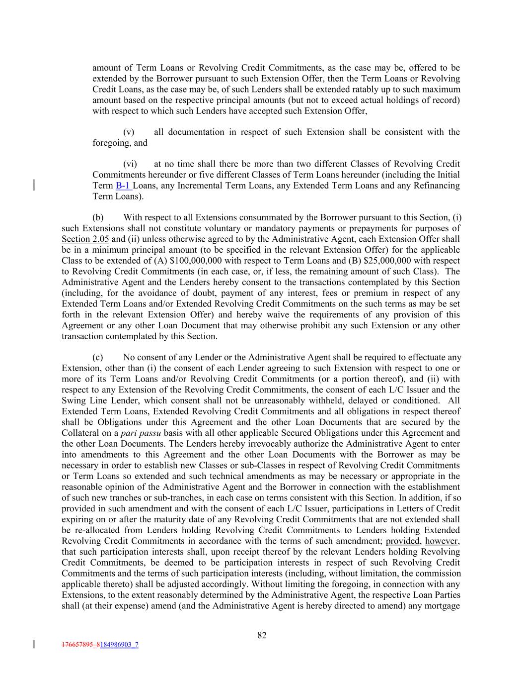 amount of Term Loans or Revolving Credit Commitments, as the case may be, offered to be extended by the Borrower pursuant to such Extension Offer, then the Term Loans or Revolving Credit Loans, as the case may be, of such Lenders shall be extended ratably up to such maximum amount based on the respective principal amounts (but not to exceed actual holdings of record) with respect to which such Lenders have accepted such Extension Offer, (v) all documentation in respect of such Extension shall be consistent with the foregoing, and (vi) at no time shall there be more than two different Classes of Revolving Credit Commitments hereunder or five different Classes of Term Loans hereunder (including the Initial Term B-1 Loans, any Incremental Term Loans, any Extended Term Loans and any Refinancing Term Loans). (b) With respect to all Extensions consummated by the Borrower pursuant to this Section, (i) such Extensions shall not constitute voluntary or mandatory payments or prepayments for purposes of Section 2.05 and (ii) unless otherwise agreed to by the Administrative Agent, each Extension Offer shall be in a minimum principal amount (to be specified in the relevant Extension Offer) for the applicable Class to be extended of (A) $100,000,000 with respect to Term Loans and (B) $25,000,000 with respect to Revolving Credit Commitments (in each case, or, if less, the remaining amount of such Class). The Administrative Agent and the Lenders hereby consent to the transactions contemplated by this Section (including, for the avoidance of doubt, payment of any interest, fees or premium in respect of any Extended Term Loans and/or Extended Revolving Credit Commitments on the such terms as may be set forth in the relevant Extension Offer) and hereby waive the requirements of any provision of this Agreement or any other Loan Document that may otherwise prohibit any such Extension or any other transaction contemplated by this Section. (c) No consent of any Lender or the Administrative Agent shall be required to effectuate any Extension, other than (i) the consent of each Lender agreeing to such Extension with respect to one or more of its Term Loans and/or Revolving Credit Commitments (or a portion thereof), and (ii) with respect to any Extension of the Revolving Credit Commitments, the consent of each L/C Issuer and the Swing Line Lender, which consent shall not be unreasonably withheld, delayed or conditioned. All Extended Term Loans, Extended Revolving Credit Commitments and all obligations in respect thereof shall be Obligations under this Agreement and the other Loan Documents that are secured by the Collateral on a pari passu basis with all other applicable Secured Obligations under this Agreement and the other Loan Documents. The Lenders hereby irrevocably authorize the Administrative Agent to enter into amendments to this Agreement and the other Loan Documents with the Borrower as may be necessary in order to establish new Classes or sub-Classes in respect of Revolving Credit Commitments or Term Loans so extended and such technical amendments as may be necessary or appropriate in the reasonable opinion of the Administrative Agent and the Borrower in connection with the establishment of such new tranches or sub-tranches, in each case on terms consistent with this Section. In addition, if so provided in such amendment and with the consent of each L/C Issuer, participations in Letters of Credit expiring on or after the maturity date of any Revolving Credit Commitments that are not extended shall be re-allocated from Lenders holding Revolving Credit Commitments to Lenders holding Extended Revolving Credit Commitments in accordance with the terms of such amendment; provided, however, that such participation interests shall, upon receipt thereof by the relevant Lenders holding Revolving Credit Commitments, be deemed to be participation interests in respect of such Revolving Credit Commitments and the terms of such participation interests (including, without limitation, the commission applicable thereto) shall be adjusted accordingly. Without limiting the foregoing, in connection with any Extensions, to the extent reasonably determined by the Administrative Agent, the respective Loan Parties shall (at their expense) amend (and the Administrative Agent is hereby directed to amend) any mortgage 82 176657895_8184986903_7
