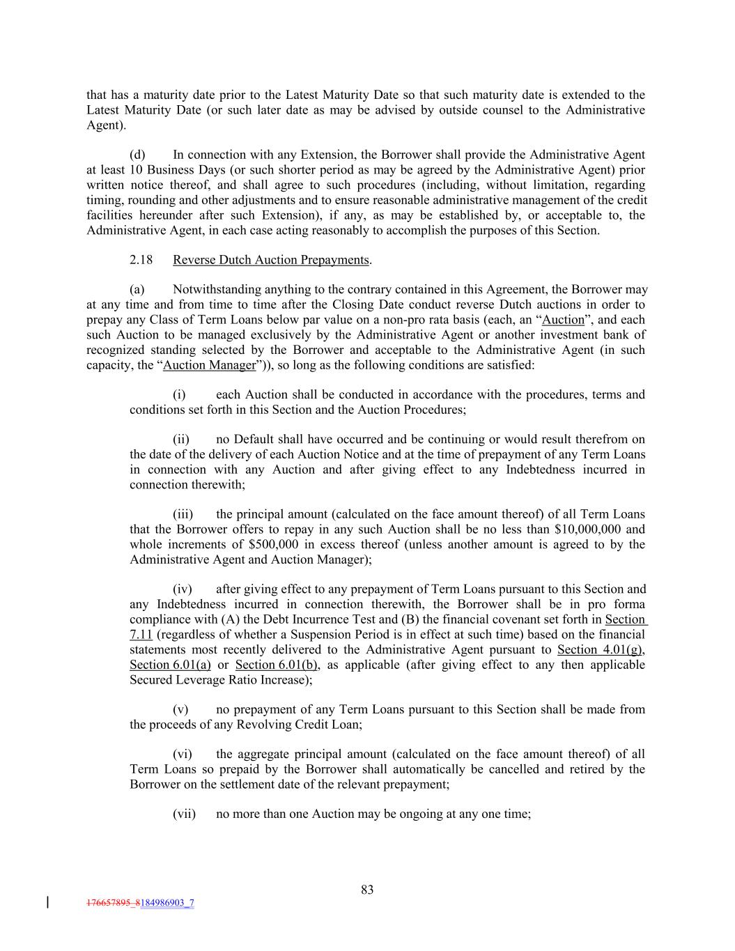 that has a maturity date prior to the Latest Maturity Date so that such maturity date is extended to the Latest Maturity Date (or such later date as may be advised by outside counsel to the Administrative Agent). (d) In connection with any Extension, the Borrower shall provide the Administrative Agent at least 10 Business Days (or such shorter period as may be agreed by the Administrative Agent) prior written notice thereof, and shall agree to such procedures (including, without limitation, regarding timing, rounding and other adjustments and to ensure reasonable administrative management of the credit facilities hereunder after such Extension), if any, as may be established by, or acceptable to, the Administrative Agent, in each case acting reasonably to accomplish the purposes of this Section. 2.18 Reverse Dutch Auction Prepayments. (a) Notwithstanding anything to the contrary contained in this Agreement, the Borrower may at any time and from time to time after the Closing Date conduct reverse Dutch auctions in order to prepay any Class of Term Loans below par value on a non-pro rata basis (each, an “Auction”, and each such Auction to be managed exclusively by the Administrative Agent or another investment bank of recognized standing selected by the Borrower and acceptable to the Administrative Agent (in such capacity, the “Auction Manager”)), so long as the following conditions are satisfied: (i) each Auction shall be conducted in accordance with the procedures, terms and conditions set forth in this Section and the Auction Procedures; (ii) no Default shall have occurred and be continuing or would result therefrom on the date of the delivery of each Auction Notice and at the time of prepayment of any Term Loans in connection with any Auction and after giving effect to any Indebtedness incurred in connection therewith; (iii) the principal amount (calculated on the face amount thereof) of all Term Loans that the Borrower offers to repay in any such Auction shall be no less than $10,000,000 and whole increments of $500,000 in excess thereof (unless another amount is agreed to by the Administrative Agent and Auction Manager); (iv) after giving effect to any prepayment of Term Loans pursuant to this Section and any Indebtedness incurred in connection therewith, the Borrower shall be in pro forma compliance with (A) the Debt Incurrence Test and (B) the financial covenant set forth in Section 7.11 (regardless of whether a Suspension Period is in effect at such time) based on the financial statements most recently delivered to the Administrative Agent pursuant to Section 4.01(g), Section 6.01(a) or Section 6.01(b), as applicable (after giving effect to any then applicable Secured Leverage Ratio Increase); (v) no prepayment of any Term Loans pursuant to this Section shall be made from the proceeds of any Revolving Credit Loan; (vi) the aggregate principal amount (calculated on the face amount thereof) of all Term Loans so prepaid by the Borrower shall automatically be cancelled and retired by the Borrower on the settlement date of the relevant prepayment; (vii) no more than one Auction may be ongoing at any one time; 83 176657895_8184986903_7