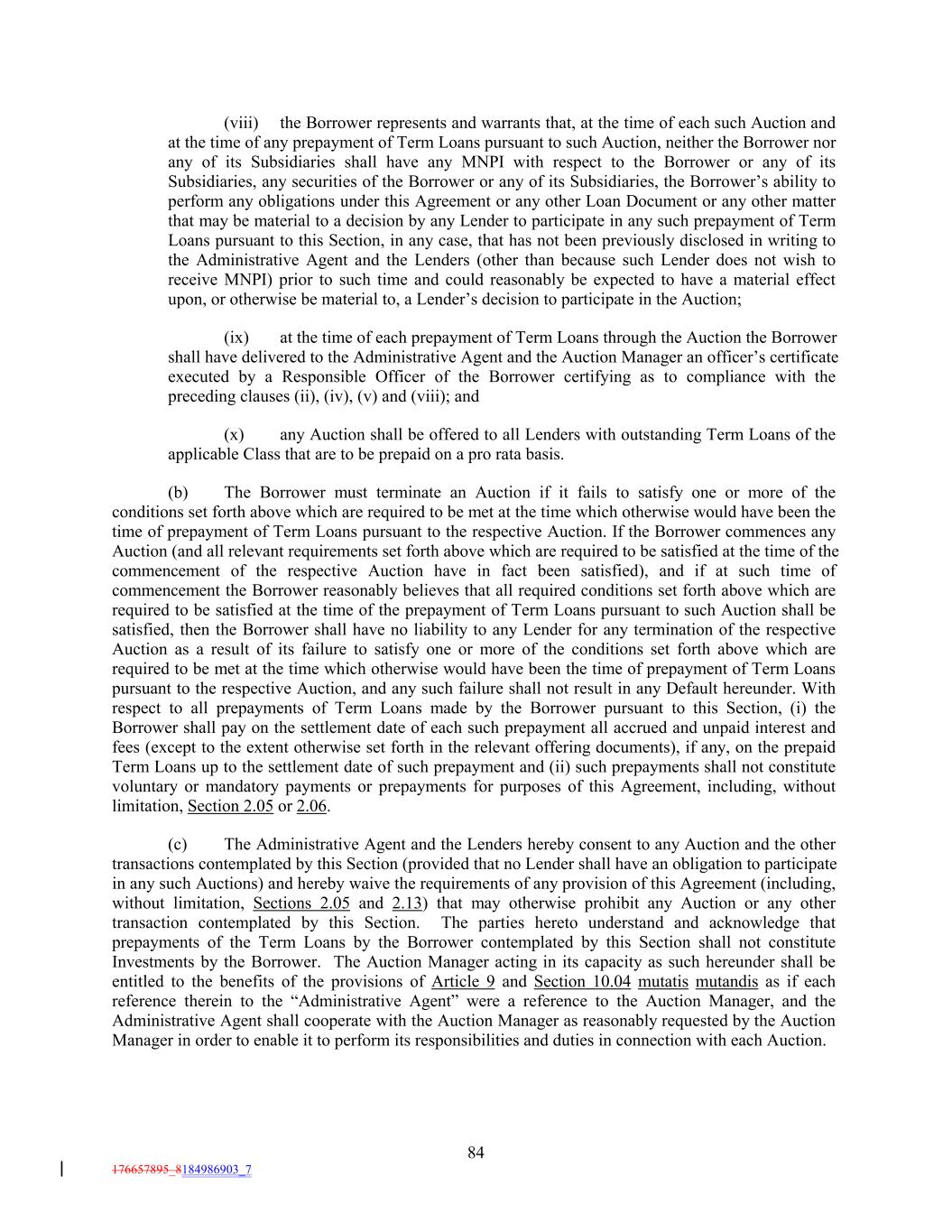 (viii) the Borrower represents and warrants that, at the time of each such Auction and at the time of any prepayment of Term Loans pursuant to such Auction, neither the Borrower nor any of its Subsidiaries shall have any MNPI with respect to the Borrower or any of its Subsidiaries, any securities of the Borrower or any of its Subsidiaries, the Borrower’s ability to perform any obligations under this Agreement or any other Loan Document or any other matter that may be material to a decision by any Lender to participate in any such prepayment of Term Loans pursuant to this Section, in any case, that has not been previously disclosed in writing to the Administrative Agent and the Lenders (other than because such Lender does not wish to receive MNPI) prior to such time and could reasonably be expected to have a material effect upon, or otherwise be material to, a Lender’s decision to participate in the Auction; (ix) at the time of each prepayment of Term Loans through the Auction the Borrower shall have delivered to the Administrative Agent and the Auction Manager an officer’s certificate executed by a Responsible Officer of the Borrower certifying as to compliance with the preceding clauses (ii), (iv), (v) and (viii); and (x) any Auction shall be offered to all Lenders with outstanding Term Loans of the applicable Class that are to be prepaid on a pro rata basis. (b) The Borrower must terminate an Auction if it fails to satisfy one or more of the conditions set forth above which are required to be met at the time which otherwise would have been the time of prepayment of Term Loans pursuant to the respective Auction. If the Borrower commences any Auction (and all relevant requirements set forth above which are required to be satisfied at the time of the commencement of the respective Auction have in fact been satisfied), and if at such time of commencement the Borrower reasonably believes that all required conditions set forth above which are required to be satisfied at the time of the prepayment of Term Loans pursuant to such Auction shall be satisfied, then the Borrower shall have no liability to any Lender for any termination of the respective Auction as a result of its failure to satisfy one or more of the conditions set forth above which are required to be met at the time which otherwise would have been the time of prepayment of Term Loans pursuant to the respective Auction, and any such failure shall not result in any Default hereunder. With respect to all prepayments of Term Loans made by the Borrower pursuant to this Section, (i) the Borrower shall pay on the settlement date of each such prepayment all accrued and unpaid interest and fees (except to the extent otherwise set forth in the relevant offering documents), if any, on the prepaid Term Loans up to the settlement date of such prepayment and (ii) such prepayments shall not constitute voluntary or mandatory payments or prepayments for purposes of this Agreement, including, without limitation, Section 2.05 or 2.06. (c) The Administrative Agent and the Lenders hereby consent to any Auction and the other transactions contemplated by this Section (provided that no Lender shall have an obligation to participate in any such Auctions) and hereby waive the requirements of any provision of this Agreement (including, without limitation, Sections 2.05 and 2.13) that may otherwise prohibit any Auction or any other transaction contemplated by this Section. The parties hereto understand and acknowledge that prepayments of the Term Loans by the Borrower contemplated by this Section shall not constitute Investments by the Borrower. The Auction Manager acting in its capacity as such hereunder shall be entitled to the benefits of the provisions of Article 9 and Section 10.04 mutatis mutandis as if each reference therein to the “Administrative Agent” were a reference to the Auction Manager, and the Administrative Agent shall cooperate with the Auction Manager as reasonably requested by the Auction Manager in order to enable it to perform its responsibilities and duties in connection with each Auction. 84 176657895_8184986903_7
