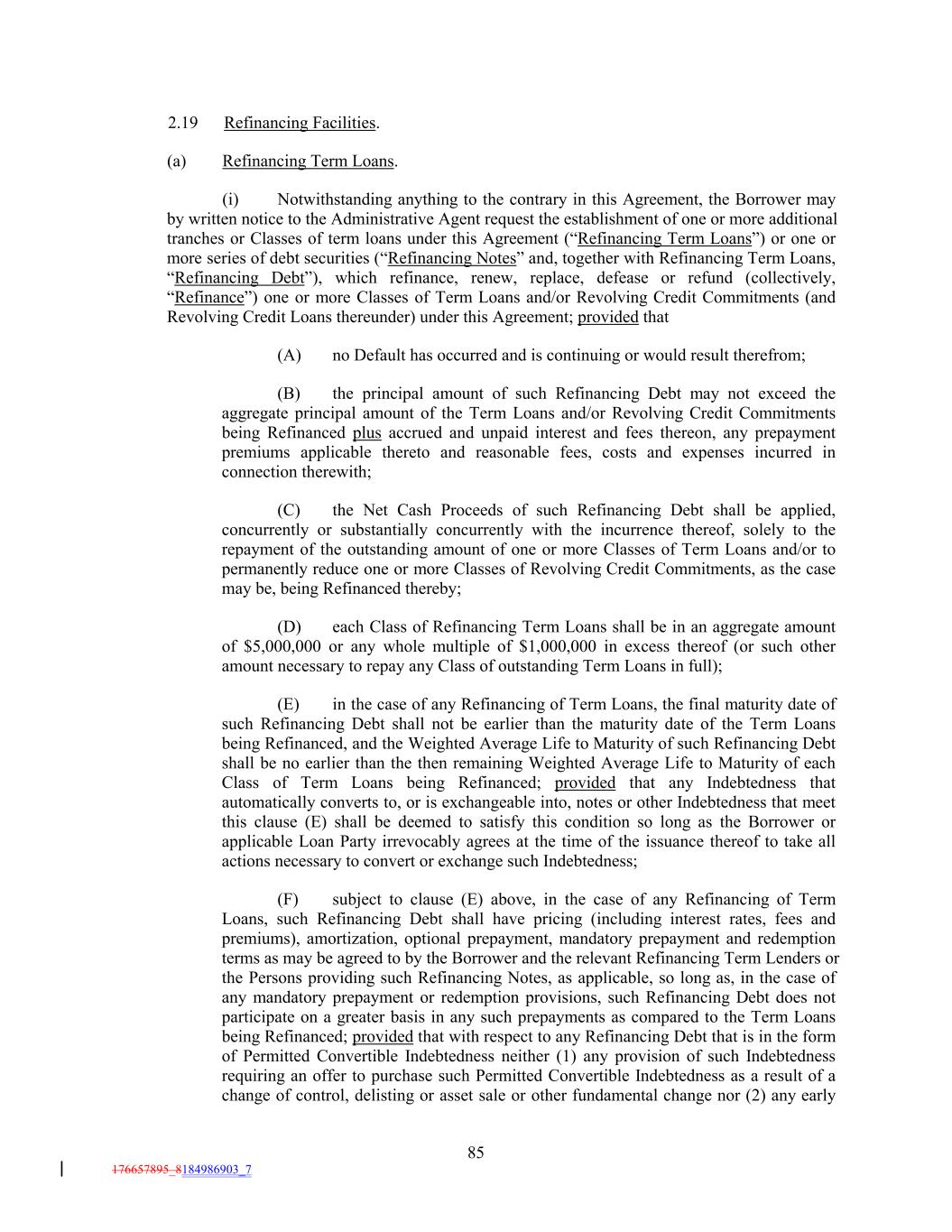 2.19 Refinancing Facilities. (a) Refinancing Term Loans. (i) Notwithstanding anything to the contrary in this Agreement, the Borrower may by written notice to the Administrative Agent request the establishment of one or more additional tranches or Classes of term loans under this Agreement (“Refinancing Term Loans”) or one or more series of debt securities (“Refinancing Notes” and, together with Refinancing Term Loans, “Refinancing Debt”), which refinance, renew, replace, defease or refund (collectively, “Refinance”) one or more Classes of Term Loans and/or Revolving Credit Commitments (and Revolving Credit Loans thereunder) under this Agreement; provided that (A) no Default has occurred and is continuing or would result therefrom; (B) the principal amount of such Refinancing Debt may not exceed the aggregate principal amount of the Term Loans and/or Revolving Credit Commitments being Refinanced plus accrued and unpaid interest and fees thereon, any prepayment premiums applicable thereto and reasonable fees, costs and expenses incurred in connection therewith; (C) the Net Cash Proceeds of such Refinancing Debt shall be applied, concurrently or substantially concurrently with the incurrence thereof, solely to the repayment of the outstanding amount of one or more Classes of Term Loans and/or to permanently reduce one or more Classes of Revolving Credit Commitments, as the case may be, being Refinanced thereby; (D) each Class of Refinancing Term Loans shall be in an aggregate amount of $5,000,000 or any whole multiple of $1,000,000 in excess thereof (or such other amount necessary to repay any Class of outstanding Term Loans in full); (E) in the case of any Refinancing of Term Loans, the final maturity date of such Refinancing Debt shall not be earlier than the maturity date of the Term Loans being Refinanced, and the Weighted Average Life to Maturity of such Refinancing Debt shall be no earlier than the then remaining Weighted Average Life to Maturity of each Class of Term Loans being Refinanced; provided that any Indebtedness that automatically converts to, or is exchangeable into, notes or other Indebtedness that meet this clause (E) shall be deemed to satisfy this condition so long as the Borrower or applicable Loan Party irrevocably agrees at the time of the issuance thereof to take all actions necessary to convert or exchange such Indebtedness; (F) subject to clause (E) above, in the case of any Refinancing of Term Loans, such Refinancing Debt shall have pricing (including interest rates, fees and premiums), amortization, optional prepayment, mandatory prepayment and redemption terms as may be agreed to by the Borrower and the relevant Refinancing Term Lenders or the Persons providing such Refinancing Notes, as applicable, so long as, in the case of any mandatory prepayment or redemption provisions, such Refinancing Debt does not participate on a greater basis in any such prepayments as compared to the Term Loans being Refinanced; provided that with respect to any Refinancing Debt that is in the form of Permitted Convertible Indebtedness neither (1) any provision of such Indebtedness requiring an offer to purchase such Permitted Convertible Indebtedness as a result of a change of control, delisting or asset sale or other fundamental change nor (2) any early 85 176657895_8184986903_7