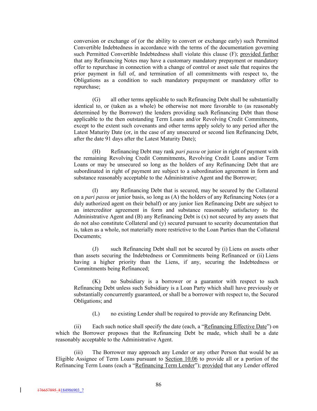 conversion or exchange of (or the ability to convert or exchange early) such Permitted Convertible Indebtedness in accordance with the terms of the documentation governing such Permitted Convertible Indebtedness shall violate this clause (F); provided further that any Refinancing Notes may have a customary mandatory prepayment or mandatory offer to repurchase in connection with a change of control or asset sale that requires the prior payment in full of, and termination of all commitments with respect to, the Obligations as a condition to such mandatory prepayment or mandatory offer to repurchase; (G) all other terms applicable to such Refinancing Debt shall be substantially identical to, or (taken as a whole) be otherwise not more favorable to (as reasonably determined by the Borrower) the lenders providing such Refinancing Debt than those applicable to the then outstanding Term Loans and/or Revolving Credit Commitments, except to the extent such covenants and other terms apply solely to any period after the Latest Maturity Date (or, in the case of any unsecured or second lien Refinancing Debt, after the date 91 days after the Latest Maturity Date); (H) Refinancing Debt may rank pari passu or junior in right of payment with the remaining Revolving Credit Commitments, Revolving Credit Loans and/or Term Loans or may be unsecured so long as the holders of any Refinancing Debt that are subordinated in right of payment are subject to a subordination agreement in form and substance reasonably acceptable to the Administrative Agent and the Borrower; (I) any Refinancing Debt that is secured, may be secured by the Collateral on a pari passu or junior basis, so long as (A) the holders of any Refinancing Notes (or a duly authorized agent on their behalf) or any junior lien Refinancing Debt are subject to an intercreditor agreement in form and substance reasonably satisfactory to the Administrative Agent and (B) any Refinancing Debt is (x) not secured by any assets that do not also constitute Collateral and (y) secured pursuant to security documentation that is, taken as a whole, not materially more restrictive to the Loan Parties than the Collateral Documents; (J) such Refinancing Debt shall not be secured by (i) Liens on assets other than assets securing the Indebtedness or Commitments being Refinanced or (ii) Liens having a higher priority than the Liens, if any, securing the Indebtedness or Commitments being Refinanced; (K) no Subsidiary is a borrower or a guarantor with respect to such Refinancing Debt unless such Subsidiary is a Loan Party which shall have previously or substantially concurrently guaranteed, or shall be a borrower with respect to, the Secured Obligations; and (L) no existing Lender shall be required to provide any Refinancing Debt. (ii) Each such notice shall specify the date (each, a “Refinancing Effective Date”) on which the Borrower proposes that the Refinancing Debt be made, which shall be a date reasonably acceptable to the Administrative Agent. (iii) The Borrower may approach any Lender or any other Person that would be an Eligible Assignee of Term Loans pursuant to Section 10.06 to provide all or a portion of the Refinancing Term Loans (each a “Refinancing Term Lender”); provided that any Lender offered 86 176657895_8184986903_7