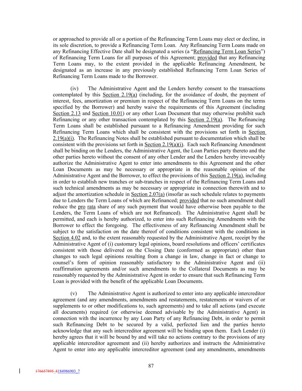 or approached to provide all or a portion of the Refinancing Term Loans may elect or decline, in its sole discretion, to provide a Refinancing Term Loan. Any Refinancing Term Loans made on any Refinancing Effective Date shall be designated a series (a “Refinancing Term Loan Series”) of Refinancing Term Loans for all purposes of this Agreement; provided that any Refinancing Term Loans may, to the extent provided in the applicable Refinancing Amendment, be designated as an increase in any previously established Refinancing Term Loan Series of Refinancing Term Loans made to the Borrower. (iv) The Administrative Agent and the Lenders hereby consent to the transactions contemplated by this Section 2.19(a) (including, for the avoidance of doubt, the payment of interest, fees, amortization or premium in respect of the Refinancing Term Loans on the terms specified by the Borrower) and hereby waive the requirements of this Agreement (including Section 2.13 and Section 10.01) or any other Loan Document that may otherwise prohibit such Refinancing or any other transaction contemplated by this Section 2.19(a). The Refinancing Term Loans shall be established pursuant to a Refinancing Amendment providing for such Refinancing Term Loans which shall be consistent with the provisions set forth in Section 2.19(a)(i). The Refinancing Notes shall be established pursuant to documentation which shall be consistent with the provisions set forth in Section 2.19(a)(i). Each such Refinancing Amendment shall be binding on the Lenders, the Administrative Agent, the Loan Parties party thereto and the other parties hereto without the consent of any other Lender and the Lenders hereby irrevocably authorize the Administrative Agent to enter into amendments to this Agreement and the other Loan Documents as may be necessary or appropriate in the reasonable opinion of the Administrative Agent and the Borrower, to effect the provisions of this Section 2.19(a), including in order to establish new tranches or sub-tranches in respect of the Refinancing Term Loans and such technical amendments as may be necessary or appropriate in connection therewith and to adjust the amortization schedule in Section 2.07(a) (insofar as such schedule relates to payments due to Lenders the Term Loans of which are Refinanced; provided that no such amendment shall reduce the pro rata share of any such payment that would have otherwise been payable to the Lenders, the Term Loans of which are not Refinanced). The Administrative Agent shall be permitted, and each is hereby authorized, to enter into such Refinancing Amendments with the Borrower to effect the foregoing. The effectiveness of any Refinancing Amendment shall be subject to the satisfaction on the date thereof of conditions consistent with the conditions in Section 4.02 and, to the extent reasonably requested by the Administrative Agent, receipt by the Administrative Agent of (i) customary legal opinions, board resolutions and officers’ certificates consistent with those delivered on the Closing Date (conformed as appropriate) other than changes to such legal opinions resulting from a change in law, change in fact or change to counsel’s form of opinion reasonably satisfactory to the Administrative Agent and (ii) reaffirmation agreements and/or such amendments to the Collateral Documents as may be reasonably requested by the Administrative Agent in order to ensure that such Refinancing Term Loan is provided with the benefit of the applicable Loan Documents. (v) The Administrative Agent is authorized to enter into any applicable intercreditor agreement (and any amendments, amendments and restatements, restatements or waivers of or supplements to or other modifications to, such agreements) and to take all actions (and execute all documents) required (or otherwise deemed advisable by the Administrative Agent) in connection with the incurrence by any Loan Party of any Refinancing Debt, in order to permit such Refinancing Debt to be secured by a valid, perfected lien and the parties hereto acknowledge that any such intercreditor agreement will be binding upon them. Each Lender (i) hereby agrees that it will be bound by and will take no actions contrary to the provisions of any applicable intercreditor agreement and (ii) hereby authorizes and instructs the Administrative Agent to enter into any applicable intercreditor agreement (and any amendments, amendments 87 176657895_8184986903_7