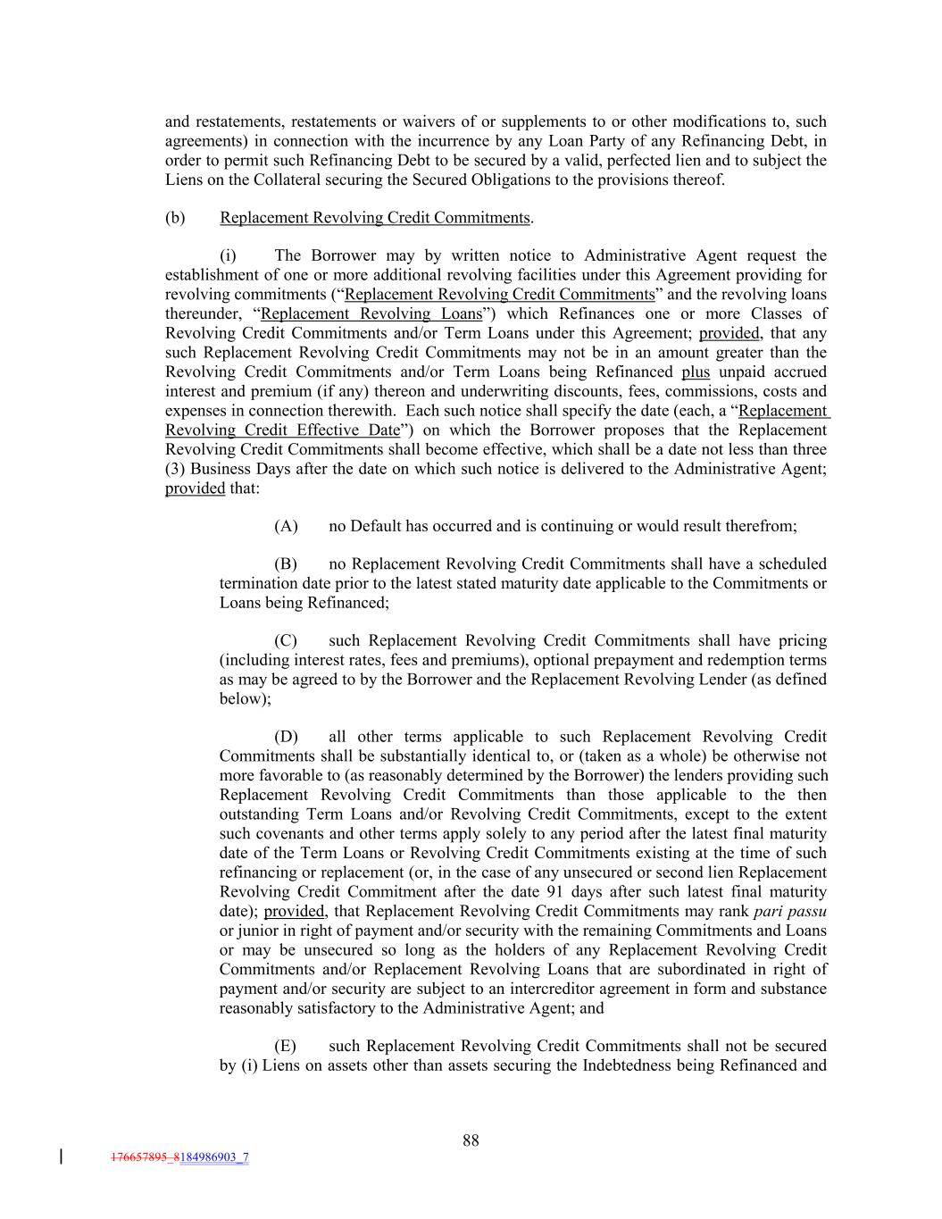 and restatements, restatements or waivers of or supplements to or other modifications to, such agreements) in connection with the incurrence by any Loan Party of any Refinancing Debt, in order to permit such Refinancing Debt to be secured by a valid, perfected lien and to subject the Liens on the Collateral securing the Secured Obligations to the provisions thereof. (b) Replacement Revolving Credit Commitments. (i) The Borrower may by written notice to Administrative Agent request the establishment of one or more additional revolving facilities under this Agreement providing for revolving commitments (“Replacement Revolving Credit Commitments” and the revolving loans thereunder, “Replacement Revolving Loans”) which Refinances one or more Classes of Revolving Credit Commitments and/or Term Loans under this Agreement; provided, that any such Replacement Revolving Credit Commitments may not be in an amount greater than the Revolving Credit Commitments and/or Term Loans being Refinanced plus unpaid accrued interest and premium (if any) thereon and underwriting discounts, fees, commissions, costs and expenses in connection therewith. Each such notice shall specify the date (each, a “Replacement Revolving Credit Effective Date”) on which the Borrower proposes that the Replacement Revolving Credit Commitments shall become effective, which shall be a date not less than three (3) Business Days after the date on which such notice is delivered to the Administrative Agent; provided that: (A) no Default has occurred and is continuing or would result therefrom; (B) no Replacement Revolving Credit Commitments shall have a scheduled termination date prior to the latest stated maturity date applicable to the Commitments or Loans being Refinanced; (C) such Replacement Revolving Credit Commitments shall have pricing (including interest rates, fees and premiums), optional prepayment and redemption terms as may be agreed to by the Borrower and the Replacement Revolving Lender (as defined below); (D) all other terms applicable to such Replacement Revolving Credit Commitments shall be substantially identical to, or (taken as a whole) be otherwise not more favorable to (as reasonably determined by the Borrower) the lenders providing such Replacement Revolving Credit Commitments than those applicable to the then outstanding Term Loans and/or Revolving Credit Commitments, except to the extent such covenants and other terms apply solely to any period after the latest final maturity date of the Term Loans or Revolving Credit Commitments existing at the time of such refinancing or replacement (or, in the case of any unsecured or second lien Replacement Revolving Credit Commitment after the date 91 days after such latest final maturity date); provided, that Replacement Revolving Credit Commitments may rank pari passu or junior in right of payment and/or security with the remaining Commitments and Loans or may be unsecured so long as the holders of any Replacement Revolving Credit Commitments and/or Replacement Revolving Loans that are subordinated in right of payment and/or security are subject to an intercreditor agreement in form and substance reasonably satisfactory to the Administrative Agent; and (E) such Replacement Revolving Credit Commitments shall not be secured by (i) Liens on assets other than assets securing the Indebtedness being Refinanced and 88 176657895_8184986903_7