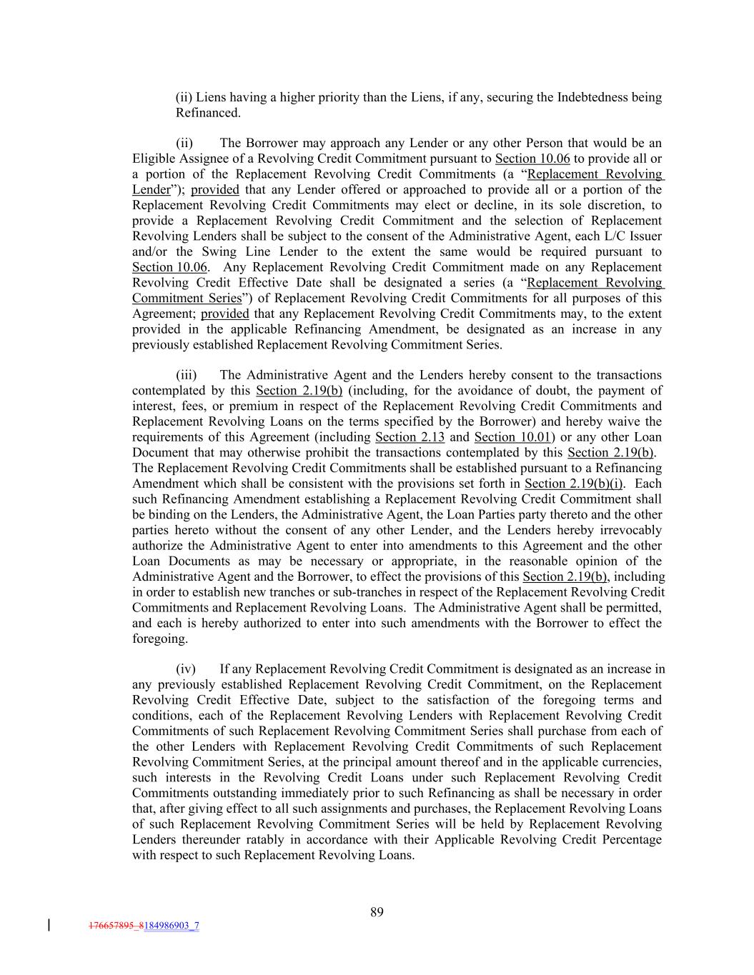 (ii) Liens having a higher priority than the Liens, if any, securing the Indebtedness being Refinanced. (ii) The Borrower may approach any Lender or any other Person that would be an Eligible Assignee of a Revolving Credit Commitment pursuant to Section 10.06 to provide all or a portion of the Replacement Revolving Credit Commitments (a “Replacement Revolving Lender”); provided that any Lender offered or approached to provide all or a portion of the Replacement Revolving Credit Commitments may elect or decline, in its sole discretion, to provide a Replacement Revolving Credit Commitment and the selection of Replacement Revolving Lenders shall be subject to the consent of the Administrative Agent, each L/C Issuer and/or the Swing Line Lender to the extent the same would be required pursuant to Section 10.06. Any Replacement Revolving Credit Commitment made on any Replacement Revolving Credit Effective Date shall be designated a series (a “Replacement Revolving Commitment Series”) of Replacement Revolving Credit Commitments for all purposes of this Agreement; provided that any Replacement Revolving Credit Commitments may, to the extent provided in the applicable Refinancing Amendment, be designated as an increase in any previously established Replacement Revolving Commitment Series. (iii) The Administrative Agent and the Lenders hereby consent to the transactions contemplated by this Section 2.19(b) (including, for the avoidance of doubt, the payment of interest, fees, or premium in respect of the Replacement Revolving Credit Commitments and Replacement Revolving Loans on the terms specified by the Borrower) and hereby waive the requirements of this Agreement (including Section 2.13 and Section 10.01) or any other Loan Document that may otherwise prohibit the transactions contemplated by this Section 2.19(b). The Replacement Revolving Credit Commitments shall be established pursuant to a Refinancing Amendment which shall be consistent with the provisions set forth in Section 2.19(b)(i). Each such Refinancing Amendment establishing a Replacement Revolving Credit Commitment shall be binding on the Lenders, the Administrative Agent, the Loan Parties party thereto and the other parties hereto without the consent of any other Lender, and the Lenders hereby irrevocably authorize the Administrative Agent to enter into amendments to this Agreement and the other Loan Documents as may be necessary or appropriate, in the reasonable opinion of the Administrative Agent and the Borrower, to effect the provisions of this Section 2.19(b), including in order to establish new tranches or sub-tranches in respect of the Replacement Revolving Credit Commitments and Replacement Revolving Loans. The Administrative Agent shall be permitted, and each is hereby authorized to enter into such amendments with the Borrower to effect the foregoing. (iv) If any Replacement Revolving Credit Commitment is designated as an increase in any previously established Replacement Revolving Credit Commitment, on the Replacement Revolving Credit Effective Date, subject to the satisfaction of the foregoing terms and conditions, each of the Replacement Revolving Lenders with Replacement Revolving Credit Commitments of such Replacement Revolving Commitment Series shall purchase from each of the other Lenders with Replacement Revolving Credit Commitments of such Replacement Revolving Commitment Series, at the principal amount thereof and in the applicable currencies, such interests in the Revolving Credit Loans under such Replacement Revolving Credit Commitments outstanding immediately prior to such Refinancing as shall be necessary in order that, after giving effect to all such assignments and purchases, the Replacement Revolving Loans of such Replacement Revolving Commitment Series will be held by Replacement Revolving Lenders thereunder ratably in accordance with their Applicable Revolving Credit Percentage with respect to such Replacement Revolving Loans. 89 176657895_8184986903_7