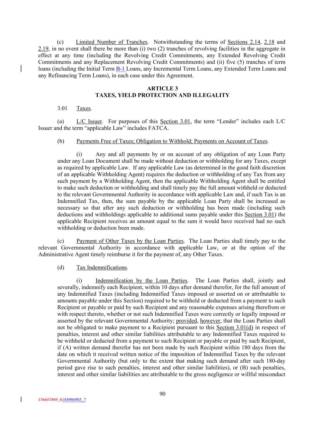 (c) Limited Number of Tranches. Notwithstanding the terms of Sections 2.14, 2.18 and 2.19, in no event shall there be more than (i) two (2) tranches of revolving facilities in the aggregate in effect at any time (including the Revolving Credit Commitments, any Extended Revolving Credit Commitments and any Replacement Revolving Credit Commitments) and (ii) five (5) tranches of term loans (including the Initial Term B-1 Loans, any Incremental Term Loans, any Extended Term Loans and any Refinancing Term Loans), in each case under this Agreement. ARTICLE 3 TAXES, YIELD PROTECTION AND ILLEGALITY 3.01 Taxes. (a) L/C Issuer. For purposes of this Section 3.01, the term “Lender” includes each L/C Issuer and the term “applicable Law” includes FATCA. (b) Payments Free of Taxes; Obligation to Withhold; Payments on Account of Taxes. (i) Any and all payments by or on account of any obligation of any Loan Party under any Loan Document shall be made without deduction or withholding for any Taxes, except as required by applicable Law. If any applicable Law (as determined in the good faith discretion of an applicable Withholding Agent) requires the deduction or withholding of any Tax from any such payment by a Withholding Agent, then the applicable Withholding Agent shall be entitled to make such deduction or withholding and shall timely pay the full amount withheld or deducted to the relevant Governmental Authority in accordance with applicable Law and, if such Tax is an Indemnified Tax, then, the sum payable by the applicable Loan Party shall be increased as necessary so that after any such deduction or withholding has been made (including such deductions and withholdings applicable to additional sums payable under this Section 3.01) the applicable Recipient receives an amount equal to the sum it would have received had no such withholding or deduction been made. (c) Payment of Other Taxes by the Loan Parties. The Loan Parties shall timely pay to the relevant Governmental Authority in accordance with applicable Law, or at the option of the Administrative Agent timely reimburse it for the payment of, any Other Taxes. (d) Tax Indemnifications. (i) Indemnification by the Loan Parties. The Loan Parties shall, jointly and severally, indemnify each Recipient, within 10 days after demand therefor, for the full amount of any Indemnified Taxes (including Indemnified Taxes imposed or asserted on or attributable to amounts payable under this Section) required to be withheld or deducted from a payment to such Recipient or payable or paid by such Recipient and any reasonable expenses arising therefrom or with respect thereto, whether or not such Indemnified Taxes were correctly or legally imposed or asserted by the relevant Governmental Authority; provided, however, that the Loan Parties shall not be obligated to make payment to a Recipient pursuant to this Section 3.01(d) in respect of penalties, interest and other similar liabilities attributable to any Indemnified Taxes required to be withheld or deducted from a payment to such Recipient or payable or paid by such Recipient, if (A) written demand therefor has not been made by such Recipient within 180 days from the date on which it received written notice of the imposition of Indemnified Taxes by the relevant Governmental Authority (but only to the extent that making such demand after such 180-day period gave rise to such penalties, interest and other similar liabilities), or (B) such penalties, interest and other similar liabilities are attributable to the gross negligence or willful misconduct 90 176657895_8184986903_7