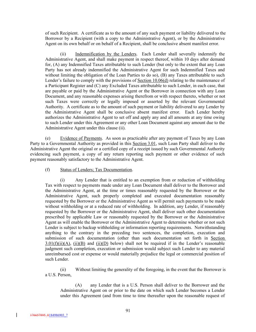 of such Recipient. A certificate as to the amount of any such payment or liability delivered to the Borrower by a Recipient (with a copy to the Administrative Agent), or by the Administrative Agent on its own behalf or on behalf of a Recipient, shall be conclusive absent manifest error. (ii) Indemnification by the Lenders. Each Lender shall severally indemnify the Administrative Agent, and shall make payment in respect thereof, within 10 days after demand for, (A) any Indemnified Taxes attributable to such Lender (but only to the extent that any Loan Party has not already indemnified the Administrative Agent for such Indemnified Taxes and without limiting the obligation of the Loan Parties to do so), (B) any Taxes attributable to such Lender’s failure to comply with the provisions of Section 10.06(d) relating to the maintenance of a Participant Register and (C) any Excluded Taxes attributable to such Lender, in each case, that are payable or paid by the Administrative Agent or the Borrower in connection with any Loan Document, and any reasonable expenses arising therefrom or with respect thereto, whether or not such Taxes were correctly or legally imposed or asserted by the relevant Governmental Authority. A certificate as to the amount of such payment or liability delivered to any Lender by the Administrative Agent shall be conclusive absent manifest error. Each Lender hereby authorizes the Administrative Agent to set off and apply any and all amounts at any time owing to such Lender under this Agreement or any other Loan Document against any amount due to the Administrative Agent under this clause (ii). (e) Evidence of Payments. As soon as practicable after any payment of Taxes by any Loan Party to a Governmental Authority as provided in this Section 3.01, such Loan Party shall deliver to the Administrative Agent the original or a certified copy of a receipt issued by such Governmental Authority evidencing such payment, a copy of any return reporting such payment or other evidence of such payment reasonably satisfactory to the Administrative Agent. (f) Status of Lenders; Tax Documentation. (i) Any Lender that is entitled to an exemption from or reduction of withholding Tax with respect to payments made under any Loan Document shall deliver to the Borrower and the Administrative Agent, at the time or times reasonably requested by the Borrower or the Administrative Agent, such properly completed and executed documentation reasonably requested by the Borrower or the Administrative Agent as will permit such payments to be made without withholding or at a reduced rate of withholding. In addition, any Lender, if reasonably requested by the Borrower or the Administrative Agent, shall deliver such other documentation prescribed by applicable Law or reasonably requested by the Borrower or the Administrative Agent as will enable the Borrower or the Administrative Agent to determine whether or not such Lender is subject to backup withholding or information reporting requirements. Notwithstanding anything to the contrary in the preceding two sentences, the completion, execution and submission of such documentation (other than such documentation set forth in Section 3.01(f)(ii)(A), (ii)(B) and (ii)(D) below) shall not be required if in the Lender’s reasonable judgment such completion, execution or submission would subject such Lender to any material unreimbursed cost or expense or would materially prejudice the legal or commercial position of such Lender. (ii) Without limiting the generality of the foregoing, in the event that the Borrower is a U.S. Person, (A) any Lender that is a U.S. Person shall deliver to the Borrower and the Administrative Agent on or prior to the date on which such Lender becomes a Lender under this Agreement (and from time to time thereafter upon the reasonable request of 91 176657895_8184986903_7