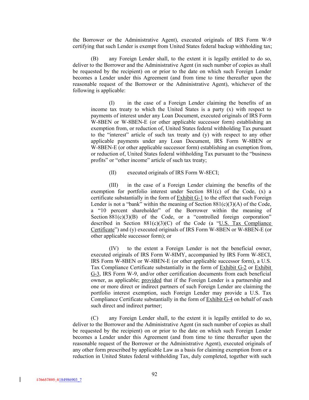the Borrower or the Administrative Agent), executed originals of IRS Form W-9 certifying that such Lender is exempt from United States federal backup withholding tax; (B) any Foreign Lender shall, to the extent it is legally entitled to do so, deliver to the Borrower and the Administrative Agent (in such number of copies as shall be requested by the recipient) on or prior to the date on which such Foreign Lender becomes a Lender under this Agreement (and from time to time thereafter upon the reasonable request of the Borrower or the Administrative Agent), whichever of the following is applicable: (I) in the case of a Foreign Lender claiming the benefits of an income tax treaty to which the United States is a party (x) with respect to payments of interest under any Loan Document, executed originals of IRS Form W-8BEN or W-8BEN-E (or other applicable successor form) establishing an exemption from, or reduction of, United States federal withholding Tax pursuant to the “interest” article of such tax treaty and (y) with respect to any other applicable payments under any Loan Document, IRS Form W-8BEN or W-8BEN-E (or other applicable successor form) establishing an exemption from, or reduction of, United States federal withholding Tax pursuant to the “business profits” or “other income” article of such tax treaty; (II) executed originals of IRS Form W-8ECI; (III) in the case of a Foreign Lender claiming the benefits of the exemption for portfolio interest under Section 881(c) of the Code, (x) a certificate substantially in the form of Exhibit G-1 to the effect that such Foreign Lender is not a “bank” within the meaning of Section 881(c)(3)(A) of the Code, a “10 percent shareholder” of the Borrower within the meaning of Section 881(c)(3)(B) of the Code, or a “controlled foreign corporation” described in Section 881(c)(3)(C) of the Code (a “U.S. Tax Compliance Certificate”) and (y) executed originals of IRS Form W-8BEN or W-8BEN-E (or other applicable successor form); or (IV) to the extent a Foreign Lender is not the beneficial owner, executed originals of IRS Form W-8IMY, accompanied by IRS Form W-8ECI, IRS Form W-8BEN or W-8BEN-E (or other applicable successor form), a U.S. Tax Compliance Certificate substantially in the form of Exhibit G-2 or Exhibit G-3, IRS Form W-9, and/or other certification documents from each beneficial owner, as applicable; provided that if the Foreign Lender is a partnership and one or more direct or indirect partners of such Foreign Lender are claiming the portfolio interest exemption, such Foreign Lender may provide a U.S. Tax Compliance Certificate substantially in the form of Exhibit G-4 on behalf of each such direct and indirect partner; (C) any Foreign Lender shall, to the extent it is legally entitled to do so, deliver to the Borrower and the Administrative Agent (in such number of copies as shall be requested by the recipient) on or prior to the date on which such Foreign Lender becomes a Lender under this Agreement (and from time to time thereafter upon the reasonable request of the Borrower or the Administrative Agent), executed originals of any other form prescribed by applicable Law as a basis for claiming exemption from or a reduction in United States federal withholding Tax, duly completed, together with such 92 176657895_8184986903_7