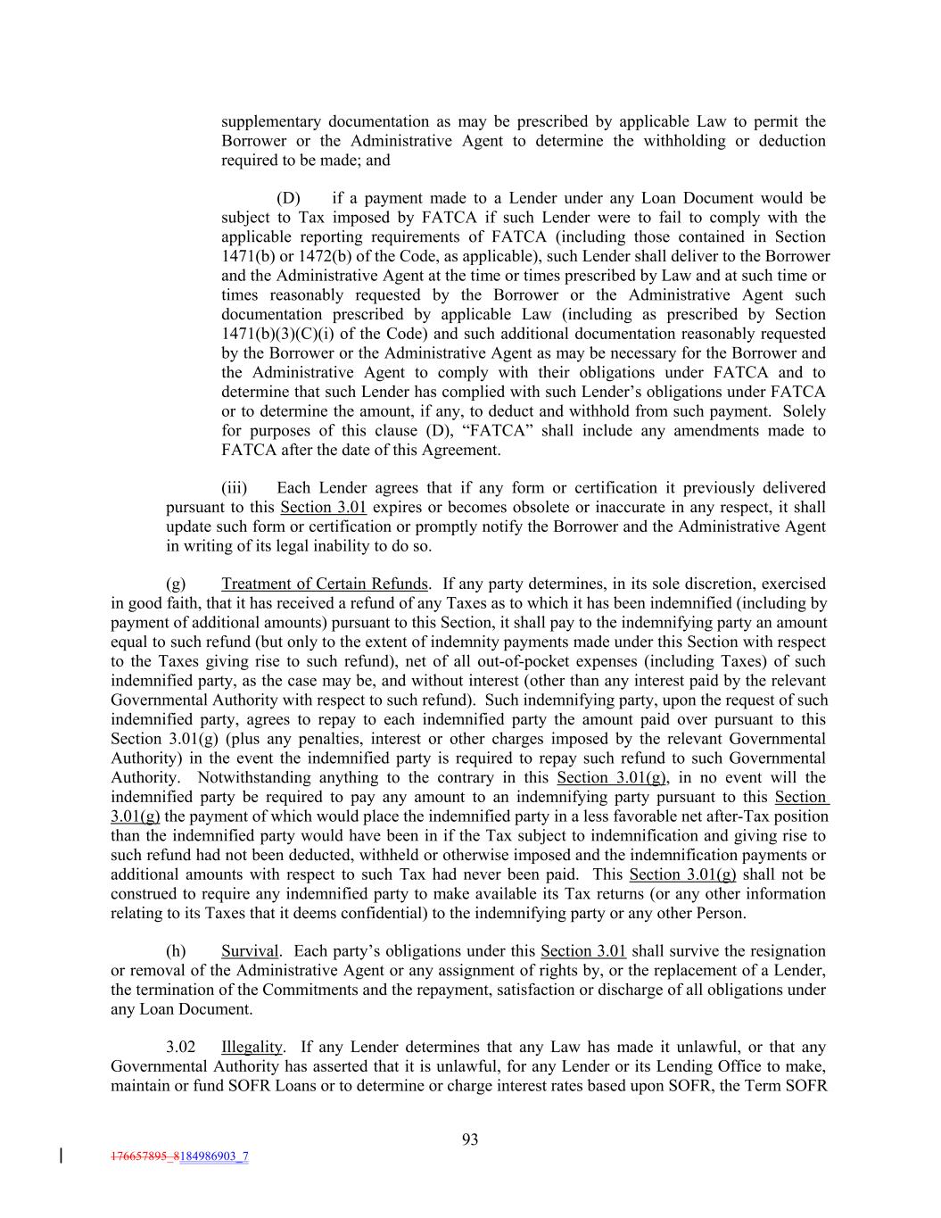 supplementary documentation as may be prescribed by applicable Law to permit the Borrower or the Administrative Agent to determine the withholding or deduction required to be made; and (D) if a payment made to a Lender under any Loan Document would be subject to Tax imposed by FATCA if such Lender were to fail to comply with the applicable reporting requirements of FATCA (including those contained in Section 1471(b) or 1472(b) of the Code, as applicable), such Lender shall deliver to the Borrower and the Administrative Agent at the time or times prescribed by Law and at such time or times reasonably requested by the Borrower or the Administrative Agent such documentation prescribed by applicable Law (including as prescribed by Section 1471(b)(3)(C)(i) of the Code) and such additional documentation reasonably requested by the Borrower or the Administrative Agent as may be necessary for the Borrower and the Administrative Agent to comply with their obligations under FATCA and to determine that such Lender has complied with such Lender’s obligations under FATCA or to determine the amount, if any, to deduct and withhold from such payment. Solely for purposes of this clause (D), “FATCA” shall include any amendments made to FATCA after the date of this Agreement. (iii) Each Lender agrees that if any form or certification it previously delivered pursuant to this Section 3.01 expires or becomes obsolete or inaccurate in any respect, it shall update such form or certification or promptly notify the Borrower and the Administrative Agent in writing of its legal inability to do so. (g) Treatment of Certain Refunds. If any party determines, in its sole discretion, exercised in good faith, that it has received a refund of any Taxes as to which it has been indemnified (including by payment of additional amounts) pursuant to this Section, it shall pay to the indemnifying party an amount equal to such refund (but only to the extent of indemnity payments made under this Section with respect to the Taxes giving rise to such refund), net of all out-of-pocket expenses (including Taxes) of such indemnified party, as the case may be, and without interest (other than any interest paid by the relevant Governmental Authority with respect to such refund). Such indemnifying party, upon the request of such indemnified party, agrees to repay to each indemnified party the amount paid over pursuant to this Section 3.01(g) (plus any penalties, interest or other charges imposed by the relevant Governmental Authority) in the event the indemnified party is required to repay such refund to such Governmental Authority. Notwithstanding anything to the contrary in this Section 3.01(g), in no event will the indemnified party be required to pay any amount to an indemnifying party pursuant to this Section 3.01(g) the payment of which would place the indemnified party in a less favorable net after-Tax position than the indemnified party would have been in if the Tax subject to indemnification and giving rise to such refund had not been deducted, withheld or otherwise imposed and the indemnification payments or additional amounts with respect to such Tax had never been paid. This Section 3.01(g) shall not be construed to require any indemnified party to make available its Tax returns (or any other information relating to its Taxes that it deems confidential) to the indemnifying party or any other Person. (h) Survival. Each party’s obligations under this Section 3.01 shall survive the resignation or removal of the Administrative Agent or any assignment of rights by, or the replacement of a Lender, the termination of the Commitments and the repayment, satisfaction or discharge of all obligations under any Loan Document. 3.02 Illegality. If any Lender determines that any Law has made it unlawful, or that any Governmental Authority has asserted that it is unlawful, for any Lender or its Lending Office to make, maintain or fund SOFR Loans or to determine or charge interest rates based upon SOFR, the Term SOFR 93 176657895_8184986903_7