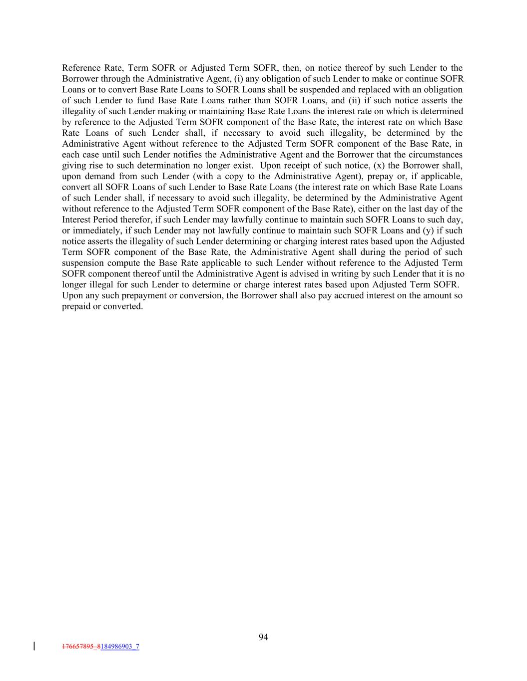Reference Rate, Term SOFR or Adjusted Term SOFR, then, on notice thereof by such Lender to the Borrower through the Administrative Agent, (i) any obligation of such Lender to make or continue SOFR Loans or to convert Base Rate Loans to SOFR Loans shall be suspended and replaced with an obligation of such Lender to fund Base Rate Loans rather than SOFR Loans, and (ii) if such notice asserts the illegality of such Lender making or maintaining Base Rate Loans the interest rate on which is determined by reference to the Adjusted Term SOFR component of the Base Rate, the interest rate on which Base Rate Loans of such Lender shall, if necessary to avoid such illegality, be determined by the Administrative Agent without reference to the Adjusted Term SOFR component of the Base Rate, in each case until such Lender notifies the Administrative Agent and the Borrower that the circumstances giving rise to such determination no longer exist. Upon receipt of such notice, (x) the Borrower shall, upon demand from such Lender (with a copy to the Administrative Agent), prepay or, if applicable, convert all SOFR Loans of such Lender to Base Rate Loans (the interest rate on which Base Rate Loans of such Lender shall, if necessary to avoid such illegality, be determined by the Administrative Agent without reference to the Adjusted Term SOFR component of the Base Rate), either on the last day of the Interest Period therefor, if such Lender may lawfully continue to maintain such SOFR Loans to such day, or immediately, if such Lender may not lawfully continue to maintain such SOFR Loans and (y) if such notice asserts the illegality of such Lender determining or charging interest rates based upon the Adjusted Term SOFR component of the Base Rate, the Administrative Agent shall during the period of such suspension compute the Base Rate applicable to such Lender without reference to the Adjusted Term SOFR component thereof until the Administrative Agent is advised in writing by such Lender that it is no longer illegal for such Lender to determine or charge interest rates based upon Adjusted Term SOFR. Upon any such prepayment or conversion, the Borrower shall also pay accrued interest on the amount so prepaid or converted. 94 176657895_8184986903_7