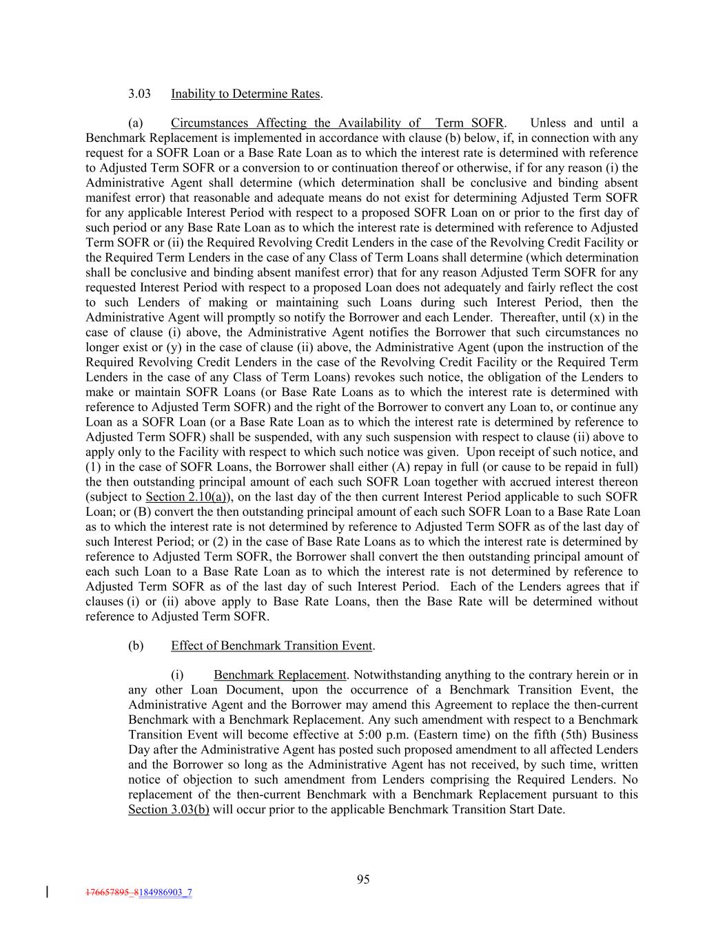 3.03 Inability to Determine Rates. (a) Circumstances Affecting the Availability of Term SOFR. Unless and until a Benchmark Replacement is implemented in accordance with clause (b) below, if, in connection with any request for a SOFR Loan or a Base Rate Loan as to which the interest rate is determined with reference to Adjusted Term SOFR or a conversion to or continuation thereof or otherwise, if for any reason (i) the Administrative Agent shall determine (which determination shall be conclusive and binding absent manifest error) that reasonable and adequate means do not exist for determining Adjusted Term SOFR for any applicable Interest Period with respect to a proposed SOFR Loan on or prior to the first day of such period or any Base Rate Loan as to which the interest rate is determined with reference to Adjusted Term SOFR or (ii) the Required Revolving Credit Lenders in the case of the Revolving Credit Facility or the Required Term Lenders in the case of any Class of Term Loans shall determine (which determination shall be conclusive and binding absent manifest error) that for any reason Adjusted Term SOFR for any requested Interest Period with respect to a proposed Loan does not adequately and fairly reflect the cost to such Lenders of making or maintaining such Loans during such Interest Period, then the Administrative Agent will promptly so notify the Borrower and each Lender. Thereafter, until (x) in the case of clause (i) above, the Administrative Agent notifies the Borrower that such circumstances no longer exist or (y) in the case of clause (ii) above, the Administrative Agent (upon the instruction of the Required Revolving Credit Lenders in the case of the Revolving Credit Facility or the Required Term Lenders in the case of any Class of Term Loans) revokes such notice, the obligation of the Lenders to make or maintain SOFR Loans (or Base Rate Loans as to which the interest rate is determined with reference to Adjusted Term SOFR) and the right of the Borrower to convert any Loan to, or continue any Loan as a SOFR Loan (or a Base Rate Loan as to which the interest rate is determined by reference to Adjusted Term SOFR) shall be suspended, with any such suspension with respect to clause (ii) above to apply only to the Facility with respect to which such notice was given. Upon receipt of such notice, and (1) in the case of SOFR Loans, the Borrower shall either (A) repay in full (or cause to be repaid in full) the then outstanding principal amount of each such SOFR Loan together with accrued interest thereon (subject to Section 2.10(a)), on the last day of the then current Interest Period applicable to such SOFR Loan; or (B) convert the then outstanding principal amount of each such SOFR Loan to a Base Rate Loan as to which the interest rate is not determined by reference to Adjusted Term SOFR as of the last day of such Interest Period; or (2) in the case of Base Rate Loans as to which the interest rate is determined by reference to Adjusted Term SOFR, the Borrower shall convert the then outstanding principal amount of each such Loan to a Base Rate Loan as to which the interest rate is not determined by reference to Adjusted Term SOFR as of the last day of such Interest Period. Each of the Lenders agrees that if clauses (i) or (ii) above apply to Base Rate Loans, then the Base Rate will be determined without reference to Adjusted Term SOFR. (b) Effect of Benchmark Transition Event. (i) Benchmark Replacement. Notwithstanding anything to the contrary herein or in any other Loan Document, upon the occurrence of a Benchmark Transition Event, the Administrative Agent and the Borrower may amend this Agreement to replace the then-current Benchmark with a Benchmark Replacement. Any such amendment with respect to a Benchmark Transition Event will become effective at 5:00 p.m. (Eastern time) on the fifth (5th) Business Day after the Administrative Agent has posted such proposed amendment to all affected Lenders and the Borrower so long as the Administrative Agent has not received, by such time, written notice of objection to such amendment from Lenders comprising the Required Lenders. No replacement of the then-current Benchmark with a Benchmark Replacement pursuant to this Section 3.03(b) will occur prior to the applicable Benchmark Transition Start Date. 95 176657895_8184986903_7