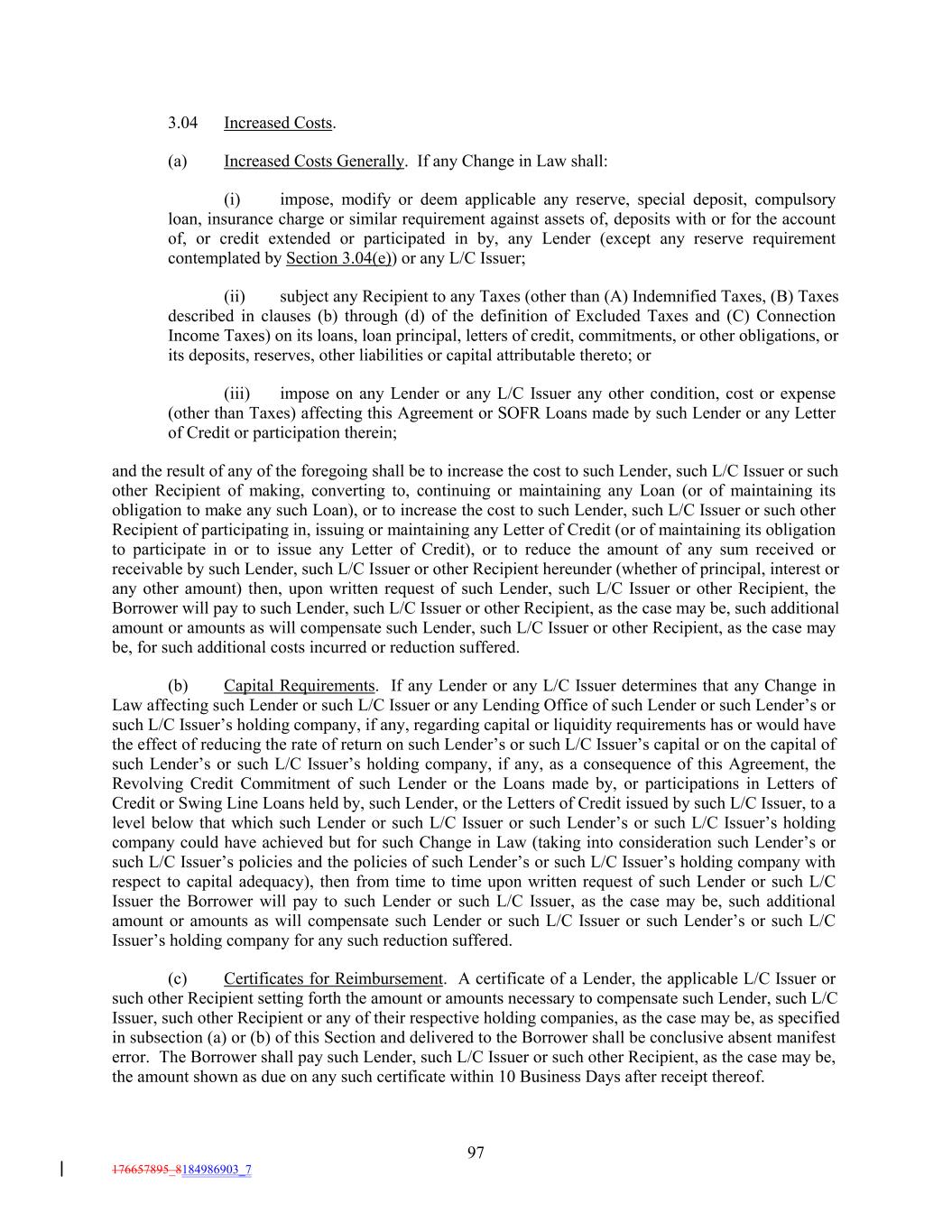 3.04 Increased Costs. (a) Increased Costs Generally. If any Change in Law shall: (i) impose, modify or deem applicable any reserve, special deposit, compulsory loan, insurance charge or similar requirement against assets of, deposits with or for the account of, or credit extended or participated in by, any Lender (except any reserve requirement contemplated by Section 3.04(e)) or any L/C Issuer; (ii) subject any Recipient to any Taxes (other than (A) Indemnified Taxes, (B) Taxes described in clauses (b) through (d) of the definition of Excluded Taxes and (C) Connection Income Taxes) on its loans, loan principal, letters of credit, commitments, or other obligations, or its deposits, reserves, other liabilities or capital attributable thereto; or (iii) impose on any Lender or any L/C Issuer any other condition, cost or expense (other than Taxes) affecting this Agreement or SOFR Loans made by such Lender or any Letter of Credit or participation therein; and the result of any of the foregoing shall be to increase the cost to such Lender, such L/C Issuer or such other Recipient of making, converting to, continuing or maintaining any Loan (or of maintaining its obligation to make any such Loan), or to increase the cost to such Lender, such L/C Issuer or such other Recipient of participating in, issuing or maintaining any Letter of Credit (or of maintaining its obligation to participate in or to issue any Letter of Credit), or to reduce the amount of any sum received or receivable by such Lender, such L/C Issuer or other Recipient hereunder (whether of principal, interest or any other amount) then, upon written request of such Lender, such L/C Issuer or other Recipient, the Borrower will pay to such Lender, such L/C Issuer or other Recipient, as the case may be, such additional amount or amounts as will compensate such Lender, such L/C Issuer or other Recipient, as the case may be, for such additional costs incurred or reduction suffered. (b) Capital Requirements. If any Lender or any L/C Issuer determines that any Change in Law affecting such Lender or such L/C Issuer or any Lending Office of such Lender or such Lender’s or such L/C Issuer’s holding company, if any, regarding capital or liquidity requirements has or would have the effect of reducing the rate of return on such Lender’s or such L/C Issuer’s capital or on the capital of such Lender’s or such L/C Issuer’s holding company, if any, as a consequence of this Agreement, the Revolving Credit Commitment of such Lender or the Loans made by, or participations in Letters of Credit or Swing Line Loans held by, such Lender, or the Letters of Credit issued by such L/C Issuer, to a level below that which such Lender or such L/C Issuer or such Lender’s or such L/C Issuer’s holding company could have achieved but for such Change in Law (taking into consideration such Lender’s or such L/C Issuer’s policies and the policies of such Lender’s or such L/C Issuer’s holding company with respect to capital adequacy), then from time to time upon written request of such Lender or such L/C Issuer the Borrower will pay to such Lender or such L/C Issuer, as the case may be, such additional amount or amounts as will compensate such Lender or such L/C Issuer or such Lender’s or such L/C Issuer’s holding company for any such reduction suffered. (c) Certificates for Reimbursement. A certificate of a Lender, the applicable L/C Issuer or such other Recipient setting forth the amount or amounts necessary to compensate such Lender, such L/C Issuer, such other Recipient or any of their respective holding companies, as the case may be, as specified in subsection (a) or (b) of this Section and delivered to the Borrower shall be conclusive absent manifest error. The Borrower shall pay such Lender, such L/C Issuer or such other Recipient, as the case may be, the amount shown as due on any such certificate within 10 Business Days after receipt thereof. 97 176657895_8184986903_7