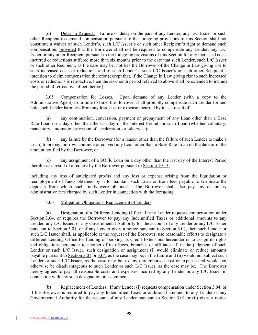 (d) Delay in Requests. Failure or delay on the part of any Lender, any L/C Issuer or such other Recipient to demand compensation pursuant to the foregoing provisions of this Section shall not constitute a waiver of such Lender’s, such L/C Issuer’s or such other Recipient’s right to demand such compensation; provided that the Borrower shall not be required to compensate any Lender, any L/C Issuer or any other Recipient pursuant to the foregoing provisions of this Section for any increased costs incurred or reductions suffered more than six months prior to the date that such Lender, such L/C Issuer or such other Recipient, as the case may be, notifies the Borrower of the Change in Law giving rise to such increased costs or reductions and of such Lender’s, such L/C Issuer’s or such other Recipient’s intention to claim compensation therefor (except that, if the Change in Law giving rise to such increased costs or reductions is retroactive, then the six-month period referred to above shall be extended to include the period of retroactive effect thereof). 3.05 Compensation for Losses. Upon demand of any Lender (with a copy to the Administrative Agent) from time to time, the Borrower shall promptly compensate such Lender for and hold such Lender harmless from any loss, cost or expense incurred by it as a result of: (a) any continuation, conversion, payment or prepayment of any Loan other than a Base Rate Loan on a day other than the last day of the Interest Period for such Loan (whether voluntary, mandatory, automatic, by reason of acceleration, or otherwise); (b) any failure by the Borrower (for a reason other than the failure of such Lender to make a Loan) to prepay, borrow, continue or convert any Loan other than a Base Rate Loan on the date or in the amount notified by the Borrower; or (c) any assignment of a SOFR Loan on a day other than the last day of the Interest Period therefor as a result of a request by the Borrower pursuant to Section 10.13; including any loss of anticipated profits and any loss or expense arising from the liquidation or reemployment of funds obtained by it to maintain such Loan or from fees payable to terminate the deposits from which such funds were obtained. The Borrower shall also pay any customary administrative fees charged by such Lender in connection with the foregoing. 3.06 Mitigation Obligations; Replacement of Lenders. (a) Designation of a Different Lending Office. If any Lender requests compensation under Section 3.04, or requires the Borrower to pay any Indemnified Taxes or additional amounts to any Lender, any L/C Issuer, or any Governmental Authority for the account of any Lender or any L/C Issuer pursuant to Section 3.01, or if any Lender gives a notice pursuant to Section 3.02, then such Lender or such L/C Issuer shall, as applicable at the request of the Borrower, use reasonable efforts to designate a different Lending Office for funding or booking its Credit Extensions hereunder or to assign its rights and obligations hereunder to another of its offices, branches or affiliates, if, in the judgment of such Lender or such L/C Issuer, such designation or assignment (i) would eliminate or reduce amounts payable pursuant to Section 3.01 or 3.04, as the case may be, in the future and (ii) would not subject such Lender or such L/C Issuer, as the case may be, to any unreimbursed cost or expense and would not otherwise be disadvantageous to such Lender or such L/C Issuer, as the case may be. The Borrower hereby agrees to pay all reasonable costs and expenses incurred by any Lender or any L/C Issuer in connection with any such designation or assignment. (b) Replacement of Lenders. If any Lender (i) requests compensation under Section 3.04, or if the Borrower is required to pay any Indemnified Taxes or additional amounts to any Lender or any Governmental Authority for the account of any Lender pursuant to Section 3.01 or (ii) gives a notice 98 176657895_8184986903_7