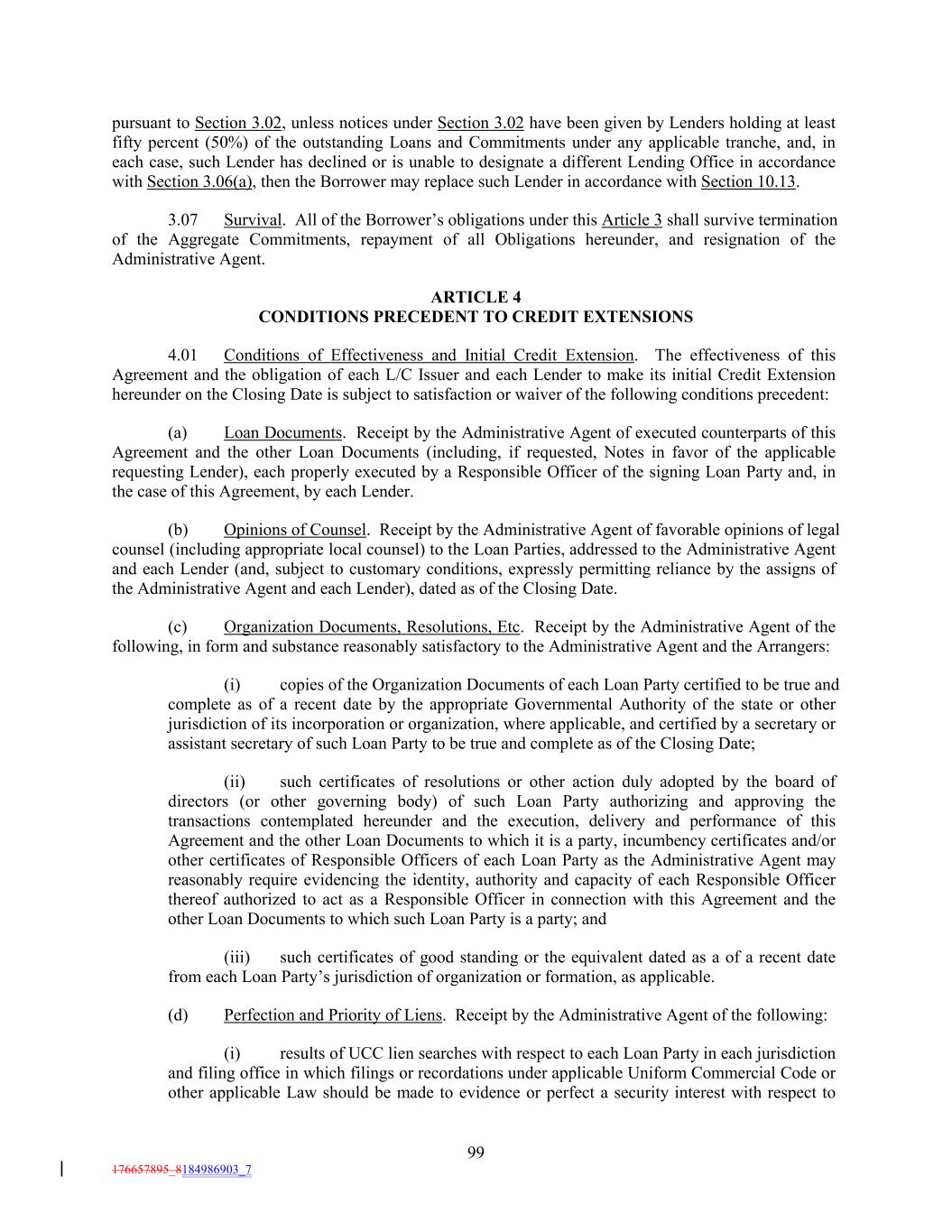 pursuant to Section 3.02, unless notices under Section 3.02 have been given by Lenders holding at least fifty percent (50%) of the outstanding Loans and Commitments under any applicable tranche, and, in each case, such Lender has declined or is unable to designate a different Lending Office in accordance with Section 3.06(a), then the Borrower may replace such Lender in accordance with Section 10.13. 3.07 Survival. All of the Borrower’s obligations under this Article 3 shall survive termination of the Aggregate Commitments, repayment of all Obligations hereunder, and resignation of the Administrative Agent. ARTICLE 4 CONDITIONS PRECEDENT TO CREDIT EXTENSIONS 4.01 Conditions of Effectiveness and Initial Credit Extension. The effectiveness of this Agreement and the obligation of each L/C Issuer and each Lender to make its initial Credit Extension hereunder on the Closing Date is subject to satisfaction or waiver of the following conditions precedent: (a) Loan Documents. Receipt by the Administrative Agent of executed counterparts of this Agreement and the other Loan Documents (including, if requested, Notes in favor of the applicable requesting Lender), each properly executed by a Responsible Officer of the signing Loan Party and, in the case of this Agreement, by each Lender. (b) Opinions of Counsel. Receipt by the Administrative Agent of favorable opinions of legal counsel (including appropriate local counsel) to the Loan Parties, addressed to the Administrative Agent and each Lender (and, subject to customary conditions, expressly permitting reliance by the assigns of the Administrative Agent and each Lender), dated as of the Closing Date. (c) Organization Documents, Resolutions, Etc. Receipt by the Administrative Agent of the following, in form and substance reasonably satisfactory to the Administrative Agent and the Arrangers: (i) copies of the Organization Documents of each Loan Party certified to be true and complete as of a recent date by the appropriate Governmental Authority of the state or other jurisdiction of its incorporation or organization, where applicable, and certified by a secretary or assistant secretary of such Loan Party to be true and complete as of the Closing Date; (ii) such certificates of resolutions or other action duly adopted by the board of directors (or other governing body) of such Loan Party authorizing and approving the transactions contemplated hereunder and the execution, delivery and performance of this Agreement and the other Loan Documents to which it is a party, incumbency certificates and/or other certificates of Responsible Officers of each Loan Party as the Administrative Agent may reasonably require evidencing the identity, authority and capacity of each Responsible Officer thereof authorized to act as a Responsible Officer in connection with this Agreement and the other Loan Documents to which such Loan Party is a party; and (iii) such certificates of good standing or the equivalent dated as a of a recent date from each Loan Party’s jurisdiction of organization or formation, as applicable. (d) Perfection and Priority of Liens. Receipt by the Administrative Agent of the following: (i) results of UCC lien searches with respect to each Loan Party in each jurisdiction and filing office in which filings or recordations under applicable Uniform Commercial Code or other applicable Law should be made to evidence or perfect a security interest with respect to 99 176657895_8184986903_7
