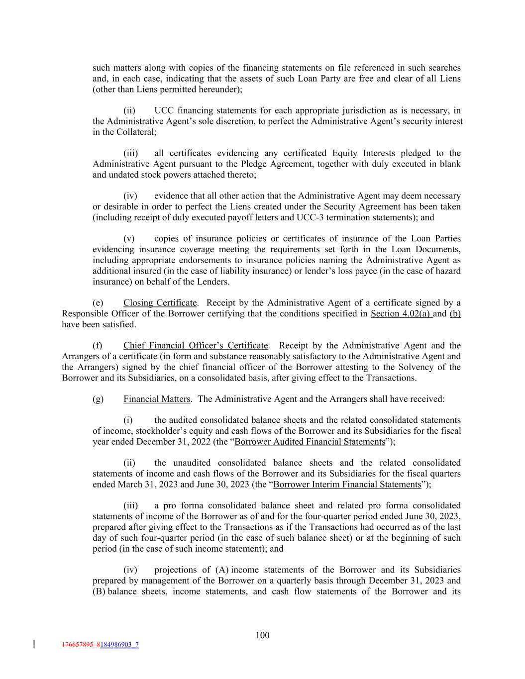 such matters along with copies of the financing statements on file referenced in such searches and, in each case, indicating that the assets of such Loan Party are free and clear of all Liens (other than Liens permitted hereunder); (ii) UCC financing statements for each appropriate jurisdiction as is necessary, in the Administrative Agent’s sole discretion, to perfect the Administrative Agent’s security interest in the Collateral; (iii) all certificates evidencing any certificated Equity Interests pledged to the Administrative Agent pursuant to the Pledge Agreement, together with duly executed in blank and undated stock powers attached thereto; (iv) evidence that all other action that the Administrative Agent may deem necessary or desirable in order to perfect the Liens created under the Security Agreement has been taken (including receipt of duly executed payoff letters and UCC-3 termination statements); and (v) copies of insurance policies or certificates of insurance of the Loan Parties evidencing insurance coverage meeting the requirements set forth in the Loan Documents, including appropriate endorsements to insurance policies naming the Administrative Agent as additional insured (in the case of liability insurance) or lender’s loss payee (in the case of hazard insurance) on behalf of the Lenders. (e) Closing Certificate. Receipt by the Administrative Agent of a certificate signed by a Responsible Officer of the Borrower certifying that the conditions specified in Section 4.02(a) and (b) have been satisfied. (f) Chief Financial Officer’s Certificate. Receipt by the Administrative Agent and the Arrangers of a certificate (in form and substance reasonably satisfactory to the Administrative Agent and the Arrangers) signed by the chief financial officer of the Borrower attesting to the Solvency of the Borrower and its Subsidiaries, on a consolidated basis, after giving effect to the Transactions. (g) Financial Matters. The Administrative Agent and the Arrangers shall have received: (i) the audited consolidated balance sheets and the related consolidated statements of income, stockholder’s equity and cash flows of the Borrower and its Subsidiaries for the fiscal year ended December 31, 2022 (the “Borrower Audited Financial Statements”); (ii) the unaudited consolidated balance sheets and the related consolidated statements of income and cash flows of the Borrower and its Subsidiaries for the fiscal quarters ended March 31, 2023 and June 30, 2023 (the “Borrower Interim Financial Statements”); (iii) a pro forma consolidated balance sheet and related pro forma consolidated statements of income of the Borrower as of and for the four-quarter period ended June 30, 2023, prepared after giving effect to the Transactions as if the Transactions had occurred as of the last day of such four-quarter period (in the case of such balance sheet) or at the beginning of such period (in the case of such income statement); and (iv) projections of (A) income statements of the Borrower and its Subsidiaries prepared by management of the Borrower on a quarterly basis through December 31, 2023 and (B) balance sheets, income statements, and cash flow statements of the Borrower and its 100 176657895_8184986903_7