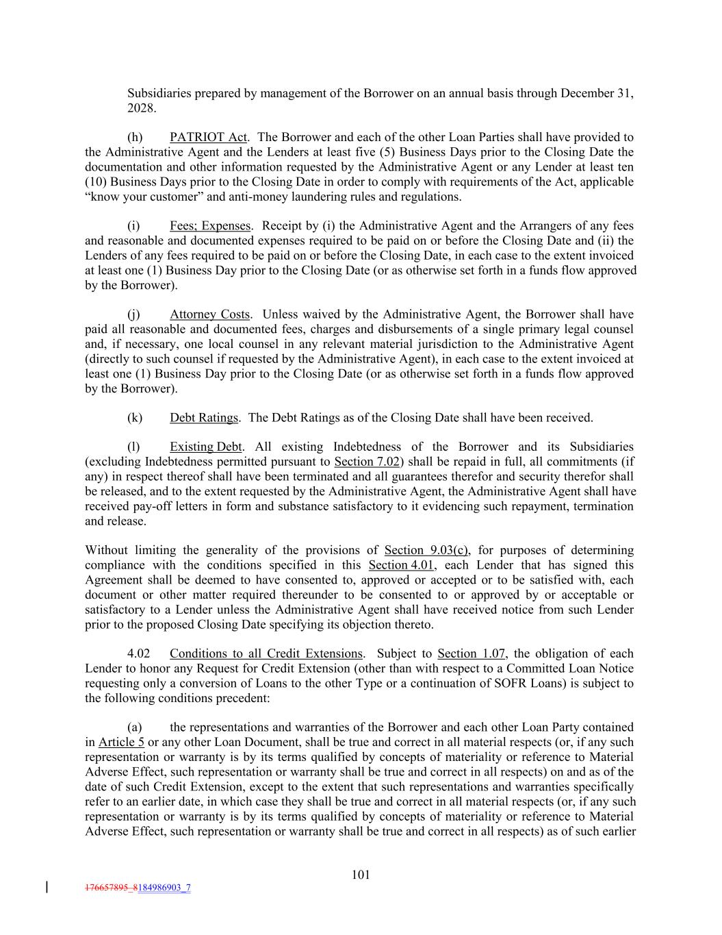 Subsidiaries prepared by management of the Borrower on an annual basis through December 31, 2028. (h) PATRIOT Act. The Borrower and each of the other Loan Parties shall have provided to the Administrative Agent and the Lenders at least five (5) Business Days prior to the Closing Date the documentation and other information requested by the Administrative Agent or any Lender at least ten (10) Business Days prior to the Closing Date in order to comply with requirements of the Act, applicable “know your customer” and anti-money laundering rules and regulations. (i) Fees; Expenses. Receipt by (i) the Administrative Agent and the Arrangers of any fees and reasonable and documented expenses required to be paid on or before the Closing Date and (ii) the Lenders of any fees required to be paid on or before the Closing Date, in each case to the extent invoiced at least one (1) Business Day prior to the Closing Date (or as otherwise set forth in a funds flow approved by the Borrower). (j) Attorney Costs. Unless waived by the Administrative Agent, the Borrower shall have paid all reasonable and documented fees, charges and disbursements of a single primary legal counsel and, if necessary, one local counsel in any relevant material jurisdiction to the Administrative Agent (directly to such counsel if requested by the Administrative Agent), in each case to the extent invoiced at least one (1) Business Day prior to the Closing Date (or as otherwise set forth in a funds flow approved by the Borrower). (k) Debt Ratings. The Debt Ratings as of the Closing Date shall have been received. (l) Existing Debt. All existing Indebtedness of the Borrower and its Subsidiaries (excluding Indebtedness permitted pursuant to Section 7.02) shall be repaid in full, all commitments (if any) in respect thereof shall have been terminated and all guarantees therefor and security therefor shall be released, and to the extent requested by the Administrative Agent, the Administrative Agent shall have received pay-off letters in form and substance satisfactory to it evidencing such repayment, termination and release. Without limiting the generality of the provisions of Section 9.03(c), for purposes of determining compliance with the conditions specified in this Section 4.01, each Lender that has signed this Agreement shall be deemed to have consented to, approved or accepted or to be satisfied with, each document or other matter required thereunder to be consented to or approved by or acceptable or satisfactory to a Lender unless the Administrative Agent shall have received notice from such Lender prior to the proposed Closing Date specifying its objection thereto. 4.02 Conditions to all Credit Extensions. Subject to Section 1.07, the obligation of each Lender to honor any Request for Credit Extension (other than with respect to a Committed Loan Notice requesting only a conversion of Loans to the other Type or a continuation of SOFR Loans) is subject to the following conditions precedent: (a) the representations and warranties of the Borrower and each other Loan Party contained in Article 5 or any other Loan Document, shall be true and correct in all material respects (or, if any such representation or warranty is by its terms qualified by concepts of materiality or reference to Material Adverse Effect, such representation or warranty shall be true and correct in all respects) on and as of the date of such Credit Extension, except to the extent that such representations and warranties specifically refer to an earlier date, in which case they shall be true and correct in all material respects (or, if any such representation or warranty is by its terms qualified by concepts of materiality or reference to Material Adverse Effect, such representation or warranty shall be true and correct in all respects) as of such earlier 101 176657895_8184986903_7