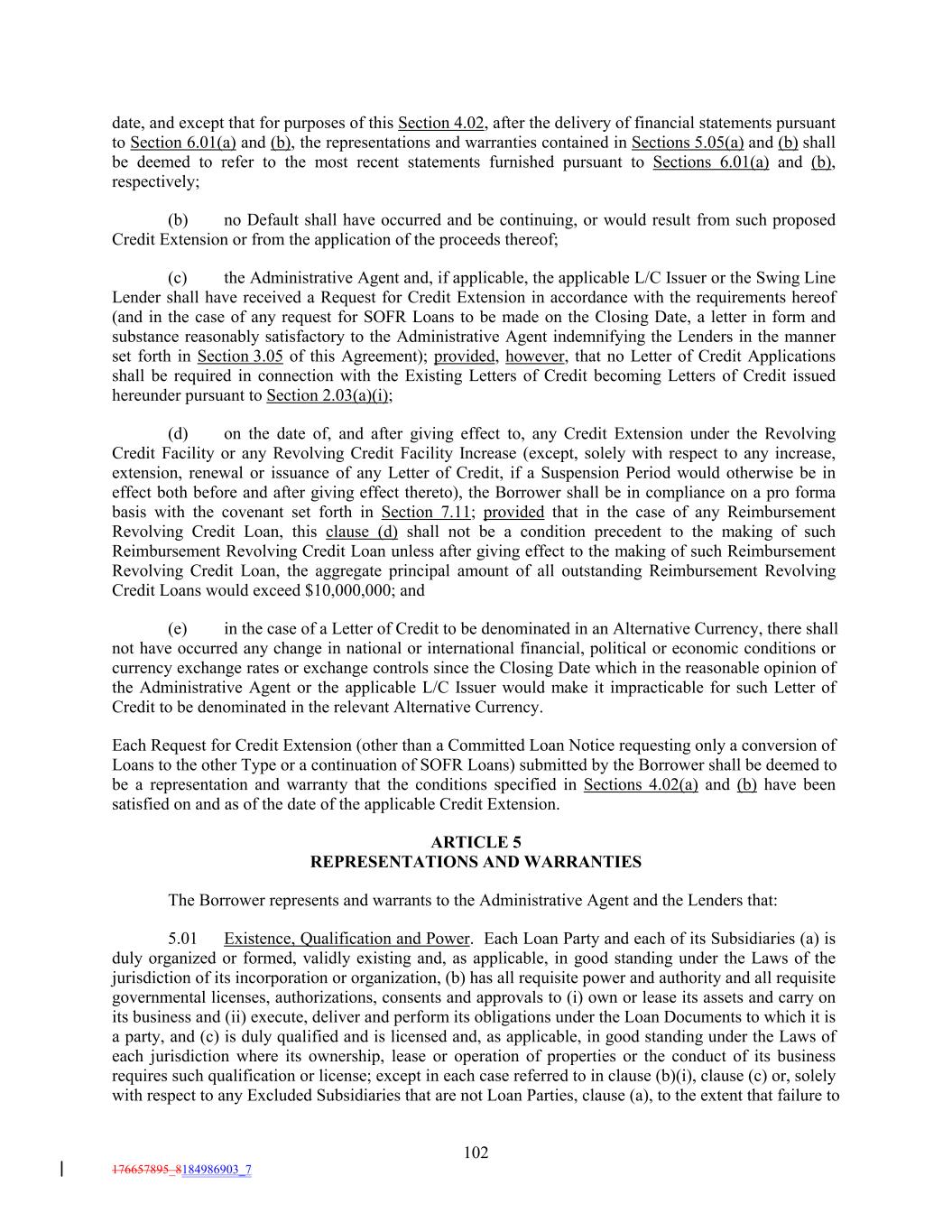 date, and except that for purposes of this Section 4.02, after the delivery of financial statements pursuant to Section 6.01(a) and (b), the representations and warranties contained in Sections 5.05(a) and (b) shall be deemed to refer to the most recent statements furnished pursuant to Sections 6.01(a) and (b), respectively; (b) no Default shall have occurred and be continuing, or would result from such proposed Credit Extension or from the application of the proceeds thereof; (c) the Administrative Agent and, if applicable, the applicable L/C Issuer or the Swing Line Lender shall have received a Request for Credit Extension in accordance with the requirements hereof (and in the case of any request for SOFR Loans to be made on the Closing Date, a letter in form and substance reasonably satisfactory to the Administrative Agent indemnifying the Lenders in the manner set forth in Section 3.05 of this Agreement); provided, however, that no Letter of Credit Applications shall be required in connection with the Existing Letters of Credit becoming Letters of Credit issued hereunder pursuant to Section 2.03(a)(i); (d) on the date of, and after giving effect to, any Credit Extension under the Revolving Credit Facility or any Revolving Credit Facility Increase (except, solely with respect to any increase, extension, renewal or issuance of any Letter of Credit, if a Suspension Period would otherwise be in effect both before and after giving effect thereto), the Borrower shall be in compliance on a pro forma basis with the covenant set forth in Section 7.11; provided that in the case of any Reimbursement Revolving Credit Loan, this clause (d) shall not be a condition precedent to the making of such Reimbursement Revolving Credit Loan unless after giving effect to the making of such Reimbursement Revolving Credit Loan, the aggregate principal amount of all outstanding Reimbursement Revolving Credit Loans would exceed $10,000,000; and (e) in the case of a Letter of Credit to be denominated in an Alternative Currency, there shall not have occurred any change in national or international financial, political or economic conditions or currency exchange rates or exchange controls since the Closing Date which in the reasonable opinion of the Administrative Agent or the applicable L/C Issuer would make it impracticable for such Letter of Credit to be denominated in the relevant Alternative Currency. Each Request for Credit Extension (other than a Committed Loan Notice requesting only a conversion of Loans to the other Type or a continuation of SOFR Loans) submitted by the Borrower shall be deemed to be a representation and warranty that the conditions specified in Sections 4.02(a) and (b) have been satisfied on and as of the date of the applicable Credit Extension. ARTICLE 5 REPRESENTATIONS AND WARRANTIES The Borrower represents and warrants to the Administrative Agent and the Lenders that: 5.01 Existence, Qualification and Power. Each Loan Party and each of its Subsidiaries (a) is duly organized or formed, validly existing and, as applicable, in good standing under the Laws of the jurisdiction of its incorporation or organization, (b) has all requisite power and authority and all requisite governmental licenses, authorizations, consents and approvals to (i) own or lease its assets and carry on its business and (ii) execute, deliver and perform its obligations under the Loan Documents to which it is a party, and (c) is duly qualified and is licensed and, as applicable, in good standing under the Laws of each jurisdiction where its ownership, lease or operation of properties or the conduct of its business requires such qualification or license; except in each case referred to in clause (b)(i), clause (c) or, solely with respect to any Excluded Subsidiaries that are not Loan Parties, clause (a), to the extent that failure to 102 176657895_8184986903_7