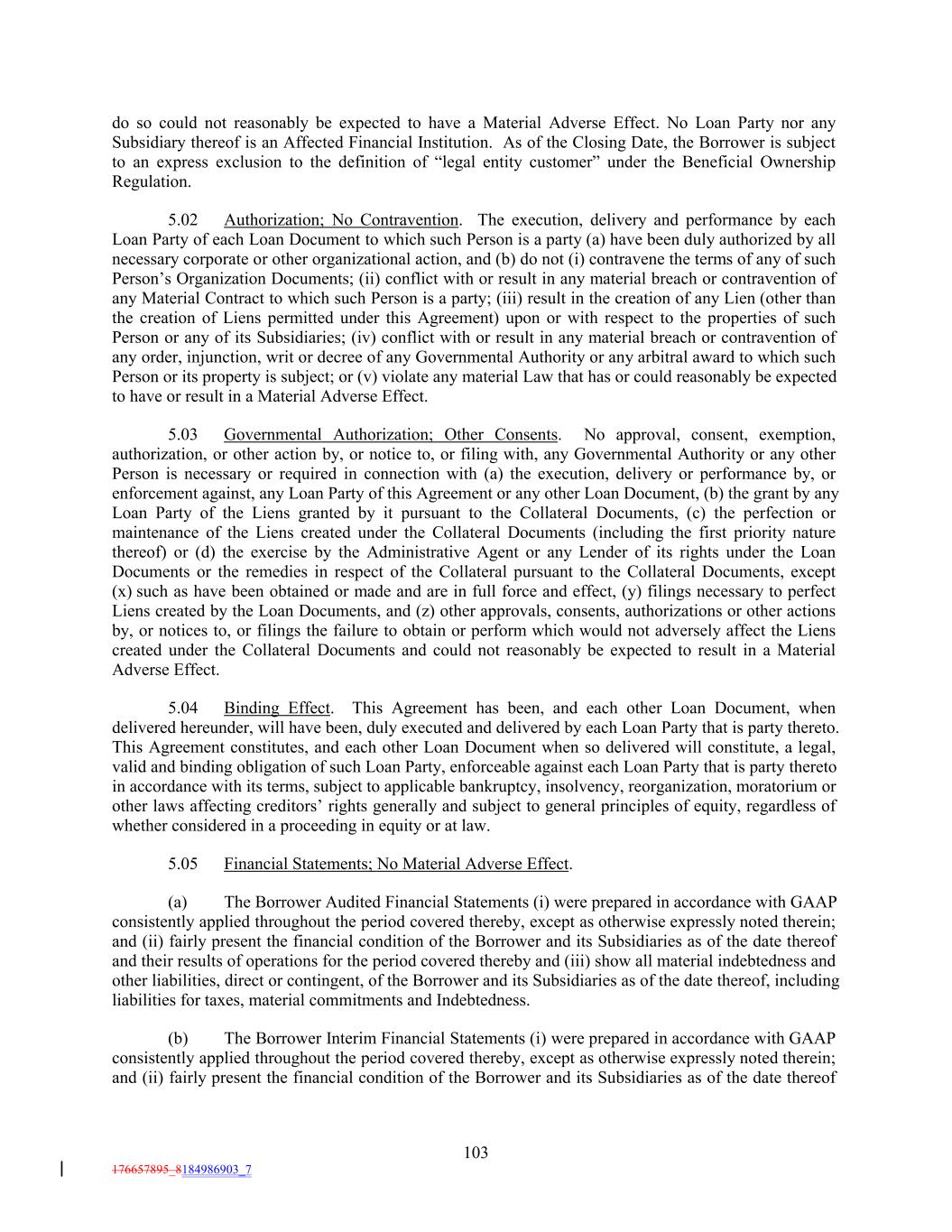 do so could not reasonably be expected to have a Material Adverse Effect. No Loan Party nor any Subsidiary thereof is an Affected Financial Institution. As of the Closing Date, the Borrower is subject to an express exclusion to the definition of “legal entity customer” under the Beneficial Ownership Regulation. 5.02 Authorization; No Contravention. The execution, delivery and performance by each Loan Party of each Loan Document to which such Person is a party (a) have been duly authorized by all necessary corporate or other organizational action, and (b) do not (i) contravene the terms of any of such Person’s Organization Documents; (ii) conflict with or result in any material breach or contravention of any Material Contract to which such Person is a party; (iii) result in the creation of any Lien (other than the creation of Liens permitted under this Agreement) upon or with respect to the properties of such Person or any of its Subsidiaries; (iv) conflict with or result in any material breach or contravention of any order, injunction, writ or decree of any Governmental Authority or any arbitral award to which such Person or its property is subject; or (v) violate any material Law that has or could reasonably be expected to have or result in a Material Adverse Effect. 5.03 Governmental Authorization; Other Consents. No approval, consent, exemption, authorization, or other action by, or notice to, or filing with, any Governmental Authority or any other Person is necessary or required in connection with (a) the execution, delivery or performance by, or enforcement against, any Loan Party of this Agreement or any other Loan Document, (b) the grant by any Loan Party of the Liens granted by it pursuant to the Collateral Documents, (c) the perfection or maintenance of the Liens created under the Collateral Documents (including the first priority nature thereof) or (d) the exercise by the Administrative Agent or any Lender of its rights under the Loan Documents or the remedies in respect of the Collateral pursuant to the Collateral Documents, except (x) such as have been obtained or made and are in full force and effect, (y) filings necessary to perfect Liens created by the Loan Documents, and (z) other approvals, consents, authorizations or other actions by, or notices to, or filings the failure to obtain or perform which would not adversely affect the Liens created under the Collateral Documents and could not reasonably be expected to result in a Material Adverse Effect. 5.04 Binding Effect. This Agreement has been, and each other Loan Document, when delivered hereunder, will have been, duly executed and delivered by each Loan Party that is party thereto. This Agreement constitutes, and each other Loan Document when so delivered will constitute, a legal, valid and binding obligation of such Loan Party, enforceable against each Loan Party that is party thereto in accordance with its terms, subject to applicable bankruptcy, insolvency, reorganization, moratorium or other laws affecting creditors’ rights generally and subject to general principles of equity, regardless of whether considered in a proceeding in equity or at law. 5.05 Financial Statements; No Material Adverse Effect. (a) The Borrower Audited Financial Statements (i) were prepared in accordance with GAAP consistently applied throughout the period covered thereby, except as otherwise expressly noted therein; and (ii) fairly present the financial condition of the Borrower and its Subsidiaries as of the date thereof and their results of operations for the period covered thereby and (iii) show all material indebtedness and other liabilities, direct or contingent, of the Borrower and its Subsidiaries as of the date thereof, including liabilities for taxes, material commitments and Indebtedness. (b) The Borrower Interim Financial Statements (i) were prepared in accordance with GAAP consistently applied throughout the period covered thereby, except as otherwise expressly noted therein; and (ii) fairly present the financial condition of the Borrower and its Subsidiaries as of the date thereof 103 176657895_8184986903_7