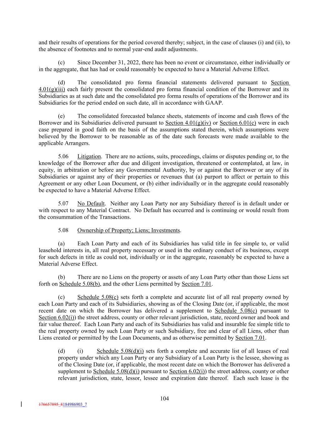 and their results of operations for the period covered thereby; subject, in the case of clauses (i) and (ii), to the absence of footnotes and to normal year-end audit adjustments. (c) Since December 31, 2022, there has been no event or circumstance, either individually or in the aggregate, that has had or could reasonably be expected to have a Material Adverse Effect. (d) The consolidated pro forma financial statements delivered pursuant to Section 4.01(g)(iii) each fairly present the consolidated pro forma financial condition of the Borrower and its Subsidiaries as at such date and the consolidated pro forma results of operations of the Borrower and its Subsidiaries for the period ended on such date, all in accordance with GAAP. (e) The consolidated forecasted balance sheets, statements of income and cash flows of the Borrower and its Subsidiaries delivered pursuant to Section 4.01(g)(iv) or Section 6.01(c) were in each case prepared in good faith on the basis of the assumptions stated therein, which assumptions were believed by the Borrower to be reasonable as of the date such forecasts were made available to the applicable Arrangers. 5.06 Litigation. There are no actions, suits, proceedings, claims or disputes pending or, to the knowledge of the Borrower after due and diligent investigation, threatened or contemplated, at law, in equity, in arbitration or before any Governmental Authority, by or against the Borrower or any of its Subsidiaries or against any of their properties or revenues that (a) purport to affect or pertain to this Agreement or any other Loan Document, or (b) either individually or in the aggregate could reasonably be expected to have a Material Adverse Effect. 5.07 No Default. Neither any Loan Party nor any Subsidiary thereof is in default under or with respect to any Material Contract. No Default has occurred and is continuing or would result from the consummation of the Transactions. 5.08 Ownership of Property; Liens; Investments. (a) Each Loan Party and each of its Subsidiaries has valid title in fee simple to, or valid leasehold interests in, all real property necessary or used in the ordinary conduct of its business, except for such defects in title as could not, individually or in the aggregate, reasonably be expected to have a Material Adverse Effect. (b) There are no Liens on the property or assets of any Loan Party other than those Liens set forth on Schedule 5.08(b), and the other Liens permitted by Section 7.01. (c) Schedule 5.08(c) sets forth a complete and accurate list of all real property owned by each Loan Party and each of its Subsidiaries, showing as of the Closing Date (or, if applicable, the most recent date on which the Borrower has delivered a supplement to Schedule 5.08(c) pursuant to Section 6.02(i)) the street address, county or other relevant jurisdiction, state, record owner and book and fair value thereof. Each Loan Party and each of its Subsidiaries has valid and insurable fee simple title to the real property owned by such Loan Party or such Subsidiary, free and clear of all Liens, other than Liens created or permitted by the Loan Documents, and as otherwise permitted by Section 7.01. (d) (i) Schedule 5.08(d)(i) sets forth a complete and accurate list of all leases of real property under which any Loan Party or any Subsidiary of a Loan Party is the lessee, showing as of the Closing Date (or, if applicable, the most recent date on which the Borrower has delivered a supplement to Schedule 5.08(d)(i) pursuant to Section 6.02(i)) the street address, county or other relevant jurisdiction, state, lessor, lessee and expiration date thereof. Each such lease is the 104 176657895_8184986903_7