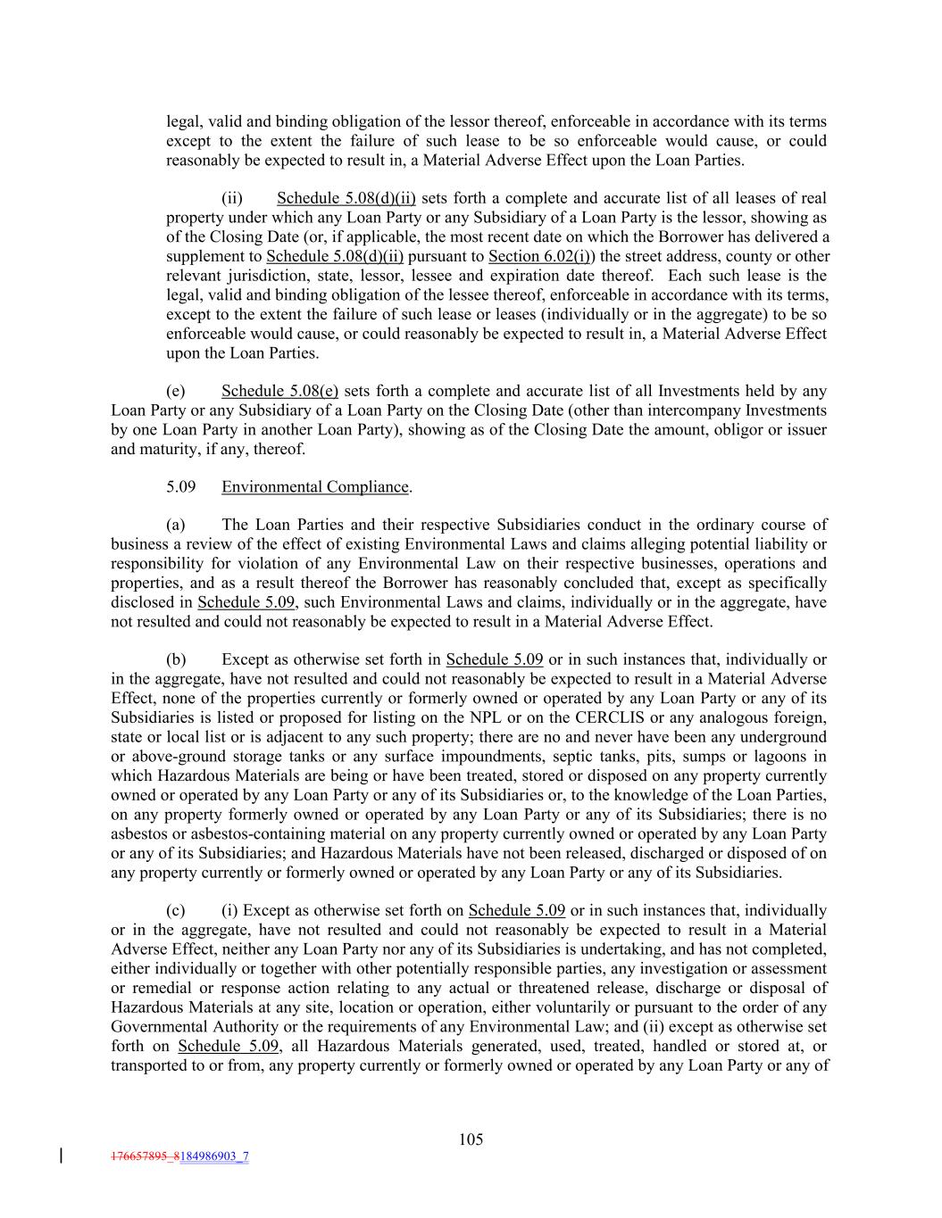 legal, valid and binding obligation of the lessor thereof, enforceable in accordance with its terms except to the extent the failure of such lease to be so enforceable would cause, or could reasonably be expected to result in, a Material Adverse Effect upon the Loan Parties. (ii) Schedule 5.08(d)(ii) sets forth a complete and accurate list of all leases of real property under which any Loan Party or any Subsidiary of a Loan Party is the lessor, showing as of the Closing Date (or, if applicable, the most recent date on which the Borrower has delivered a supplement to Schedule 5.08(d)(ii) pursuant to Section 6.02(i)) the street address, county or other relevant jurisdiction, state, lessor, lessee and expiration date thereof. Each such lease is the legal, valid and binding obligation of the lessee thereof, enforceable in accordance with its terms, except to the extent the failure of such lease or leases (individually or in the aggregate) to be so enforceable would cause, or could reasonably be expected to result in, a Material Adverse Effect upon the Loan Parties. (e) Schedule 5.08(e) sets forth a complete and accurate list of all Investments held by any Loan Party or any Subsidiary of a Loan Party on the Closing Date (other than intercompany Investments by one Loan Party in another Loan Party), showing as of the Closing Date the amount, obligor or issuer and maturity, if any, thereof. 5.09 Environmental Compliance. (a) The Loan Parties and their respective Subsidiaries conduct in the ordinary course of business a review of the effect of existing Environmental Laws and claims alleging potential liability or responsibility for violation of any Environmental Law on their respective businesses, operations and properties, and as a result thereof the Borrower has reasonably concluded that, except as specifically disclosed in Schedule 5.09, such Environmental Laws and claims, individually or in the aggregate, have not resulted and could not reasonably be expected to result in a Material Adverse Effect. (b) Except as otherwise set forth in Schedule 5.09 or in such instances that, individually or in the aggregate, have not resulted and could not reasonably be expected to result in a Material Adverse Effect, none of the properties currently or formerly owned or operated by any Loan Party or any of its Subsidiaries is listed or proposed for listing on the NPL or on the CERCLIS or any analogous foreign, state or local list or is adjacent to any such property; there are no and never have been any underground or above-ground storage tanks or any surface impoundments, septic tanks, pits, sumps or lagoons in which Hazardous Materials are being or have been treated, stored or disposed on any property currently owned or operated by any Loan Party or any of its Subsidiaries or, to the knowledge of the Loan Parties, on any property formerly owned or operated by any Loan Party or any of its Subsidiaries; there is no asbestos or asbestos-containing material on any property currently owned or operated by any Loan Party or any of its Subsidiaries; and Hazardous Materials have not been released, discharged or disposed of on any property currently or formerly owned or operated by any Loan Party or any of its Subsidiaries. (c) (i) Except as otherwise set forth on Schedule 5.09 or in such instances that, individually or in the aggregate, have not resulted and could not reasonably be expected to result in a Material Adverse Effect, neither any Loan Party nor any of its Subsidiaries is undertaking, and has not completed, either individually or together with other potentially responsible parties, any investigation or assessment or remedial or response action relating to any actual or threatened release, discharge or disposal of Hazardous Materials at any site, location or operation, either voluntarily or pursuant to the order of any Governmental Authority or the requirements of any Environmental Law; and (ii) except as otherwise set forth on Schedule 5.09, all Hazardous Materials generated, used, treated, handled or stored at, or transported to or from, any property currently or formerly owned or operated by any Loan Party or any of 105 176657895_8184986903_7