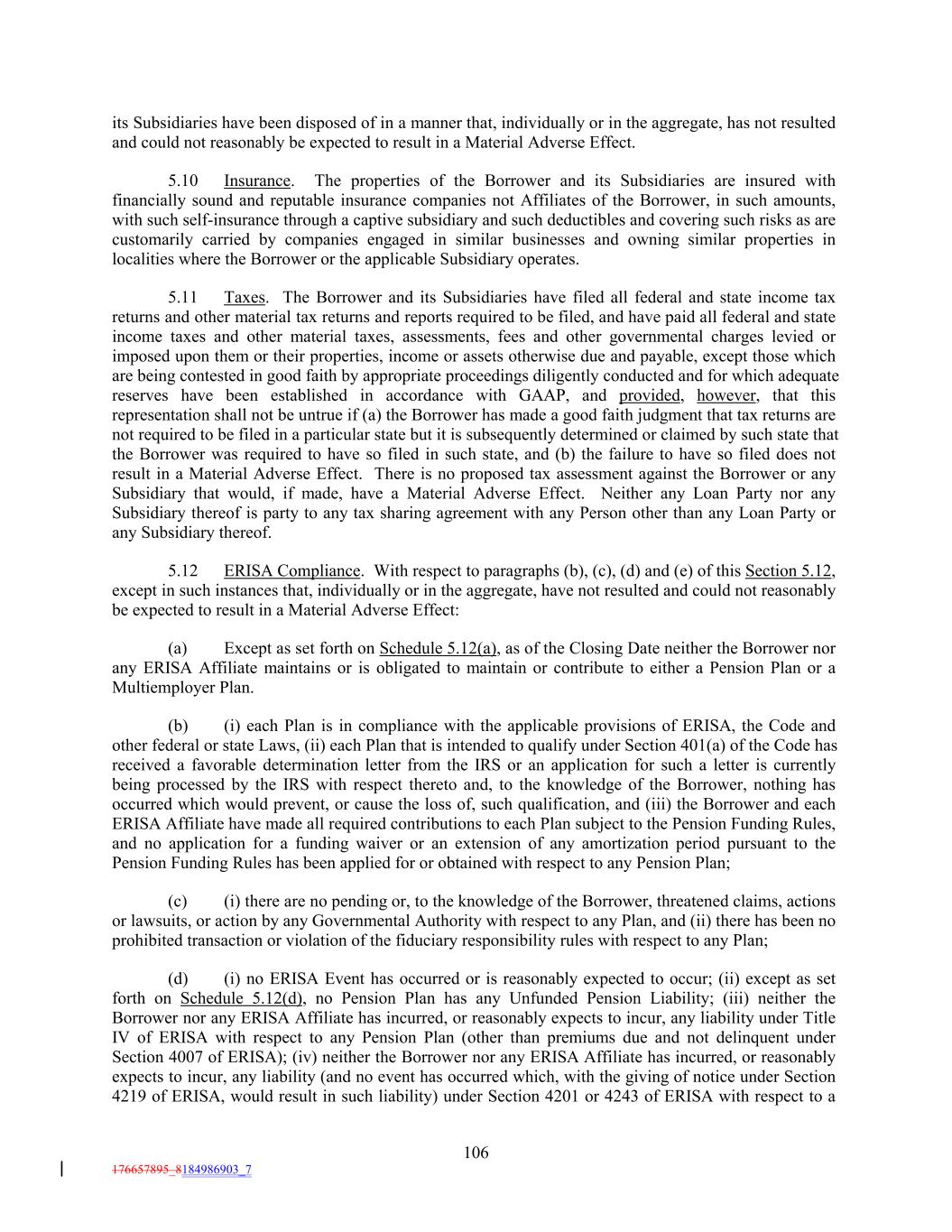 its Subsidiaries have been disposed of in a manner that, individually or in the aggregate, has not resulted and could not reasonably be expected to result in a Material Adverse Effect. 5.10 Insurance. The properties of the Borrower and its Subsidiaries are insured with financially sound and reputable insurance companies not Affiliates of the Borrower, in such amounts, with such self-insurance through a captive subsidiary and such deductibles and covering such risks as are customarily carried by companies engaged in similar businesses and owning similar properties in localities where the Borrower or the applicable Subsidiary operates. 5.11 Taxes. The Borrower and its Subsidiaries have filed all federal and state income tax returns and other material tax returns and reports required to be filed, and have paid all federal and state income taxes and other material taxes, assessments, fees and other governmental charges levied or imposed upon them or their properties, income or assets otherwise due and payable, except those which are being contested in good faith by appropriate proceedings diligently conducted and for which adequate reserves have been established in accordance with GAAP, and provided, however, that this representation shall not be untrue if (a) the Borrower has made a good faith judgment that tax returns are not required to be filed in a particular state but it is subsequently determined or claimed by such state that the Borrower was required to have so filed in such state, and (b) the failure to have so filed does not result in a Material Adverse Effect. There is no proposed tax assessment against the Borrower or any Subsidiary that would, if made, have a Material Adverse Effect. Neither any Loan Party nor any Subsidiary thereof is party to any tax sharing agreement with any Person other than any Loan Party or any Subsidiary thereof. 5.12 ERISA Compliance. With respect to paragraphs (b), (c), (d) and (e) of this Section 5.12, except in such instances that, individually or in the aggregate, have not resulted and could not reasonably be expected to result in a Material Adverse Effect: (a) Except as set forth on Schedule 5.12(a), as of the Closing Date neither the Borrower nor any ERISA Affiliate maintains or is obligated to maintain or contribute to either a Pension Plan or a Multiemployer Plan. (b) (i) each Plan is in compliance with the applicable provisions of ERISA, the Code and other federal or state Laws, (ii) each Plan that is intended to qualify under Section 401(a) of the Code has received a favorable determination letter from the IRS or an application for such a letter is currently being processed by the IRS with respect thereto and, to the knowledge of the Borrower, nothing has occurred which would prevent, or cause the loss of, such qualification, and (iii) the Borrower and each ERISA Affiliate have made all required contributions to each Plan subject to the Pension Funding Rules, and no application for a funding waiver or an extension of any amortization period pursuant to the Pension Funding Rules has been applied for or obtained with respect to any Pension Plan; (c) (i) there are no pending or, to the knowledge of the Borrower, threatened claims, actions or lawsuits, or action by any Governmental Authority with respect to any Plan, and (ii) there has been no prohibited transaction or violation of the fiduciary responsibility rules with respect to any Plan; (d) (i) no ERISA Event has occurred or is reasonably expected to occur; (ii) except as set forth on Schedule 5.12(d), no Pension Plan has any Unfunded Pension Liability; (iii) neither the Borrower nor any ERISA Affiliate has incurred, or reasonably expects to incur, any liability under Title IV of ERISA with respect to any Pension Plan (other than premiums due and not delinquent under Section 4007 of ERISA); (iv) neither the Borrower nor any ERISA Affiliate has incurred, or reasonably expects to incur, any liability (and no event has occurred which, with the giving of notice under Section 4219 of ERISA, would result in such liability) under Section 4201 or 4243 of ERISA with respect to a 106 176657895_8184986903_7