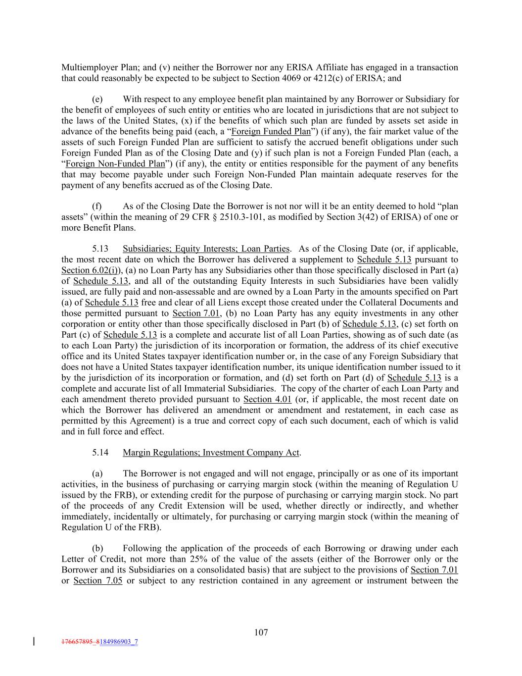 Multiemployer Plan; and (v) neither the Borrower nor any ERISA Affiliate has engaged in a transaction that could reasonably be expected to be subject to Section 4069 or 4212(c) of ERISA; and (e) With respect to any employee benefit plan maintained by any Borrower or Subsidiary for the benefit of employees of such entity or entities who are located in jurisdictions that are not subject to the laws of the United States, (x) if the benefits of which such plan are funded by assets set aside in advance of the benefits being paid (each, a “Foreign Funded Plan”) (if any), the fair market value of the assets of such Foreign Funded Plan are sufficient to satisfy the accrued benefit obligations under such Foreign Funded Plan as of the Closing Date and (y) if such plan is not a Foreign Funded Plan (each, a “Foreign Non-Funded Plan”) (if any), the entity or entities responsible for the payment of any benefits that may become payable under such Foreign Non-Funded Plan maintain adequate reserves for the payment of any benefits accrued as of the Closing Date. (f) As of the Closing Date the Borrower is not nor will it be an entity deemed to hold “plan assets” (within the meaning of 29 CFR § 2510.3-101, as modified by Section 3(42) of ERISA) of one or more Benefit Plans. 5.13 Subsidiaries; Equity Interests; Loan Parties. As of the Closing Date (or, if applicable, the most recent date on which the Borrower has delivered a supplement to Schedule 5.13 pursuant to Section 6.02(i)), (a) no Loan Party has any Subsidiaries other than those specifically disclosed in Part (a) of Schedule 5.13, and all of the outstanding Equity Interests in such Subsidiaries have been validly issued, are fully paid and non-assessable and are owned by a Loan Party in the amounts specified on Part (a) of Schedule 5.13 free and clear of all Liens except those created under the Collateral Documents and those permitted pursuant to Section 7.01, (b) no Loan Party has any equity investments in any other corporation or entity other than those specifically disclosed in Part (b) of Schedule 5.13, (c) set forth on Part (c) of Schedule 5.13 is a complete and accurate list of all Loan Parties, showing as of such date (as to each Loan Party) the jurisdiction of its incorporation or formation, the address of its chief executive office and its United States taxpayer identification number or, in the case of any Foreign Subsidiary that does not have a United States taxpayer identification number, its unique identification number issued to it by the jurisdiction of its incorporation or formation, and (d) set forth on Part (d) of Schedule 5.13 is a complete and accurate list of all Immaterial Subsidiaries. The copy of the charter of each Loan Party and each amendment thereto provided pursuant to Section 4.01 (or, if applicable, the most recent date on which the Borrower has delivered an amendment or amendment and restatement, in each case as permitted by this Agreement) is a true and correct copy of each such document, each of which is valid and in full force and effect. 5.14 Margin Regulations; Investment Company Act. (a) The Borrower is not engaged and will not engage, principally or as one of its important activities, in the business of purchasing or carrying margin stock (within the meaning of Regulation U issued by the FRB), or extending credit for the purpose of purchasing or carrying margin stock. No part of the proceeds of any Credit Extension will be used, whether directly or indirectly, and whether immediately, incidentally or ultimately, for purchasing or carrying margin stock (within the meaning of Regulation U of the FRB). (b) Following the application of the proceeds of each Borrowing or drawing under each Letter of Credit, not more than 25% of the value of the assets (either of the Borrower only or the Borrower and its Subsidiaries on a consolidated basis) that are subject to the provisions of Section 7.01 or Section 7.05 or subject to any restriction contained in any agreement or instrument between the 107 176657895_8184986903_7