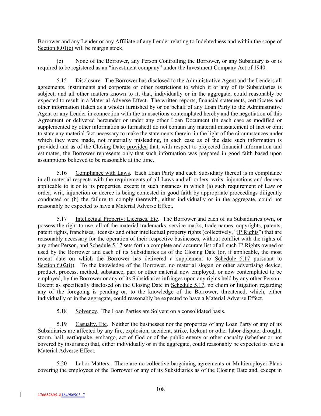 Borrower and any Lender or any Affiliate of any Lender relating to Indebtedness and within the scope of Section 8.01(e) will be margin stock. (c) None of the Borrower, any Person Controlling the Borrower, or any Subsidiary is or is required to be registered as an “investment company” under the Investment Company Act of 1940. 5.15 Disclosure. The Borrower has disclosed to the Administrative Agent and the Lenders all agreements, instruments and corporate or other restrictions to which it or any of its Subsidiaries is subject, and all other matters known to it, that, individually or in the aggregate, could reasonably be expected to result in a Material Adverse Effect. The written reports, financial statements, certificates and other information (taken as a whole) furnished by or on behalf of any Loan Party to the Administrative Agent or any Lender in connection with the transactions contemplated hereby and the negotiation of this Agreement or delivered hereunder or under any other Loan Document (in each case as modified or supplemented by other information so furnished) do not contain any material misstatement of fact or omit to state any material fact necessary to make the statements therein, in the light of the circumstances under which they were made, not materially misleading, in each case as of the date such information is provided and as of the Closing Date; provided that, with respect to projected financial information and estimates, the Borrower represents only that such information was prepared in good faith based upon assumptions believed to be reasonable at the time. 5.16 Compliance with Laws. Each Loan Party and each Subsidiary thereof is in compliance in all material respects with the requirements of all Laws and all orders, writs, injunctions and decrees applicable to it or to its properties, except in such instances in which (a) such requirement of Law or order, writ, injunction or decree is being contested in good faith by appropriate proceedings diligently conducted or (b) the failure to comply therewith, either individually or in the aggregate, could not reasonably be expected to have a Material Adverse Effect. 5.17 Intellectual Property; Licenses, Etc. The Borrower and each of its Subsidiaries own, or possess the right to use, all of the material trademarks, service marks, trade names, copyrights, patents, patent rights, franchises, licenses and other intellectual property rights (collectively, “IP Rights”) that are reasonably necessary for the operation of their respective businesses, without conflict with the rights of any other Person, and Schedule 5.17 sets forth a complete and accurate list of all such IP Rights owned or used by the Borrower and each of its Subsidiaries as of the Closing Date (or, if applicable, the most recent date on which the Borrower has delivered a supplement to Schedule 5.17 pursuant to Section 6.02(i)). To the knowledge of the Borrower, no material slogan or other advertising device, product, process, method, substance, part or other material now employed, or now contemplated to be employed, by the Borrower or any of its Subsidiaries infringes upon any rights held by any other Person. Except as specifically disclosed on the Closing Date in Schedule 5.17, no claim or litigation regarding any of the foregoing is pending or, to the knowledge of the Borrower, threatened, which, either individually or in the aggregate, could reasonably be expected to have a Material Adverse Effect. 5.18 Solvency. The Loan Parties are Solvent on a consolidated basis. 5.19 Casualty, Etc. Neither the businesses nor the properties of any Loan Party or any of its Subsidiaries are affected by any fire, explosion, accident, strike, lockout or other labor dispute, drought, storm, hail, earthquake, embargo, act of God or of the public enemy or other casualty (whether or not covered by insurance) that, either individually or in the aggregate, could reasonably be expected to have a Material Adverse Effect. 5.20 Labor Matters. There are no collective bargaining agreements or Multiemployer Plans covering the employees of the Borrower or any of its Subsidiaries as of the Closing Date and, except in 108 176657895_8184986903_7