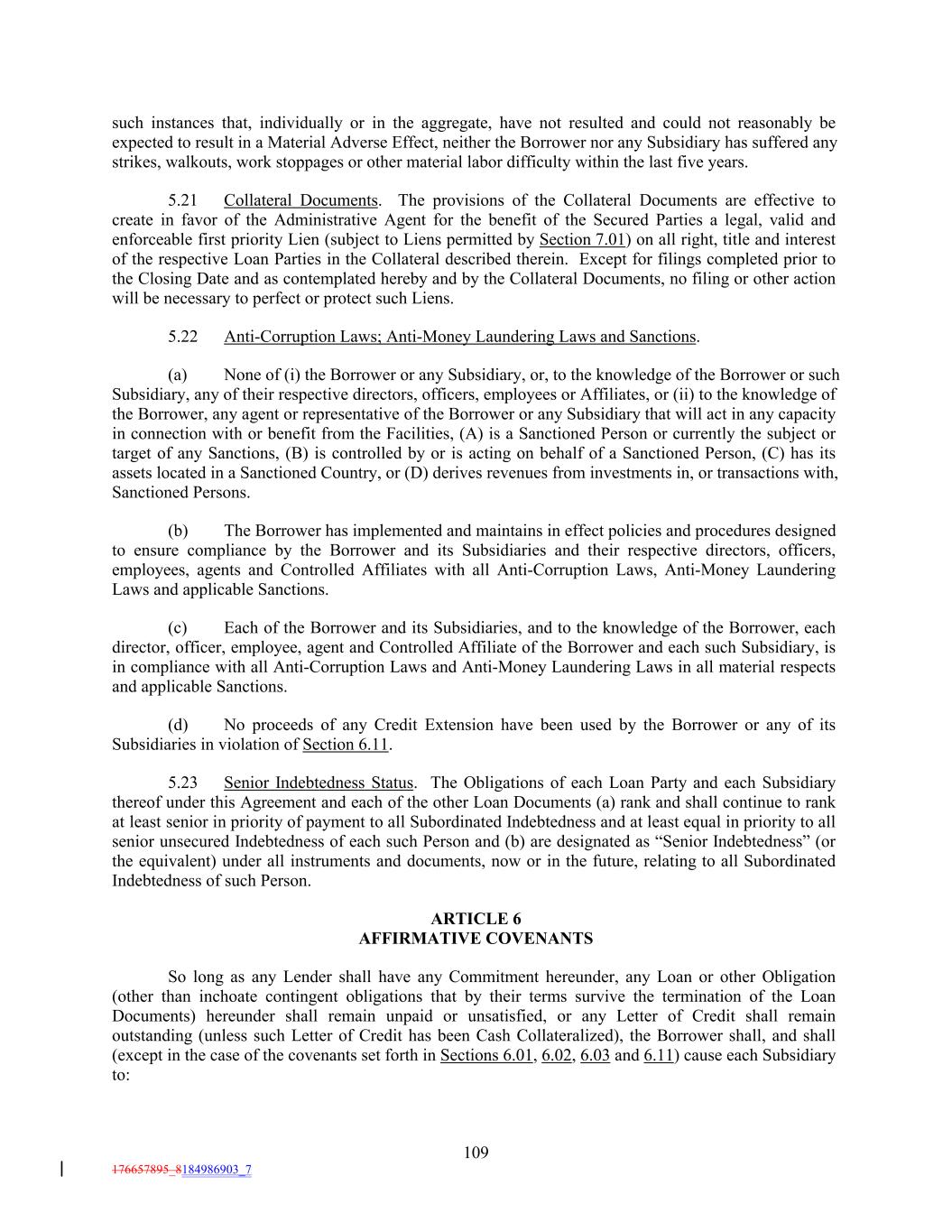 such instances that, individually or in the aggregate, have not resulted and could not reasonably be expected to result in a Material Adverse Effect, neither the Borrower nor any Subsidiary has suffered any strikes, walkouts, work stoppages or other material labor difficulty within the last five years. 5.21 Collateral Documents. The provisions of the Collateral Documents are effective to create in favor of the Administrative Agent for the benefit of the Secured Parties a legal, valid and enforceable first priority Lien (subject to Liens permitted by Section 7.01) on all right, title and interest of the respective Loan Parties in the Collateral described therein. Except for filings completed prior to the Closing Date and as contemplated hereby and by the Collateral Documents, no filing or other action will be necessary to perfect or protect such Liens. 5.22 Anti-Corruption Laws; Anti-Money Laundering Laws and Sanctions. (a) None of (i) the Borrower or any Subsidiary, or, to the knowledge of the Borrower or such Subsidiary, any of their respective directors, officers, employees or Affiliates, or (ii) to the knowledge of the Borrower, any agent or representative of the Borrower or any Subsidiary that will act in any capacity in connection with or benefit from the Facilities, (A) is a Sanctioned Person or currently the subject or target of any Sanctions, (B) is controlled by or is acting on behalf of a Sanctioned Person, (C) has its assets located in a Sanctioned Country, or (D) derives revenues from investments in, or transactions with, Sanctioned Persons. (b) The Borrower has implemented and maintains in effect policies and procedures designed to ensure compliance by the Borrower and its Subsidiaries and their respective directors, officers, employees, agents and Controlled Affiliates with all Anti-Corruption Laws, Anti-Money Laundering Laws and applicable Sanctions. (c) Each of the Borrower and its Subsidiaries, and to the knowledge of the Borrower, each director, officer, employee, agent and Controlled Affiliate of the Borrower and each such Subsidiary, is in compliance with all Anti-Corruption Laws and Anti-Money Laundering Laws in all material respects and applicable Sanctions. (d) No proceeds of any Credit Extension have been used by the Borrower or any of its Subsidiaries in violation of Section 6.11. 5.23 Senior Indebtedness Status. The Obligations of each Loan Party and each Subsidiary thereof under this Agreement and each of the other Loan Documents (a) rank and shall continue to rank at least senior in priority of payment to all Subordinated Indebtedness and at least equal in priority to all senior unsecured Indebtedness of each such Person and (b) are designated as “Senior Indebtedness” (or the equivalent) under all instruments and documents, now or in the future, relating to all Subordinated Indebtedness of such Person. ARTICLE 6 AFFIRMATIVE COVENANTS So long as any Lender shall have any Commitment hereunder, any Loan or other Obligation (other than inchoate contingent obligations that by their terms survive the termination of the Loan Documents) hereunder shall remain unpaid or unsatisfied, or any Letter of Credit shall remain outstanding (unless such Letter of Credit has been Cash Collateralized), the Borrower shall, and shall (except in the case of the covenants set forth in Sections 6.01, 6.02, 6.03 and 6.11) cause each Subsidiary to: 109 176657895_8184986903_7